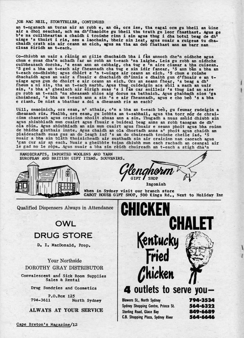 Published by Ronald Caplan on 1973/5/1 (703 reads)JOE MAC NEIL, STCMiYTELLBR, CONTINUED an t-oganach an turas air an robh e, an da, ors ise, tha eagal orm gu bheil an uine air a dhol seachad, ach ma dh*fhaoidte gu bheil thu trath gu leor fhasthast. Agus ge b*e na cuilbheartan a chaidh i troimhe rinn i sin agus thug i dha botul beag de dh* uisge ??s thuirt i ris, seo a laochain, bheir sin leat, agus nuair a ruigeas tu dha? chaidh crath sin air ceann an eich, agus ma tha an deb fhathast ann am barr nan cluas eiridh an t-each. Co-dhiubh an uair a rslinig an gille dhachaidh bha i fas anmoch dhe'n oidhche agus chum e suas dha*n achadh far an robh an t-each ??na laighe. Leis gu robh an oidhche cuibheasach dorcha, *s esan ann an cabhaig, cha tug e 'n aire ciamar a bha cuisean. *S ged a bha an t-each air fheannadh cha tug e sin idir fanear. *S ann ban a bha an t-each co-dhiubh; agus dhoirt e 'n t-uisge air ceann an eich. ??S chum e roimhe dhachaidh agus an uair a fhuair e dhachaidh dh'innis e dhaibh gun d??fhuair e an t- uisge agus gun do dhoirt e air ceann an eich. Ors an seann fhear, 's beag a dh' fheura a ni sin, tha an t-each marbh. Agus thug cuideigin aca suil a mach an uair sin, 's bha a' ghealach air eirigh suas ??s i fas car soilleir 's thug iad an aire gu robh an t-each ??na sheasamh shios aig dorus na bathaich. Agus ghabhadh sios *ga choimhead, 's bha an t-each ann a sin 's e air fheannadh, agus e cho beo 's a bha e riamh. De nist a bhathar a dol a dheanamh ris an each? Uill, smaoinich, ors esan, m' athair, o'n a bha an t-each beo, gu feumar rudeigin a dheanamh ris. Fhalbh, ors esan, gu lobhta an t-sabhail, agus tha torr mor de chrai- cinn chaorach agus craicinn rahoilt shuas ann a sin. Thugadh a nuas smuid dhiubh sin agus shiubhladh mim cuairt agus fhuair e buideal beag anns an robh taosgan de dh* ola roin. Agus shiubhladh an sin mun cuairt agus fhuair e seann phoit agus bha roinn de bhidhe giuthais innte. Agus chaidh an ola dhortadh anns a' phoit agus chaidh am plaideachadh suas |us an do leagh iad 's an do chuireadh troimhe cheile iad. 'S nuair a bha sin blath thoisicheadh air suathadh sin air craicinn nan caorach agus 'gan cur air an each. Nuair a gheibhte toinn dhiubh mun each rachadh an ceangal air le gad no le ropa. Agus nuair a bha sin reidh chuireadh an t-each a stigh dha'n HANDICRAFTS, IMPORTED WOOLENS AND YARN EUROPEAN AND BRITISH GIFT ITEMS. SOUVENIRS. / GIFT / SHOP / y Ingonish When in Sydney visit our branch store CABOT HOUSE GIFT SHOP, 500 Kings Rd., Next to Holiday Inr Qualified Dispensers Always in Attendance OWL DRUG STORE D. I. MacDonald, Prop. Your Northside DOROTHY GRAY DISTRIBUTOR Convalescent and Sick Room Supplies Sales & Rental Drug Sundries and Cosmetics P.O.Box 125 794-3611 North Sydney ALWAYS AT YOUR SERVICE Cape Breton*s Maga2ine/l2 CHICKEN CHALET fried 4 outlets to serve you- Blowers SL, North Sydney. Sydney Shopping Centre, Prince St Sterling Road, Glace Bay CB. Shopping Plaza, Sydney River 794-3534 564-6322 849-6689 564-6646