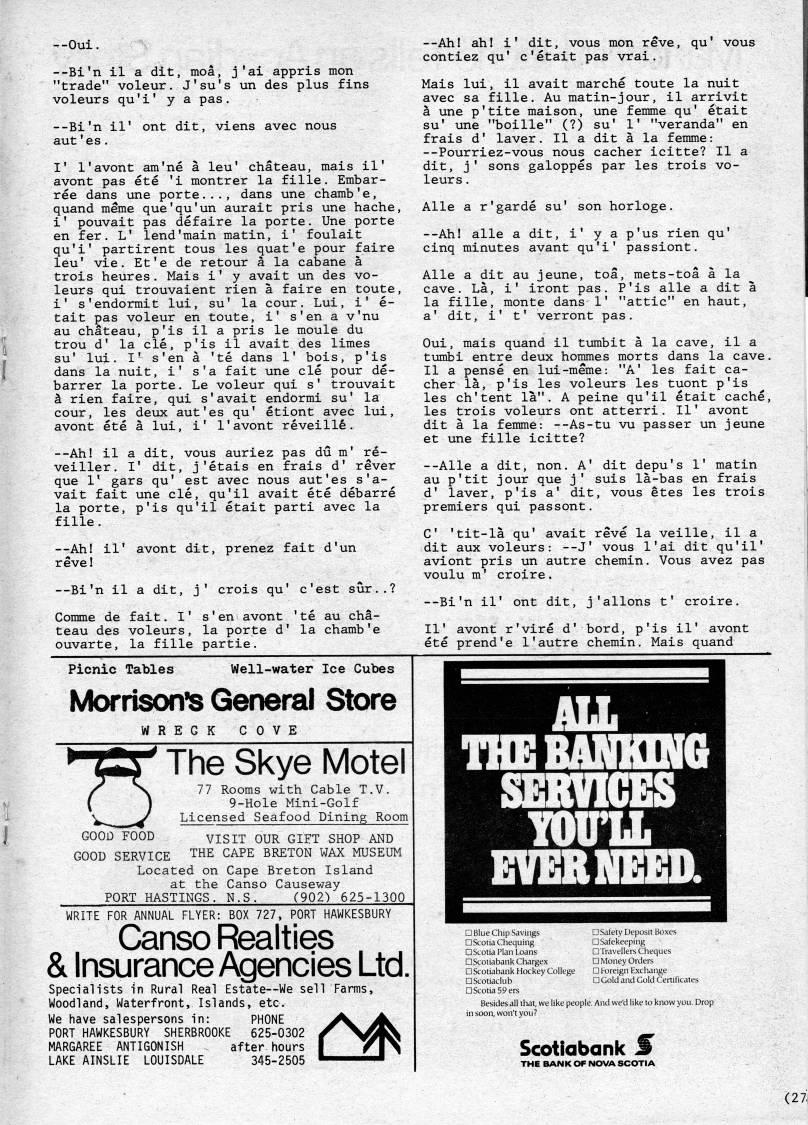 Published by Ronald Caplan on 1980/6/1 (307 reads)--Oui. --Bi'n il a dit, moa, j'ai appris mon "trade" voleur. J'su's un des plus fins voleurs qu'i' y a pas. --Bi'n il' ont dit, viens avec nous aut'es. I' 1'avont am'ne a leu' chateau, mais il' avont pas ete 'i montrer la fille. Embar- ree dans une porte.