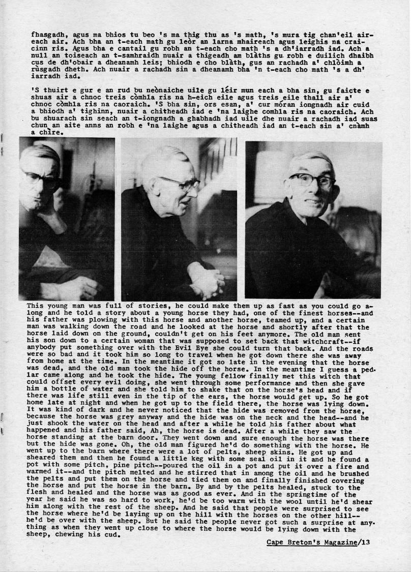 Published by Ronald Caplan on 1973/5/1 (791 reads)fhasgadh, agus ma bhios tu beo *s ma thig thu as 's math, ??s mura tig chan'eil air- each air. Ach bha an t-each math gu le'r an lama mhaireach agus leig his na crai? cinn ris. Agus bha e cantail gu robh an t-each cho math 's a dh*iarradh iad. Ach a null an toiseach an t-samuhraidh nuair a thigeadh am births gu robh e duilich dhaibh cus de dh*obair a dheanamh leis; bhiodh e cho blath, gus an rachadh a* chloimh a rusgadh dheth. Ach nuair a rachadh sin a dheanamh bha *n t-each cho math *s a dh* iarradh iad. *S thuirt e gur e an rud bu nebnaiche uile gu leir mim each a bha sin, gu faicte e shuas air a chnoc treis comhla ris na h-eich eile agus treis'eile thall air a* chnoc cbmhla ris na caoraich. ??S bha sin, ors esan, a* cur moran iongnadh air cuid a bhiodh a* tighinn, nuair a chitheadh iad e 'na laighe comhla ris na caoraich. Ach bu shuarach sin seach an t-iongnadh a ghabhadh iad uile dhe nuair a rachadh iad suas Chun an aite anns an robh e *na laighe agus a chitheadh iad an t-each sin a* cn'h a chire. This young man was full of stories, he could make them up as fast as you could go a- long and he told a story about a young horse they had, one of the finest horses • and his father was plowing with this liorse and another horse, teamed up, and a certain man was walking down the road and he looked at the horse and shortly after that the horse laid down on the ground, couldn't get on his feet anymore. The old man sent his son down to a certain woman that was supposed to set back that witchcraft • if anybody put something over with the Evil Bye she could turn that back. And the roads were so bad and it took him so long to travel when he got down there she was away from home at the time. In the meantime it got so late in the evening that the horse was dead, and the old man took the hide off the horse. In the meantime I guess a ped? lar came along and he took the hide. The young fellow finally met this witch that could offset every evil doing, she went through some performance and then she gave him a bottle of water and she told him to shake that on the horse's head and if there was life still even in the tip of the ears, the horse would get up. So he got home late at night and when he got up to the field there, the horse was lying down. It was kind of dark and he never noticed that the hide was removed from the horse, because the horse was grey anyway and the hide was on the neck and the head • and he just shook the water on the head and after a while he told his father about what happened and his father said. Ah, the horse is dead. After a while they saw the horse standing at the barn door. They went down and sure enough the horse was there but the hide was gone. Oh, the old man figured he*d do something with the horse. He went up to the barn where there were a lot of pelts, sheep skins. He got up and sheared them and then he found a little keg with some seal oil in it and he found a pot with some pitch, pine pitch • poured the oil in a pot and put it over a fire and warmed it • and the pitch melted and he stirred that in among the oil and he brushed the pelts and put them on the horse and tied them on and finally finished covering the horse and put the horse in the barn. By and by the pelts healed, stuck to the flesh and healed and the horse was as good as ever. And in the springtime of the year he said he was so hard to work, he'd be too warm with the wool until he??d shear him along with the rest of the sheep. And he said that people were surprised to see the horse where he??d be laying up on the hill with the horses on the other hill • he'd be over with the sheep. But he said the people never got such a surprise at any- thing as when they went up close to where the horse would be lying down with the sheep, chewing his cud. Cape Breton's Magazine/l3