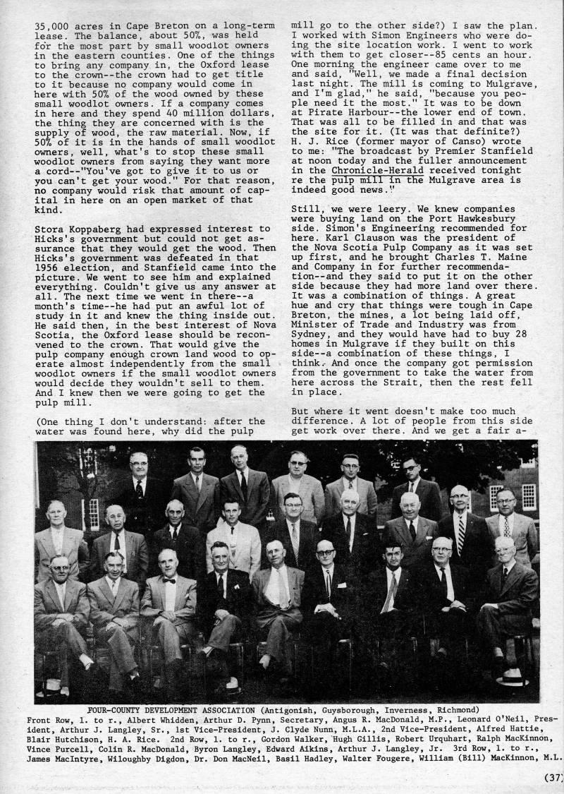 Published by Ronald Caplan on 1980/6/1 (404 reads)35,000 acres in Cape Breton on a long-term lease. The balance, about 50%, was held foV the most part by small woodlot owners in the eastern counties. One of the things to bring any company in, the Oxford lease to the crown--the crown had to get title to it because no company would come in here with 50% of the wood owned by these small woodlot owners. If a company comes in here and they spend 40 million dollars, the thing they are concerned with is the supply of wood, the raw material. Now, if 507o of it is in the hands of small woodlot owners, well, what's to stop these small woodlot owners from saying they want more a cord--"You've got to give it to us or you can't get your wood." For that reason, no company would risk that amount of cap? ital in here on an open market of that kind. Stora Koppaberg had expressed interest to Hicks's government but could not get as? surance that they would get the wood. Then Hicks's government was defeated in that 1956 election, and Stanfield came into the picture. We went to see him and explained everything. Couldn't give us any answer at all. The next time we went in there--a month's time--he had put an awful lot of study in it and knew the thing inside out. He said then, in the best interest of Nova Scotia, the Oxford lease should be recon? vened to the crown. That would give the pulp company enough crown land wood to op? erate almost independently from the small woodlot owners if the small woodlot owners would decide they wouldn't sell to them. And I knew then we were going to get the pulp mill, (One thing I don't understand: after the water was found here, why did the pulp mill go to the other side?) I saw the plan, I worked with Simon Engineers who were do? ing the site location work. I went to work with them to get closer--85 cents an hour. One morning the engineer came over to me and said, "Well, we made a final decision last night. The mill is coming to Mulgrave, and I'm glad," he said, "because you peo? ple need it the most." It was to be down at Pirate Harbour--the lower end of town. That was all to be filled in and that was the site for it. (It was that definite?) H. J. Rice (former mayor of Canso) wrote to me: "The broadcast by Premier Stanfield at noon today and the fuller announcement in the Chronicle-Herald received tonight re the pulp mill in the Mulgrave area is indeed good news . ??' Still, we were leery. We knew companies were buying land on the Port Hawkesbury side. Simon's Engineering recommended for here. Karl Clauson was the president of the Nova Scotia Pulp Company as it was set up first, and he brought Charles T. Maine and Company in for further recommenda? tion • and they said to put it on the other side because they had more land over there. It was a combination of things. A great hue and cry that things were tough in Cape Breton, the mines, a lot being laid off. Minister of Trade and Industry was from Sydney, and they would have had to buy 28 homes in Mulgrave if they built on this side--a combination of these things, I think.- And once the company got permission from the government to take the water from here across the Strait, then the rest fell in place. But where it went doesn't make too much difference. A lot of people from this side get work over there. And we get a fair a- JOUR-COUNTY DEVELOPMENT ASSOCIATION (Antigonish, Guysborough, Inverness, Richmond) Front Row, 1. to r., Albert Whidden, Arthur D. Pynn, Secretary, Angus R. MacDonald, M.P., Leonard O'Neil, Pres? ident, Arthur J. Langley, Sr., 1st Vice-President, J. Clyde Nunn, M.L.A., 2nd Vice-President, Alfred Hattie, Blair Hutchison, H. A. Rice. 2nd Row, 1. to r., Gordon Walker, Hugh Gillis, Robert Urquhart, Ralph MacKinnon, Vince Purcell, Colin R. MacDonald, Byron Langley, Edward Aikins, Arthur J. Langley, Jr. 3rd Row, 1. to r., James Maclntyre, Wiloughby Digdon, Dr. Don MacNeil, Basil Hadley, Walter Fougere, William (Bill) MacKinnon, M.L. (37: