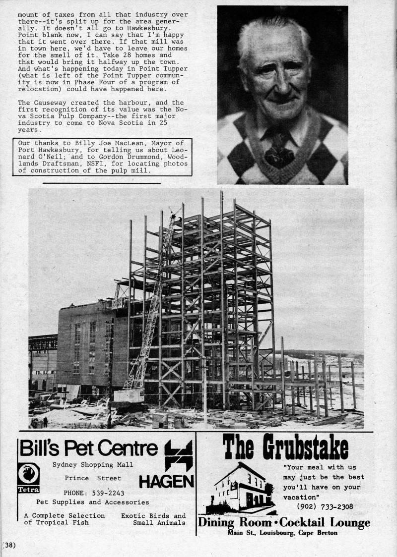 Published by Ronald Caplan on 1980/6/1 (396 reads)mount of taxes from all that industry over there--it's split up for the area gener? ally. It doesn't all go to Hawkesbury. Point blank now, I can say that I'm happy that it went over there. If that mill was in town here, we'd have to leave our homes for the smell of it. Take 28 homes and that would bring it halfway up the town. And what's happening today in Point Tupper (what is left of the Point Tupper commun? ity is now in Phase Four of a program of relocation) could have happened here, The Causeway created the harbour, and the first recognition of its value was the No? va Scotia Pulp Company--the first major industry to come to Nova Scotia in 25 years. Our thanks to Billy Joe MacLean, Mayor of Port Hawkesbury, for telling us about Leo? nard O'Neil; and to Gordon Drummond, Wood? lands Draftsman, NSFI, for locating photos of construction of the pulp mill. Bill's Pet Centre' HAGEN Sydney Shopping Mall Prince Street 25B3 PHONE: 539-2243 Pet Supplies and Accessories A Complete Selection of Tropical Fish Exotic Birds and Small Animals The Grnbstake "Your meal with us may just be the best you'll have on your vacation" (902) 733-2308 Dining Room*Cocktail Lounge Main St., Louisbourg, Gape Breton :38)