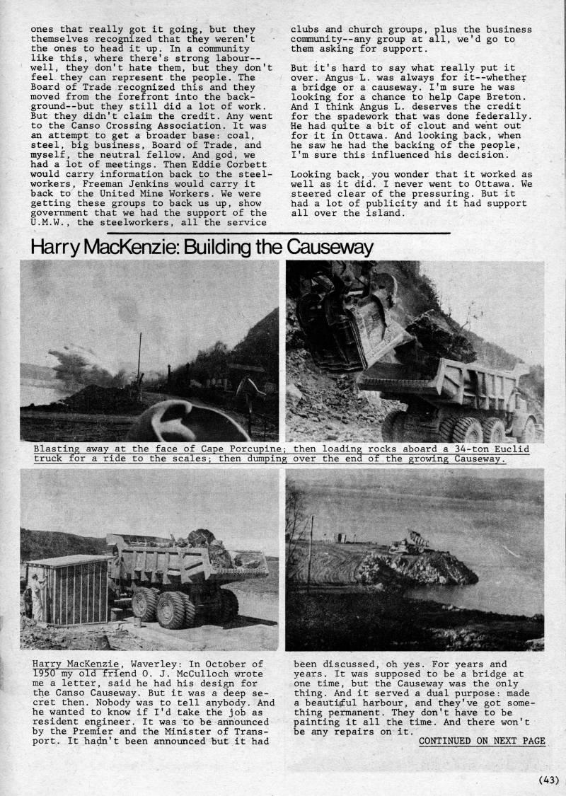 Published by Ronald Caplan on 1980/6/1 (467 reads)ones that really got it going, but they themselves recognized that they weren't the ones to head it up. In a community like this, where there's strong labour-- well, they don't hate them, but they don't feel they can represent the people. The Board of Trade recognized this and they moved from the forefront into the back- ground--but they still did a lot of work. But they didn't claim the credit. Any went to the Canso Crossing Association. It was an attempt to get a broader base: coal, steel, big business. Board of Trade, and myself, the neutral fellow. And god, we had a lot of meetings. Then Eddie Corbett would carry information back to the steel? workers , Freeman Jenkins would carry it back to the United Mine Workers. We were getting these groups to back us up, show government that we had the support of the U.M.W., the steelworkers, all the service clubs and church groups, plus the business community--any group at all, we'd go to them asking for support, But it's hard to say what really put it over, Angus L, was always for it • whether a bridge or a causeway. I'm sure he was looking for a chance to help Cape Breton. And I think Angus L. deserves the credit for the spadework that was done federally. He had quite a bit of clout and went out for it in Ottawa. And looking back, when he saw he had the backing of the people, I'm sure this influenced his decision. Looking back, you wonder that it worked as well as it did. I never went to Ottawa. We steered clear of the pressuring. But it had a lot of publicity and it had support all over the island. Harry MacKenzie: Building the Causeway Blasting away at the face of Cape Porcupine; then loading rocks aboard a 34-ton Euclid truck for a ride to the scales; then dumping over the end of the growing Causeway. Harry MacKenzie, Waverley: In October of 1950 my old friend 0. J. McCulloch wrote me a letter, said he had his design for the Canso Causeway. But it was a deep se? cret then. Nobody was to tell anybody. And he wanted to know if I'd take the job as resident engineer. It was to be announced by the Premier and the Minister of Trans? port. It hadn't been announced but it had been discussed, oh yes. For years and years. It was supposed to be a bridge at one time, but the Causeway was the only thing. And it served a dual purpose: made a beautiful harbour, and they've got some? thing permanent. They don't have to be painting it all the time. And there won't be any repairs on it. CONTINUED ON NEXT PAGE (43)
