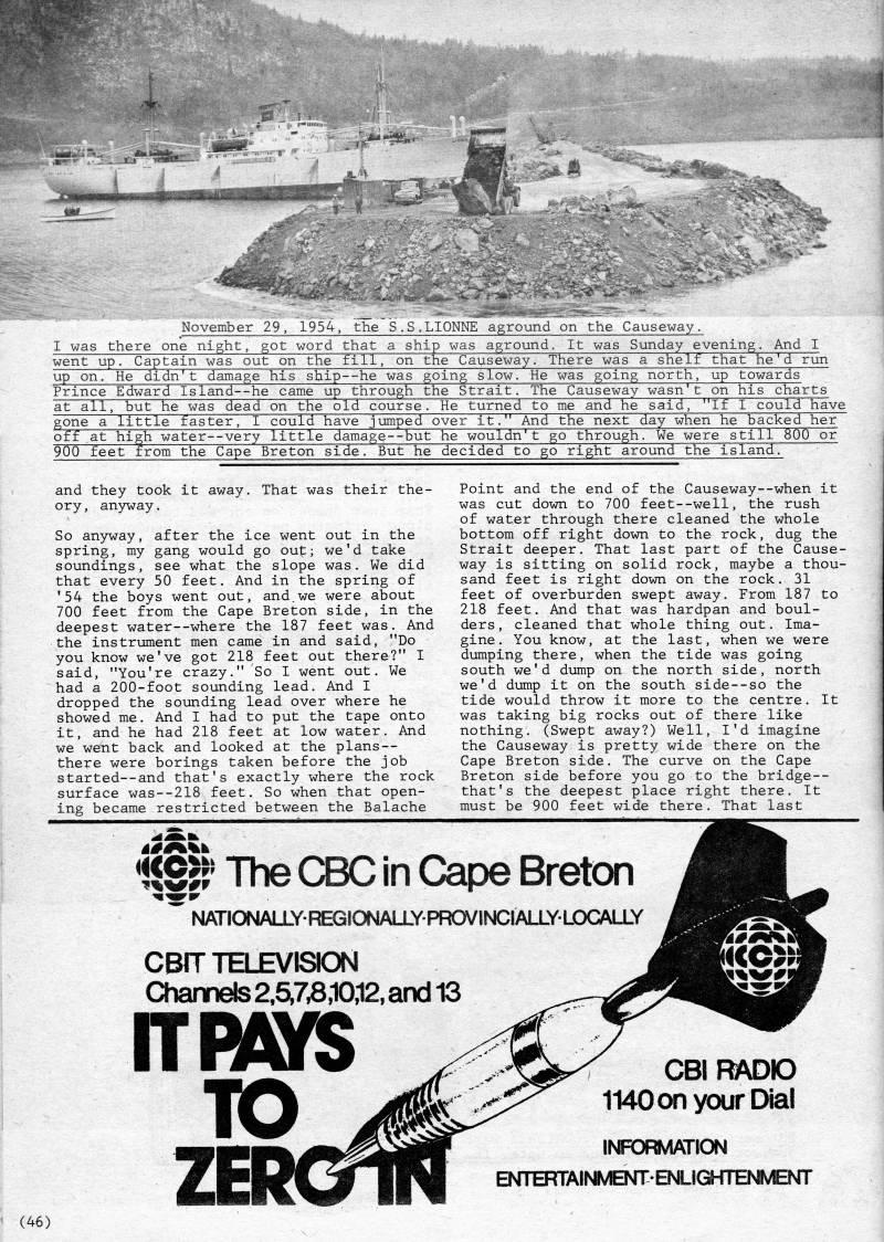 Published by Ronald Caplan on 1980/6/1 (371 reads)'m- November 29, 1954, I was there one night, got word that a ship was aground. It was Sunday evening, And I went up. Captain was out on the fill, on the Causeway. There was a shelf that he'd run up on. He didn't damage his ship--he was going slow. He was going north, up towards Prince Edward Island--he came up through the Strait. The Causeway wasn't on his ch??rts at all, but he was dead on the old course. He turned to me and he said, "If I could have gone a little faster, I could have jumped over it." And the next day when he backed her off at high water • very little damage--but he wouldn't go through. We were still 800 or 900 feet from the Cape Breton side. But he decided to go right around the island. and they took it away. That was their the? ory , an5rway, So anyway, after the ice went out in the spring, my gang would go out; we'd take soundings, see what the slope was. We did that every 50 feet, And in the spring of '54 the boys went out, and.we were about 700 feet from the Cape Breton side, in the deepest water--where the 187 feet was. And the instrument men came in and said, "Do you know we've got 218 feet out there?" I said, "You're crazy," So I went out. We had a 200-foot sounding lead. And I dropped the sounding lead over where he showed me. And I had to put the tape onto it, and he had 218 feet at low water. And we went back and looked at the plans • there were borings taken before the job started • and that's exactly where the rock surface was--218 feet. So when that open? ing became restricted between the Balache Point and the end of the Causeway--when it was cut down to 700 feet--well, the rush of water through there cleaned the whole bottom off right down to the rock, dug the Strait deeper. That last part of the Cause? way is sitting on solid rock, maybe a thou? sand feet is right down on the rock, 31 feet of overburden swept away. From 187 to 218 feet. And that was hardpan and boul? ders , cleaned that whole thing out, Ima? gine , You know, at the last, when we were dumping there, when the tide was going south we'd dump on the north side, north we'd dump it on the south side--so the tide would throw it more to the centre. It was taking big rocks out of there like nothing. (Swept away?) Well, I'd imagine the Causeway is pretty wide there on the Cape Breton side. The curve on the Cape Breton side before you go to the bridge-- that's the deepest place right there. It must be 900 feet wide there. That last g0i'. k 118Jr The CeD In Cape Breton NATIONAUyFe3IONALLYPROVII?;iALLYLOCAU.Y CBIT TELEVISION Channels 2,5'73,10,12, and 13 IT Mrs TO ZEI CBI RADIO 1140 on your Dial INFORMATION ENTEFrrAINMENTENLIGHTENMENT (46)