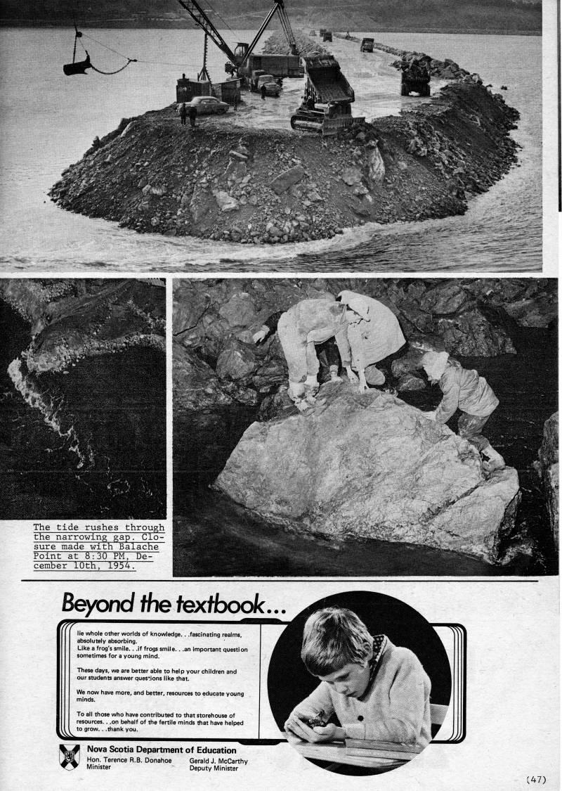Published by Ronald Caplan on 1980/6/1 (411 reads)The tide rushes through the narrowing gap. Clo? sure made with Balache Point at 8:30 PM, De? cember 10th, 1954~ Beyond ihe fexffoook w whole other worlds of knowledge.. .fascinating realms, absolutely absorbing. Lilce a frog's smile.. .if frogs smile.. .an important question sometimes for a young mind. These days, we are better able to help your children and our students answer questions like that. We now have more, and better, r minds. >urces to educate young V' To all those who have contributed to that storehouse of resources.. .on behalf of the fertile minds that have helped I grow.. .ttiank you. Nova Scotia Department of Education Hon. Terence R.B. Donahoe Gerald J. McCarthy (47)
