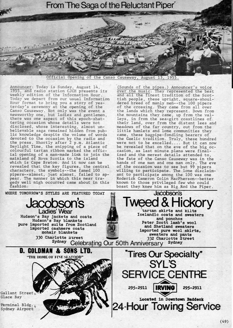 Published by Ronald Caplan on 1980/6/1 (1049 reads)From The Saga of the Reluctant Piper' Announcer: Today is Sunday, August 14, 1955, and radio station CJCH presents its weekly edition of the Information Hour, Today we depart from our usual Information Hour format to bring you a story of yes? terday's ceremony at the opening of the Canso Causeway, Not only was the event a newsworthy one, but ladies and gentlemen, there was one aspect of this epoch-shat? tering occasion whose details were not disclosed, whose interesting, almost un? believable saga remained hidden from pub? lic knowledge despite the volume of words devoted to the occasion by the radio and the press. Shortly after 2 p,m, Atlantic Daylight Time, the snipping of a piece of colourful tartan ribbon marked the offic? ial opening of a man-made link to join the mainland of Nova Scotia to the island which is Cape Breton, And it now can be revealed that the key figures, the central characters, the symbols--the famed 100 pipers,--almost, just almost, failed to ap? pear. The manner in which this near tra? gedy well nigh occurred came about in this fashion: (Sounds of the pipes.) Announcer's voice over the music: They represented the best and all the finest tradition of the Scot? tish people, these upright, square-shoul? dered breed of manly men--the 100 pipers of the crossing. They came from all over the lands which they represent. Down from the mountains they came, up from the val? leys, in from the sea-girt coastlines of their land, over from the distant lees and meadows of the far country, out from the little hamlets and lone communities they came, these bagpipe-fondling bearers of the Gaelic tradition. Truly, these hundred were not to be excelled,.,, But it can now be revealed that on the eve of the big oc? casion, as last minute plans were final? ized and the merest details attended to, the fate of the Canso Causeway was in the hands of one man and one man only. The eve of the occasion was to see but 99 pipers willing to participate. The lone disclaim- ant to participate among the 100 was one Roderick Cameron Colin MacPherson--better known to those privileged few who could boast they knew him as Big Rod the Piper. WHERE TOMORROWS STYLES ARE FEATURED TODAY Jacobson's Ladies' Wear Hudson's Bay jackets and coats Hudson's Bay blankets pure imported suits from Scotland imported cashmere coats mohair blankets 330 Charlotte Sxreet Jacobson's Tw?ed& Hickory tarxan skirts and kilts Icelandic coats and sweaters and ponchos lacobsoift Peter Scott lamb's wool ;'|fl and Shetland sweaters ""' imported pure wool skirts, sweaters and pants '1 • iir-i'* 332 Charlotte Street Sydney Celebrating Our 50th Anniversary 'y''y GOLDMAN & SONS LTD. Tilt HOME OK KINK SKAjOOP" 'Gallant Street Glace Bay Terminal Bldg Sydney Airpor "Tires Our Specialty' SYL'S SERVICECENTRE 295-2911 [jRViNO] 295-2911 Located in Downtown Bftddeck 24-Hour Towing Service (49)