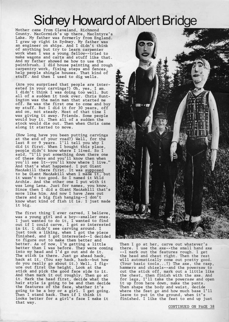 Published by Ronald Caplan on 1980/8/1 (772 reads)Sidney Howard of Albert Bridge Mother came from Cleveland, Richmond County. MacCormick's up there, Maclntyre's. Lake. My father was formerly from England. I grew up right in Sydney. My father was an engineer on ships. And I didn't think of anything but try to learn carpenter work when I was a young fellow • tried to make wagons and carts and stuff like that. And my father showed me how to use the paintbrush. I did house painting and rough carpentry work, fixing steps and fences, help people shingle houses. That kind of stuff. And then I used to dig wells. (Are you surprised that people are inter? ested in your carvings?) Oh, yes, I am. I didn't think I was doing too well. But all of a sudden it took over. Chris Hunt? ington was the main man that started me off. He was the first one to come and buy my stuff. But I did it for 30 years, off and on, not steady. Most of that time I was giving it away. Friends. Some people would buy it. Then all of a sudden the stock would die out. Then when Chris came along it started to move. (How long have you been putting carvings at the end of your road?) Well, for the last 8 or 9 years. I'll tell you why I did it first. When I bought this place, people didn't know where I lived. So I said, "I'll put something down there one of these days and you'll know then when you'll see it--you'11 know where I live." And that's what happened. I put Giant MacAskill there first. It was supposed to be Giant MacAskill when I made it, but it wasn't too good. So I named it Wild Archie. And the other one I put with it was Long Lena. Just for names, you know. Since then I did a Giant MacAskill that's more like him. And now I have Jaws out there and a big fish hanging--I don't know what kind of fish it is. I just made it big. The first thing I ever carved, I believe, was a young girl and a boy--smaller ones. I just wanted to do it, I wanted to find out if I could carve, I got so interested in it. I didn't see carving around. I just took a liking, when I got the piece finished, and I got interested--I decided to figure out to make them better and better. As of now, I'm getting a little better than I was before. They were coming into my head and I'd go out and do it. The stick is there. Just go ahead hack, hack at it. (You say hack, hack--but how do you really go about it.) Well, I fig? ure out first the height. Look at the stick and pick the good face side to it. And then mark it out roughly. Then go at it. Mark the head first, decide what the hair style is going to be and then decide the features of the face, whether it's going to be a boy or a girl. I get going. Then I stand back. Then if I think it looks better for a girl's face I make it that way. Then I go at her, carve out whatever's there. I use the axe--the small hand axe --I mark out the features rough. I get the head and chest right. Then the rest will automatically come out pretty good. (Your basic tools...?) The axe, the rasp, hammers and chisels • and the powersaw to cut the stick off, mark out a little like the chest, then finish with the axe. And for legs, I'll take the powersaw and open it up from here down, make the pants. Then shape the body and waist, decide where the feet go and how much base I'll leave to put in the ground, when it's finished. I like the feet to end up just