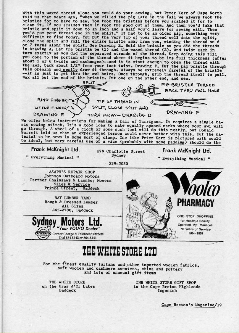 Published by Ronald Caplan on 1973/5/1 (745 reads)With this waxed thread alone you could do your sewing, but Peter Kerr of Cape North told us that years ago, "when we killed the pig late in the fall we always took the bristles for to have to sew. You took the bristles before you scalded it for to clean it. If you scalded them it took the good out of them. And then you'd take that bristle and split it down to an inch and a half you'd leave for sewing with. Then you'd put your thread end in the split." It had to be an older pig, something very difficult to find today. You put the very tip of your thread well into the split, close the split and roll the entire bristle away from you, winding the thread on 6 or 7 turns along the split. See Drawing E. Hold the bristle as you did the threads in Drawing A. Let the bristle be (1) and the waxed thread (2). And twist each in turn exactly as you did the separated strands of the thread. Keep doing this till you come to the portion of the. thread where it begins to be its full thickness (after about 5 or 6 twists and exchanges) • and it is stout enough to open the thread with the awl, back about 1/2" from your last twist. Drawing F. Put the pig bristle through this opening and gently draw it through. Always be extremely careful of the bristle • it is just to get thru the awl holes. Once through, grip the thread itself to pull. Wax all but the end of the bristle. Put one on the other end, and sew. -Dt'AWlNG- F T P CiF THREAD INl