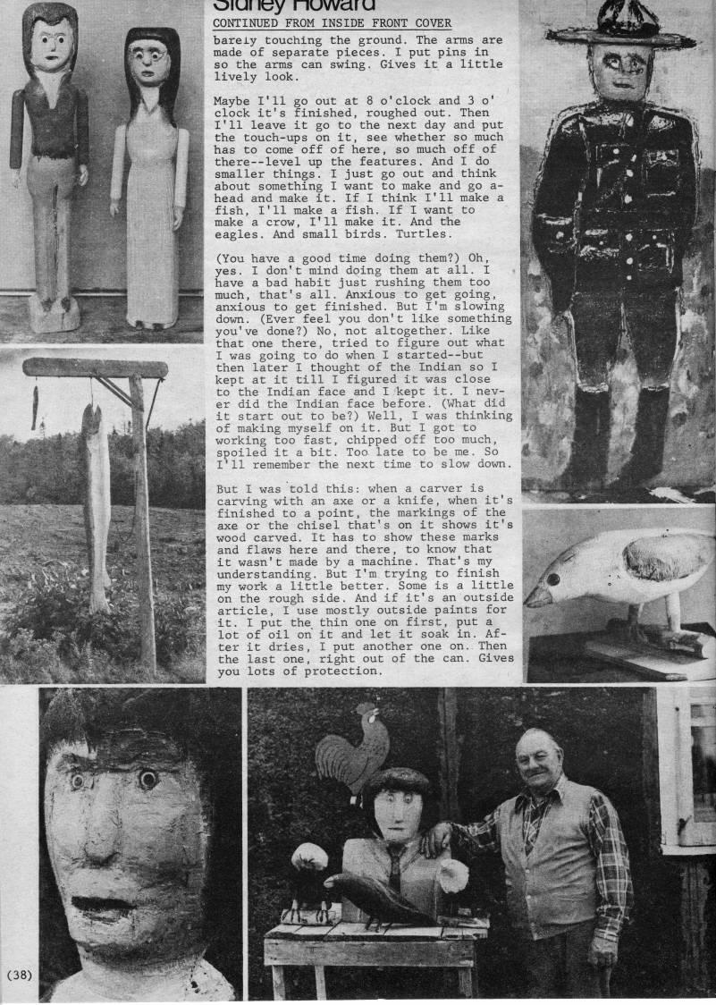 Published by Ronald Caplan on 1980/8/1 (285 reads)oiUMt'y nuwciru CONTINUED FROM INSIDE FRONT COVER barely touching the ground. The arms are made of separate pieces. I put pins in so the arms can swing. Gives it a little lively look. Maybe I'll go out at 8 o'clock and 3 o' clock it's finished, roughed out. Then I'11 leave it go to the next day and put the touch-ups on it, see whether so much has to come off of here, so much off of there • level up the features. And I do smaller things. I just go out and think about something I want to make and go a- head and make it. If I think I'll make a fish, I'll make a fish. If I want to make a crow, I'll make it. And the eagles. And small birds. Turtles. (You have a good time doing them?) Oh, yes. I don't mind doing them at all. I have a bad habit just rushing them too much, that's all. Anxious to get going, anxious to get finished. But I'm slowing down. (Ever feel you don't like something you've done?) No, not altogether. Like that one there, tried to figure out what I was going to do when I started • but then later I thought of the Indian so I kept at it till I figured it was close to the Indian face and I kept it, I nev? er did the Indian face before. (What did it start out to be?) Well, I was thinking of making myself on it. But I got to working too fast, chipped off too much, spoiled it a bit. Too late to be me. So I'll remember the next time to slow down. But I was told this: when a carver is carving with an axe or a knife, when it's finished to a point, the markings of the axe or the chisel that's on it shows it's wood carved. It has to show these marks and flaws here and there, to know that it wasn't made by a machine. That's my understanding. But I'm trying to finish my work a little better. Some is a little on the rough side. And if it's an outside article, I use mostly outside paints for it. I put the thin one on first, put a lot of oil on it and let it soak in. Af? ter it dries, I put another one on.. Then the last one, right out of the can. Gives you lots of protection. (38) I WJ' ''i :'#' -''''i' i .li *-'*';* J&S2;%' ??,?'' t' ift ?? 1 : i: