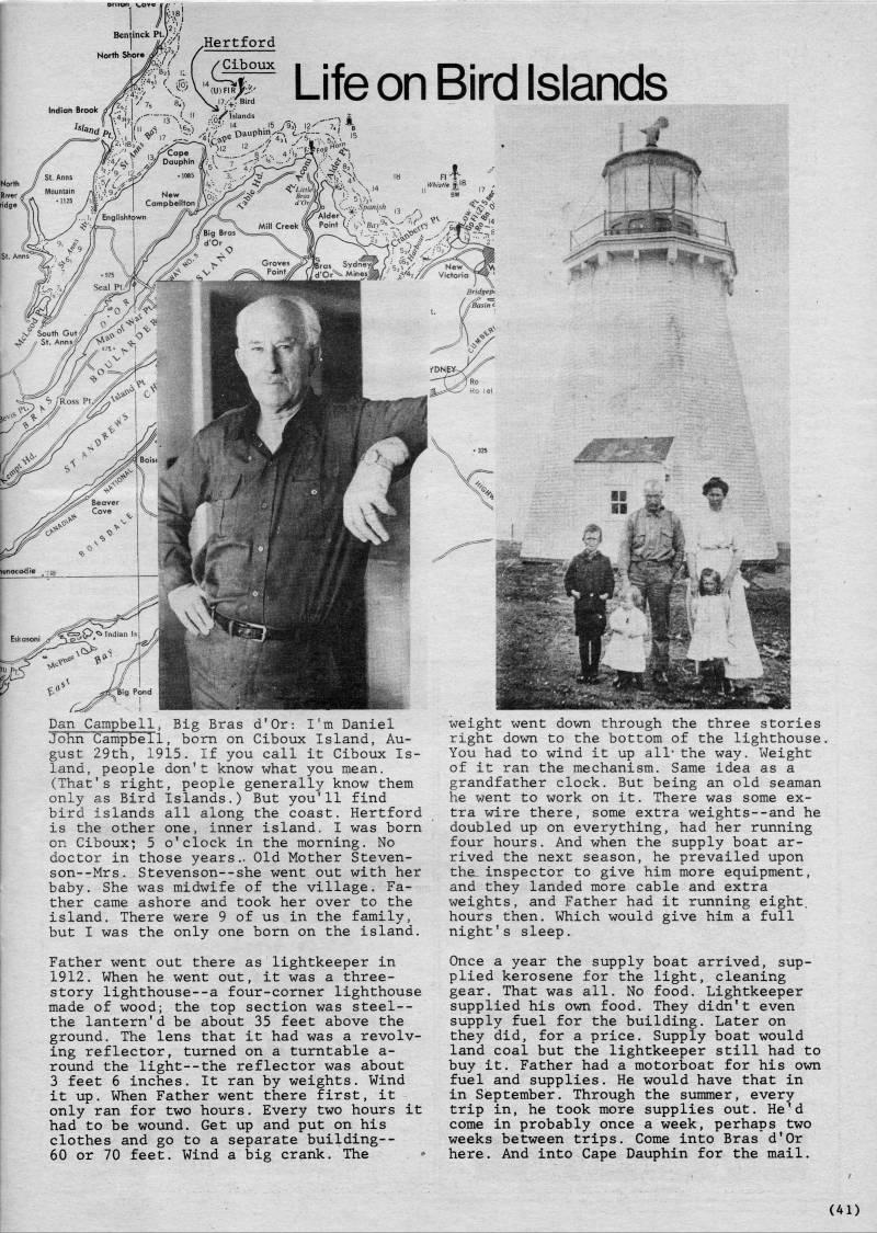 Published by Ronald Caplan on 1980/8/1 (789 reads)n"'7K Hertford Ciboux ST Life on Bird Islands Dan Campbell, d'Or: I'm Daniel John Campbell, Dorn on Ciboux Island, Au? gust 29th, 1915. If you call it Ciboux Is? land, people don't know what you mean. (That's right, people generally know them only as Bird Islands.) But you'll find bird islands all along the coast. Hertford is the other one, inner island. I was born on Ciboux* 5 o'clock in the morning. No doctor in those years.. Old Mother Steven- son--Mrs. Stevenson--she went out with her baby. She was midwife of the village. Fa? ther came ashore and took her over to the island. There were 9 of us in the family, but I was the only one born on the island. Father went out there as lightkeeper in 1912. When he went out, it was a three- story lighthouse--a four-corner lighthouse made of wood; the top section was steel-- the lantern'd be about 35 feet above the ground. The lens that it had was a revolv? ing reflector, turned on a turntable a- round the light--the reflector was about 3 feet 6 inches. It ran by weights. Wind it up. When Father went there first, it only ran for two hours. Every two hours it had to be wound. Get up and put on his clothes and go to a separate building-- 60 or 70 feet. Wind a big crank. The weight went down through the three stories right down to the bottom of the lighthouse. You had to wind it up all- the way. Weight of it ran the mechanism. Same idea as a grandfather clock. But being an old seaman he went to work on it. There was some ex? tra wire there, some extra weights--and he doubled up on everything, had her running four hours. And when the supply boat ar? rived the next season, he prevailed upon the. inspector to give him more equipment, and they landed more cable and extra weights, and Father had it running eight, hours then. Which would give him a full night's sleep. Once a year the supply boat arrived, sup? plied kerosene for the light, cleaning gear. That was all. No food. Lightkeeper supplied his own food. They didn't even supply fuel for the building. Later on they did, for a price. Supply boat would land coal but the lightkeeper still had to buy it. Father had a motorboat for his own fuel and supplies. He would have that in in September. Through the summer, every trip in, he took more supplies out. He'd come in probably once a week, perhaps two weeks between trips. Come into Bras d'Or here. And into Cape Dauphin for the mail. (41)