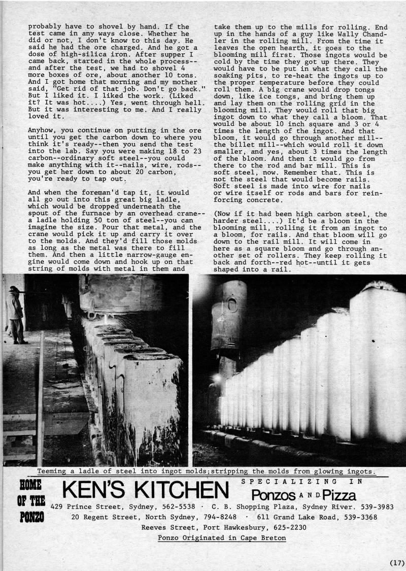 Published by Ronald Caplan on 1980/12/1 (323 reads)probably have to shovel by hand. If the test came in any ways close. Whether he did or not, I don't know to this day. He said he had the ore charged. And he got a dose of high-silica iron. After supper I came back, started in the whole process-- and after the test, we had to shovel 4 more boxes of ore, about another 10 tons. And I got home that morning and my mother said, "Get rid of that job. Don't go back." But I liked it. I liked the work. (Liked it? It was hot....) Yes, went through hell. But it was interesting to me. And I really loved it. Anyhow, you continue on putting in the ore until you get the carbon down to where you think it's ready--then you send the test into the lab. Say you were making 18 to 23 carbon--ordinary soft steel--you could make anything with it--nails, wire, rods-- you get her down to about 20 carbon, you're ready to tap out. And when the foreman'd tap it, it would all go out into this great big ladle, which would be dropped underneath the spout of the furnace by an overhead crane-- a ladle holding 50 ton of steel--you can imagine the size. Pour that metal, and the crane would pick it up and carry it over to the molds. And they'd fill those molds as long as the metal was there to fill them. And then a little narrow-gauge en? gine would come down and hook up on that string of molds with metal in them and take them up to the mills for rolling. End up in the hands of a guy like Wally Chand? ler in the rolling mill. From the time it leaves the open hearth, it goes to the blooming mill first. Those ingots would be cold by the time they got up there. They would have to be put in what they call the soaking pits, to re-heat the ingots up to the proper temperature before they could roll them. A big crane would drop tongs down, like ice tongs, and bring them up and lay them on the rolling grid in the blooming mill. They would roll that big ingot down to what they call a bloom. That would be about 10 inch square and 3 or 4 times the length of the ingot. And that bloom, it would go through another mill-- the billet mill--which would roll it down smaller, and yes, about 3 times the length of the bloom. And then it would go from there to the rod and bar mill. This is soft steel, now. Remember that. This is noj; the steel that would become rails. 56't steel is made into wire for nails or wire itself or rods and bars for rein? forcing concrete. (Now if it had been high carbon steel, the harder steel....) It'd be a bloom in the blooming mill, rolling it from an ingot to a bloom, for rails. And that bloom will go down to the rail mill. It will come in here as a square bloom and go through an? other set of rollers. They keep rolling it back and forth--red hot--until it gets shaped into a rail. Teeming a ladle of steel into ingot molds;stripping the molds from glowing ingots. "E KEN'S KITCHEN SPECIALIZING IN Ponzos A" ? Pizza 429 Prince Street, Sydney, 562-5538 • C. B. Shopping Plaza, Sydney River. 539-3983 20 Regent Street, North Sydney, 794-8248 • 611 Grand Lake Road, 539-3368 Reeves Street, Port Hawkesbury, 625-2230 Ponzo Originated in Cape Breton (17)