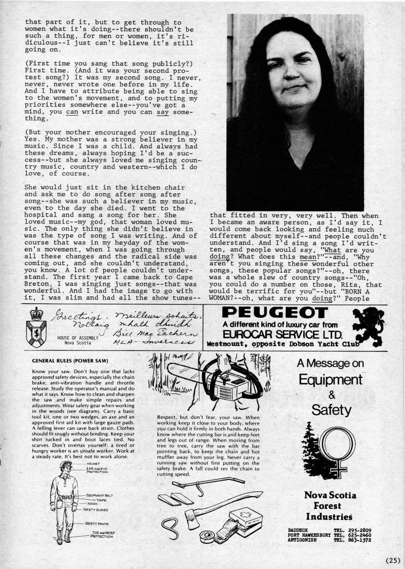Published by Ronald Caplan on 1980/12/1 (363 reads)that part of it, but to get through to women what it's doing--there shouldn't be such a thing, for men or women, it's ri- diculous--I just can't believe it's still going on. (First time you sang that song publicly?) First time. (And it was your second pro? test song?) It was my second song. I never, never, never wrote one before in my life. And I have to attribute being able to sing to the women's movement, and to putting my priorities somewhere else--you've got a mind, you can write and you can say some? thing . (But your mother encouraged your singing.) Yes. My mother was a strong believer in my music. Since I was a child. And always had these dreams, always hoping I'd be a suc- cess--but she always loved me singing coun? try music, country and western--which I do love, of course. She would just sit in the kitchen chair and ask me to do song after song after song--she was such a believer in my music, even to the day she died. I went to the hospital and sang a song for her. She loved music--my god, that woman loved mu? sic. The only thing she didn't believe in was the type of song I was writing. And of course that was in my heyday of the wom? en's movement, when I was going through all these changes and the radical side was coming out, and she couldn't understand, you know. A lot of people couldn't under? stand. The first year I came back to Cape Breton, I was singing just songs--that was wonderful. And I had the image to go with it, I was slim and had all the show tunes-- that fitted in very, very well. Then when I became an aware person, as I'd say it, I would come back looking and feeling much different about myself--and people couldn't understand. And I'd sing a song I'd writ? ten, and people would say, "What are you doing? What does this mean?"--and, "Why aren t you singing these wonderful other songs, these popular songs?"--oh, there was a whole slew of country songs--"0h, you could do a number on those, Rita, that would be terrific for you"--but "BORN A WOMAN?--oh, what are you doing?" People PEUGEOT A differ't kind of Juxury car from EUROCAR SERVICE LTD Westmounty opposite Dobson Yacht Clul u' GENERAL RULES (POWER SAW) Know your saw. Don't buy one that lacks approved safety devices, especially the chain brake, anti-vibration handle and throttle release. Study the operator's nnanual and do what it says. Know how to clean and sharpen the saw and make simple repairs and adjustments. Wear safety gear when working in the woods (see diagram). Carry a basic tool kit, one or two wedges, an axe and an approved first aid kit with large gauze pads. A felling lever can save back strain. Clothes should fit snugly without binding. Keep your shirt tucked in and boot laces tied. No scarves. Don't overtax yourself: a tired or hungry worker is an unsafe worker. Work at a steady rate. It's best not to work alone. Respect, but don't fear, your saw. When working keep it close to your body, where you can hold it firmly in both hands. Always know where the cutting bar is and keep feet and legs out of range. When moving from tree to tree, carry the saw with the bar pointing back, to keep the chain and hot muffler away from your leg. Never carry a running saw without first putting on the safety brake. A fall could rev the chain to cutting speed. A Message on Equipment & Safety Nova Scotia Forest Industries BADDECK TEL. 295-2809 PORT HAWKESBURY TEL. 625-2460 ANTIGONISH TELL 863-1572 (25)