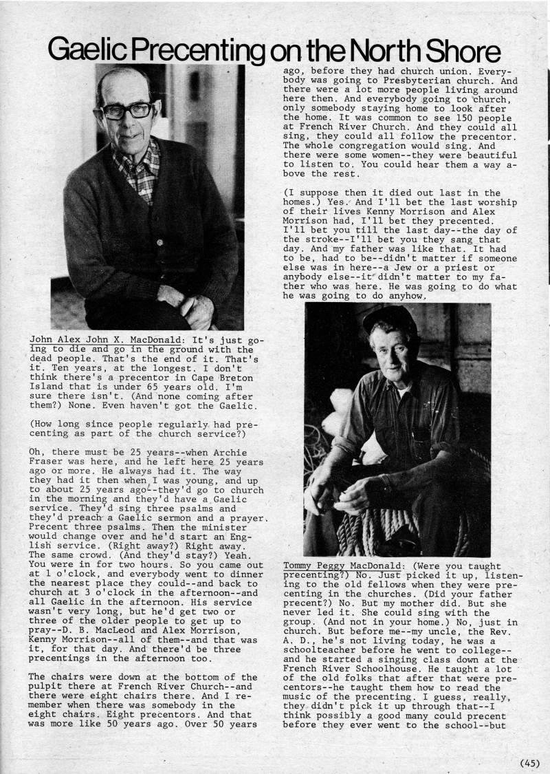 Gaelic Precenting on the North Shore John Alex John X. MacDonald: It's just go- ing to die and go in the ground with the dead people. That's the end of it. That's it. Ten years, at the longest, I don't think there's a precentor in Cape Breton Island that is under 65 years old. I'm sure there isn't. (And none coming after them?) None. Even haven't got the Gaelic. (How long since people regularly had pre? centing as part of the church service?) Oh, there must be 25 years--when Archie Fraser was here, and he left here 25 years ago or more. He always had it. The way they had it then when I was young, and up to about 25 years ago--they'd go to church in the morning and they'd have a Gaelic service. They'd sing three psalms and they'd preach a Gaelic sermon and a prayer. Precent three psalms. Then the minister would change over and he'd start an Eng? lish service. (Right away?) Right away. The same crowd. (And they'd stay?) Yeah. You were in for two hours. So you came out at 1 o'clock, and everybody went to dinner the nearest place they could--and back to church at 3 o'clock in the afternoon--and all Gaelic in the afternoon. His service wasn't very long, but he'd get two or three of the older people to get up to pray--D. B. MacLeod and Alex Morrison, Kenny Morrison--all of them--and that was it, for that day. And there'd be three precentings in the afternoon too. The chairs were down at the bottom of the pulpit there at French River Church--and there were eight chairs there. And I re? member when there was somebody in the eight chairs, Eight precentors. And that was more like 50 years ago. Over 50 years ago, before they had church union. Every? body was going to Presbyterian church. And there were a lot more people living around here then. And everybody going to church, only somebody staying home to look after the home. It was common to see 150 people at French River Church. And they could all sing, they could all follow the precentor. The whole congregation would sing. And there were some women--they were beautiful to listen to. You could hear them a way a- bove the rest. (I suppose then it died out last in the homes.) Yes. And I'll bet the last worship of their lives Kenny Morrison and Alex Morrison had, I'll bet they precented. I'll bet you till the last day--the day of the stroke--I'll bet you they sang that day. And my father was like that. It had to be, had to be--didn't matter if someone else was in here--a Jew or a priest or anybody else--it' didn't matter to my fa? ther who was here. He was going to do what he was going to do anyhow. Tommy Peggy MacDonald: (Were you taught precenting?) No. Just picked it up, listen? ing to the old fellows when they were pre? centing in the churches. (Did your father precent?) No. But my mother did. But she never led it. She could sing with the group. (And not in your home.) No, just in church. But before me--my uncle, the Rev. A, D., he's not living today, he was a schoolteacher before he went to college-- and he started a singing class down at the French River Schoolhouse. He taught a lot of the old folks that after that were pre? centors --he taught them how to read the music of the precenting. I guess, really, they didn't pick it up through that--I think possibly a good many could precent before they ever went to the school--but (45)
