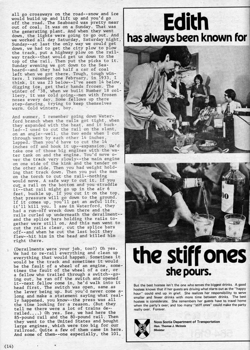 Published by Ronald Caplan on 1981/6/1 (350 reads)all go crossways on the road--snow and ice would build up and lift up and you'd go off the road. The Seaboard was pretty near out of coal. It was on a Sunday. That was the generating plant. And when they went down, the lights were going to go out. And we worked all day Saturday, Saturday night, Sunday--at last the only way we could get down, we had to get the city plow to plow the track, put a highway plow on the rail? way track--that would get us down to the top of the rail. Then put the picks to it. Sunday evening we got down to the Sea- board--and they had half a car of coal left when we got there. Tough, tough win? ters. I remember one February, in 1933, I think, it was 23 below--I've seen 14 below, digging ice, get their hands frozen. The winter of '38, when we built Number 18 col? liery, it was cold going--men with frozen noses every day. Some fellows up there step-dancing, trying to keep themselves warm. Cold winters, boy. And summer, I remember going down Water? ford branch when the rails got tight, when they expanded with the he.at, and it buck- led--I used to cut the rail on the slant, on an angle--well, the two ends when I cut through went by each other 14 inches, lapped. Then you'd have to cut the 14 inches off and hook it up--expansion. We'd take one of those big engines with the wa? ter tank on and the engine. You'd move o- ver the track very slowly--the main engine on one side of the kink and the tender on the other side. Then you had weight hold? ing that track down. Then you put the man on the torch to cut the rail--nothing would move. A safe way to cut it. If you cut_a rail on the bottom and you straddle it--that rail might go up in the air 6 feet, buckle up. If you cut it on the top, that pressure will go down to the ground. If it comes up, you'll get an awful lift, it'll kill you. I saw in Waterford, they had a run-off wreck down there and the rails curled up underneath the derailment-- and the splice bars holding the rails to? gether were still on. And this man went to cut the rails clear, cut the splice bars off--and when he cut the last bolt they flew--hit him in the head and killed him right there. (Derailments were your job, too?) Oh yes. We had to re-rail everything and clean up everything that would happen. Sometimes it would be the track and sometimes it would be the fault of a wheel of an engine, some? times the fault of the wheel of a car, or a fellow who trailed through a switch--go? ing out, he ran off the switch and opened it--next fellow come in, he'd walk into it head first. The switch was open, same as the lever being up. But you'd never come a- long and make a statement saying what real? ly happened, you know--the press was all the time looking for a reason. (But they tell me there were a lot of trains de-- railed....) Oh yes. See, we had here the 85-pound rail and the 80-pound railo Then they went to the United States and bought large engines, which were too big for our railroad. Quite a few of them came in here. And some of them--one especially, the 101, Edith has always been Icnown for the stiff ones she pours. But the best hostess isn't the one who serves the biggest drinks. A good hostess knows that if her guests are driving what starts out as the "happy hour" could end up in grief. She realizes her responsibility to serve smaller and fewer drinks with more time between drinks. The best hostess is considerate. She remembers her guests have to travel home when the party's over; and too many "stiff ones" could make the party really over. Forever. Nova Scotia Department of Transportation Hon. Thomas J. Mclnnis Minister (14)