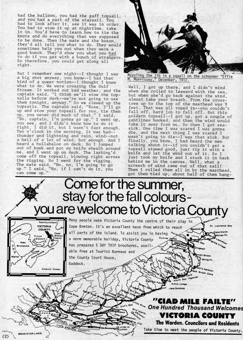 Published by Ronald Caplan on 1981/8/1 (430 reads)had the balloon, you had the gaff topsail, and you had a part of the staysail. You had to look after it, see it was in order. You had to stow it up at nighttime, take it in. You'd have to learn how to tie the knots and do everything that was supposed to be done. Then the mate and the bosun, they'd all tell you what to do. They would sometimes help you out when they were a good bunch. They'd show you what you had to do if you get with a bunch of strangers. So therefore, you could get along all right. But I remember one night--I thought I was a big shot an5'way, you know--I had that kind of a queer notion--I thought I knew what to do. We were crossing the Gulf Stream, It worked out bad weather, and the captain said, "I think we'll stow the top? sails before dark--we're not going to use them tonight, anyway." So we clewed up the topsails. The captain said, "Rose, I'll go up and stow your topsail for you, tie them up, you never did much of that," I said, "No, captain, I'm gonna go up," I went up, you see, and I didn't know how to do it right, I did it, but I wasn't fast enough. Two o'clock in the morning, it was bad-- thunder and lightning and rain, wind--not a hell of a lot of wind, but enough. And I heard a hullabaloo on deck. So I jumped out of bunk and put my knife sheath around .me, and I went up on deck. The lashing'd come off the topsail, blowing right across the rigging. So I went for the rigging. The mate said, "No, no, I'm going to go up," I said, "No, if I can't do it, you can come up." Muzzling the jib in a squall on the schooner "Effie M. Morrissey," December, 1912. Well, I got up there, and I didn't mind when she rolled to leeward with the sea, but when she'd go back against the wind, almost take your breath. From the cross- tree up to the top of the masthead was 9 feet. That was all roped in--you couldn't fall off, hard job to fall off. But this goldam topsail--I got up, got a couple of gantlines hooked, and then the wind would take it away from me. So then I got sea? sick. One time I was scared I was gonna die, and the next thing I was scared I wasn't going to die--I was that sick. But finally, you know, I had heard the men talking about it--if you couldn't get a topsail stowed good, just rip it with a knife and let the wind out of it. So I just took my knife and I stuck it in back behind me in the canvas. Well, what a screech of wind came out of that sail! Then I rolled them all in by the masthead, got them-tied up, about half of them hang- Come for the summer, stay for the fall colours- you are welcome to Victoria County Lawr?nce Bay "CIAD MILi FAILTE" One Hundred Thousand Welcomes VICTORIA COUNTY The Worden, Councilors and Residents Take time to meet the people of Victoria County.