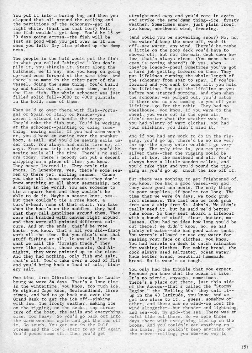Published by Ronald Caplan on 1981/8/1 (322 reads)You put it into a burlap bag and then you slapped that all around the ceiling and the partitions of the schooner--get it right white, (What was that for?) Well, the fish wouldn't get damp. You'd be 15 or 20 days going across--the fish will be just as good when you get over as it was when you left. Dry lime picked up the damp? ness. The people in the hold would put the fish in what you called "shingled." You don't pile it, you shingle it. Start along the bulkhead, we'll say, and you keep on going up--and come forward at the same time. And there's so many in the other part of the vessel, doing the same thing. You'd build up and build out at the same time, using the flat fish. The whole schooner was just filled solid full--3000 to 4000 quintals in the hold, some of them. When we'd go over there with fish--Portu? gal or Spain or Italy or France--you weren't allowed to handle the cargo. They'd take the fish out. You'd be working at the schooner--painting or doing some? thing, sewing sails. If you had warm weath? er, you'd have an awning over the spanker boom, a sail, and you'd be sewing sails un? der that. You always had sails torn up, al? ways. From one trip to the other, you'd be sewing sails all the time. There's no sail? ors today. There's nobody can put a decent whipping:on a piece of line, you know. They never learned it. They can't tie knots. In Lunenburg, yes, there's some sea? men up there yet, sailing seamen. 'Cause you take all those powerboats--they don't know anything at all about seamanship, not a thing in the world. You ask someone to tie a square knot and they wouldn't be able to do it. Maybe a square knot, yes-- but they couldn't tie a rose knot, a turk's-head, none of that stuff. You take when the boom's on the saddles, they had what they call gantlines around them. They were all braided with canvas right around, and they were all painted different col? ours . And on the ends, that'd be rose knots, you know. That's all you did--fancy work all the time. But you didn't use that stuff fishing at all. It was all just in what we call the "foreign trade." They were like yachts, those vessels, God Al? mighty, they were painted up to the nines. And they had nothing, only fish and salt, that's all. You'd take over a load of fish and you'd bring back a load of salt, fish? ery salt. One time, from Gibraltar through to Louis? bourg we were 84 days. That's a long time. In the wintertime, you know, too much ice. We sighted Cape Race, Newfoundland, three times, and had to go back out over the Grand Bank to get the ice off--sinking with ice. The frosty weather, making ice on the rigging, on the decks, top struc? ture of the boat, the sails and everything . else. Too heavy,' So you'd go back out into 'the warm weather again and get the ice off it. Go south. You get out in the Gulf Stream and-the ice'd start to go off again. You'd pound some off. Then you'd get straightened away and you'd come in again and strike the same damn thing--ice, frosty weather. Sometimes snow, just plain frost, you know, northwest wind, freezing. (And would you be shovelling snow?) No, no, the water'd keep the snow off, wash it off--sea water, any wind. There'd be maybe a little on the poop deck you'd have to shovel off, but not the main deck down be? low, that's always clean. (You mean the o- cean is coming aboard?) Oh yes, when they're loaded--phew! Sometimes you've got a hard job getting forward on them. They put lifelines running the whole length of the schooner from spar to spar. If you're forward and you want to come aft, you hold the lifeline. You put the lifeline on you before you started pumping. And then when the schooner was pumped out, you'd watch if there was no sea coming to you off your lifeline--go for the cabin. They had no wheelhouse, you know. If you were to the wheel, you were out in the open air, didn't matter what the weather was. But you had plenty of warm clothes, you had your oilskins, you didn't mind it. And if you had any work to do in the rig? ging, you'd go up. There'd be no ice very far up--the spray water wouldn't go very far up. The only time is, you may get a silver thaw--then the rigging would be full of ice, the masthead and all. You'd always have a little wooden mallet, and you'd take that and you'd pound the rig? ging as you'd go up, knock the ice off it. But there was nothing to get frightened of, you know. You had a good vessel--my god, they were good sea boats. The only thing is your supplies, if you're too long. The time that we were 84 days, we took grub from steamers. The last one we took grub from was a ship from St, John's, We didn't really need it, but he said we'd better take some. So they sent aboard a lifeboat with a bunch of stuff, flour, butter, mo? lasses, (You had no idea how long you'd be out there,) We didn't know, no. We had plenty of water--she had good water tanks. You weren't allowed to use any water for washing your face or clothes, you know. You had barrels on deck to catch rainwater for washing clothes. For making bread, the cook always used saltwater, ocean water. Made better bread, beautiful homemade bread. So it wasn't so tough. You only had the trouble that you expect. Because you know what the ocean is like. It's no picnic, an3rways, sometimes. There's a place out there, just this side of the Azores--that's called the "Stormy Region," the "Rolling 40s" they call it-- up in the 40 latitude, you know. And we got too close to it, I guess, somehow or other, and there was no wind--we lost the wind altogether--but thunder and lightning, and sea--oh, my god--the sea. There was an awful tide out there. So we were three days there with everything tied up on the booms. And you" couldn't get anything on the table, you couldn't keep anything on the stove--rolling, you see--no way to