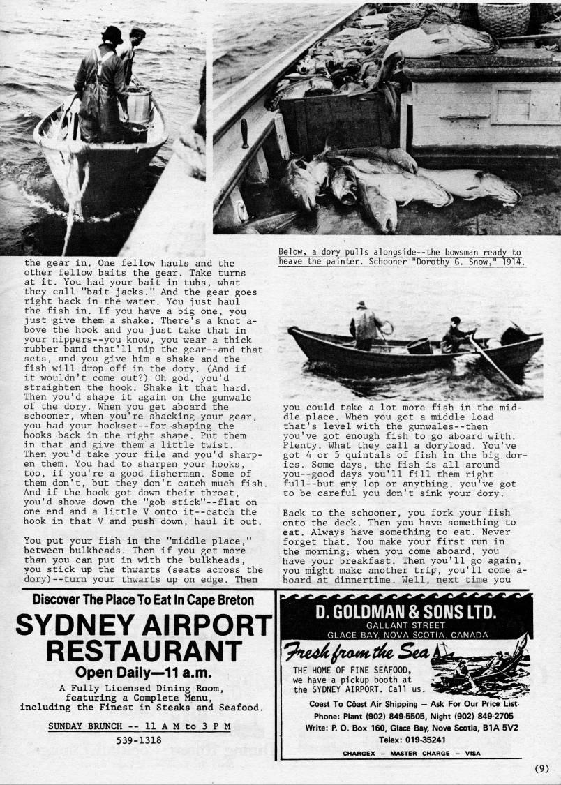 Published by Ronald Caplan on 1981/8/1 (335 reads)the gear in. One fellow hauls and the other fellow baits the gear. Take turns at it. You had your bait in tubs, what they call "bait jacks," And the gear goes right back in the water. You just haul the fish in. If you have a big one, you just give them a shake. There's a knot a- bove the hook and you just take that in your nippers--you know, you wear a thick rubber band that'll nip the gear--and that sets, and you give him a shake and the fish will drop off in the dory. (And if it wouldn't come out?) Oh god, you'd straighten the hook. Shake it that hard. Then you'd shape it again on the gunwale of the dory. When you get aboard the schooner, when you're shacking your gear, you had your hookset--for,-shaping the hooks back in the right shape. Put them in that and give them a little twist. Then you'd take your file and you'd sharp? en them. You had to sharpen your hooks, too, if you're a good fisherman. Some of them don't, but they don't catch much fish. And if the hook got down their throat, you'd shove down the "gob stick"--flat on one end and a little V onto it--catch the hook in that V and push down, haul it out. You put your fish in the "middle place," between bulkheads. Then if you get more than you can put in with the bulkheads, you stick up the thwarts (seats across the dory)--turn your thwarts up on edge. Then Below, a dory pulls alongside--the bowsman ready to heave the painter. Schooner "Dorothy G. Snow," 1914. you could take a lot more fish in the mid? dle place. When you got a middle load that's level with the gunwales--then you've got enough fish to go aboard with. Plenty, What they call a doryload. You've got 4 or 5 quintals of fish in the big dor? ies , Some days, the fish is all around you--good days you'll fill them right full--but any lop or anything, you've got to be careful you don't sink your dory. Back to the schooner, you fork your fish onto the deck. Then you have something to eat. Always have something to eat. Never forget that. You make your first run in the morning; when you come aboard, you have your breakfast. Then you'll go again, you might make another trip, you'll come a- board at dinnertime. Well, next time you Discover The Place To Eat In Cape Breton SYDNEY AIRPORT RESTAURANT Open Daily • 11 a.m. A Fully Licensed Dining Room, featuring a Complete Menu, including the Finest in Steaks and Seafood. SUNDAY BRUNCH -- 11 A M to 3 P M 539-1318 THE HOME OF FINE SEAFOOD, we have a pickup booth at the SYDNEY AIRPORT. Call us. Coast To Cdast Air Shipping - Ask For Our Price List- Phone: Plant (902) 849-5505. Night (902) 849-2705 Write: P, O. Box 160, Glace Bay, Nova Scotia, B1A 5V2 Telex: 019-35241 CHARGEX - MASTER CHARGE - VISA (9)