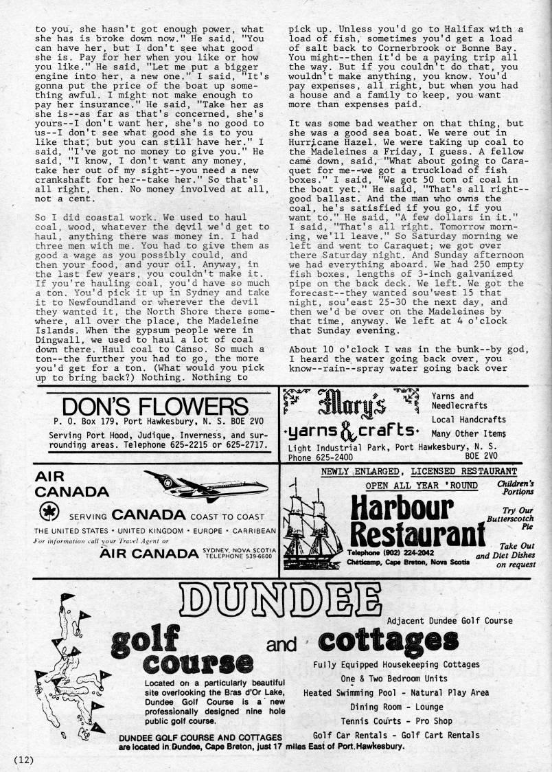 Published by Ronald Caplan on 1981/8/1 (312 reads)to you, she hasn't got enough power, what she has is broke down now." He said, "You can have her, but I don't see what good she is, Pay for her when you like or how you like." He said, "Let me put a bigger engine into her, a new one." I said, "It's gonna put the price of the boat up some? thing awful. I might not make enough to pay her insurance." He said, "Take her as she is--as far as that's concerned, she's yours--I don't want her, she's no good to US--I don't see what good she is to you like that, but you can still have her." I said, "I've got no money to give you." He said, "I know, I don't want any money, take her out of my sight--you need a new crankshaft for her--take her," So that's all right, then. No money involved at all, not a cent. So I did coastal work. We used to haul coal, wood, whatever the devil we'd get to haul, anything there was money in. I had three men with me. You had to give them as good a wage as you possibly could, and then your food, and your oil. Anyway, in the last few years, you couldn't make it. If you're hauling coal, you'd have so much a ton. You'd pick it up in Sydney and take it to Newfoundland or wherever the devil they wanted it, the North Shore there some? where, all over the place, the Madeleine Islands. When the gypsum people were in Dingwall, we used to haul a lot of coal down there. Haul coal to Canso. So much a ton--the further you had to go, the more you'd get for a ton. (What would you pick up to bring back?) Nothing. Nothing to pick up. Unless you'd go to Halifax with a load of fish, sometimes you'd get a load of salt back to Cornerbrook or Bonne Bay. You might--then it'd be a paying trip all the way. But if you couldn't do that, you wouldn't make anything, you know. You'd pay expenses, all right, but when you had a house and a family to keep, you want more than expenses paid. It was some bad weather on that thing, but she was a good sea boat. We were out in Hurricane Hazel. We were taking up coal to the Madeleines a Friday, I guess. A fellow came down, said, "What about going to Cara- quet for me--we got a truckload of fish boxes." I said, "We got 50 ton of coal in the boat yet." He said, "That's all right-- good ballast. And the man who owns the coal, he's satisfied if you go, if you want to." He said, "A few dollars in it." I said, "That's all right. Tomorrow morn- .ing, we'll leave." So Saturday morning we left and went to Caraquet; we got over there Saturday night. And Sunday afternoon we had everything aboard. We had 250 empty fish boxes, lengths of 3-inch galvanized pipe on the back deck. We left. We got the forecast--they wanted sou'west 15 that night, sou'east 25-30 the next day, and then we'd be over on the Madeleines by that time, anyway. We left at 4 o'clock that Sunday evening. About 10 o'clock I was in the bunk--by god, I heard the water going back over, you know--rain--spray water going back over DON'S FLOWERS p. 0. Box 179, Port Hawkesbury, N. S. BOE 2V0 Serving Port Hood, Judique, Inverness, and sur- roundirjg areas. Telephone 625-2215 or 625-2717. yarns 'crafts Yarns and Needlecrafts Light Industrial Park, Phone 625-2400 Local Handcrafts Many Other Items Port Hawkesbury, N. S. BOE 2V0 AIR CANADA Vjjy SERVING CANADA coast to coast THE UNITED STATES * UNITED KINGDOM EUROPE * CARRIBEAN ??For i7iformation call your Travel Agent or MR CANADA NEWLY ENLARGED, LICENSED RESTAURANT OPEN ALL YEAR 'ROUND Harbour Restaurant OiUdren's Portions Try Our Butterscotch Pie Take Out Telephone {902) 224-2042 ' • j ??>,-g, Dishes Cheticamp, Cape Breton, Nova Scotia '' request cottages and golf coarse Located on a particularly beautiful site overlooking the Bras d'Or Lake, Dundee Golf Course is a' new professionally designed nine hole public golf course. DUNDEE GOLF COURSE AND COTTAGES are located In: Dundee, Cape Breton, just 17 miles East of Port. Hawkesbury. Adjacent Dundee Golf Course Fully Equipped Housekeeping Cottages One & Two Bedroom Units Heated Swimming Pool - Natural Play Area Dining Room - Lounge Tennis Courts - Pro Shop Golf Car Rentals - Golf Cart Rentals (12)