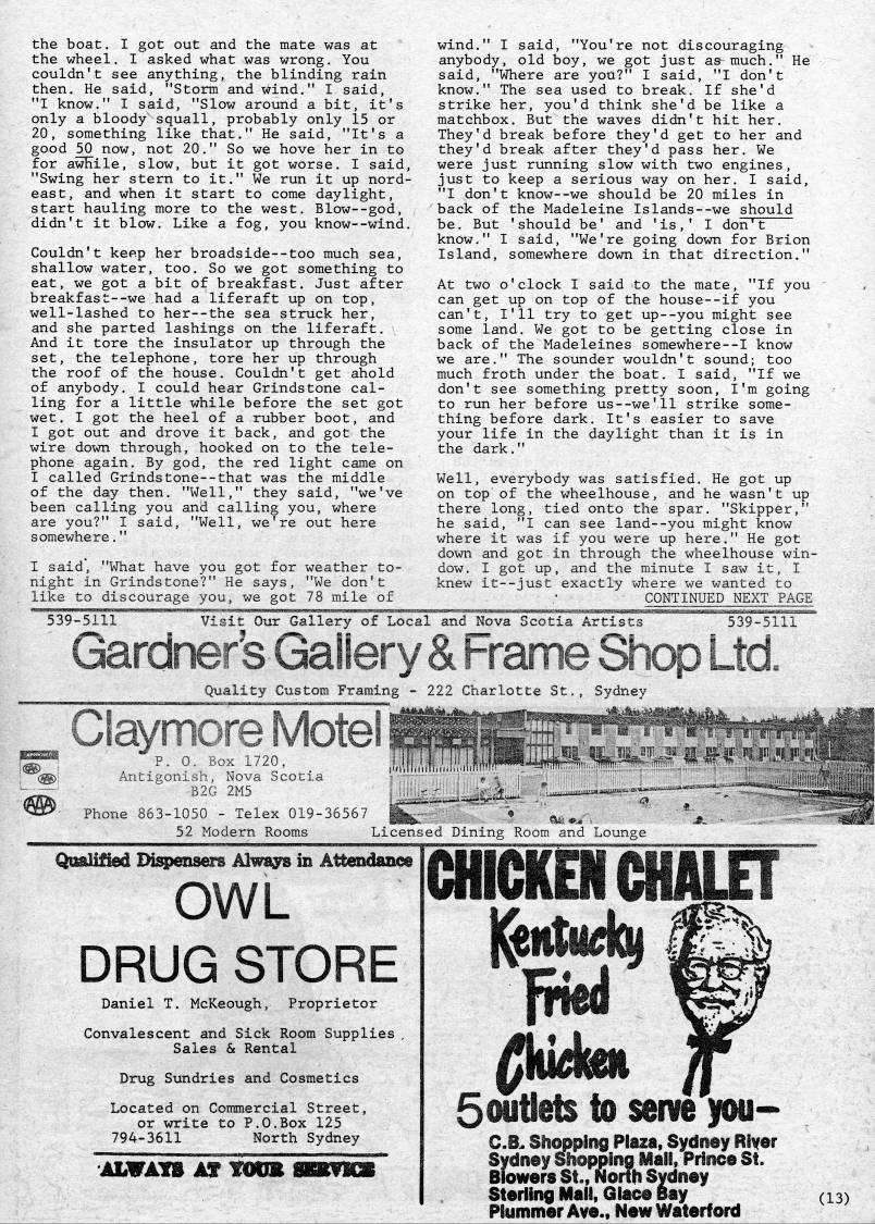 Published by Ronald Caplan on 1981/8/1 (360 reads)the boat. I got out and the mate was at the wheel. I asked what was wrong. You couldn't see anything, the blinding rain then. He said, "Storm and wind." I said, "I know." I said, "Slow around a bit, it's only a bloody squall, probably only 15 or 20, something like that." He said, "It's a good 50' now, not 20," So we hove her in to for awhile, slow, but it got worse. I said, "Swing her stern to it." We run it up nord- east, and when it start to come daylight, start hauling more to the west, Blow--god, didn't it blow. Like a fog, you know--wind. Couldn't keep her broadside--too much sea, shallow water, too. So we got something to eat, we got a bit of breakfast. Just after breakfast--we had a liferaft up on top, well-lashed to her--the sea struck her, and she parted lashings on the liferaft, And it tore the insulator up through the set, the telephone, tore her up through the roof of the house. Couldn't get ahold of anybody. I could hear Grindstone cal? ling for a little while before the set got wet. I got the heel of a rubber boot, and I got out and drove it back, and got the wire down through, hooked on to the tele? phone again. By god, the red light came on I called Grindstone--that was the middle of the day then, "Well," they said, "we've been calling you and calling you, where are you?" I said, "Well, we're out here somewhere," I said", "What have you got for weather to? night in Grindstone?" He says, "We don't like to discourage you, we got 78 mile of He wind," I said, "You're not discouraging anybody, old boy, we got just as much." said, "Where are you?" I said, "I don't know." The sea used to break. If she'd strike her, you'd think she'd be like a matchbox. But the waves didn't hit her. They'd break before they'd get to her and they'd break after they'd pass her. We were just running slow with two engines, just to keep a serious way on her. I said, "I don't know--we should be 20 miles in back of the Madeleine Islands--we should be. But 'should be' know," I said Island and 'is,' I don't "We're going down for Brion somewhere down in that direction," At two o'clock I said to the mate, "If you ' can get up on top of the house--if you can't, I'll try to get up--you might see some land. We got to be getting close in back of the Madeleines somewhere--I know we are," The sounder wouldn't sound; too much froth under the boat, I said, "If we don't see something pretty soon, I'm going to run her before us--we'll strike some? thing before dark. It's easier to save your life in the daylight than it is in the dark," Well, everybody was satisfied. He got up on top of the wheelhouse, and he wasn't up there long, tied onto the spar, "Skipper," he said, "I can see land--you might know where it was if you were up here." He got down and got in through the wheelhouse win? dow, I got up, and the minute I saw it, I knew it--just exactly where we wanted to CONTINUED NEXT PAGE 539-5111 Visit Our Gallery of Local and Nova Scotia Artists 539-5111 Gardners Gallery & Frame Shop Ltd. Quality Custom Framing - 222 Charlotte St., Sydney Claymore Mote p. 0. Box 1720, Antigonish, Nova Scotia B2G 2M5 Phone 863-1050 - Telex 019-36567 52 Modern Rooms Licensed Dining Room and Lounge Qimlifted Dispensers Always in Att'idanoe OWL DRUG STORE Daniel T. McKeough, Proprietor Convalescent and Sick Room Supplies . Sales & Rental Drug Sundries and Cosmetics Located on Commercial Street, or write to P.O.Box 125 794-3611 North Sydney ALWAn AV iOOE SBBflCS CHICKEN CHALET fried SouUets to serae'jiou- C.B. Shopping Plaza, Sydney Riyer Sydney Shopping IMail, Prince St. Blowers St., North Sydney Steriing Mall, QIace Bay Plummer Ave., New Waterford (13)