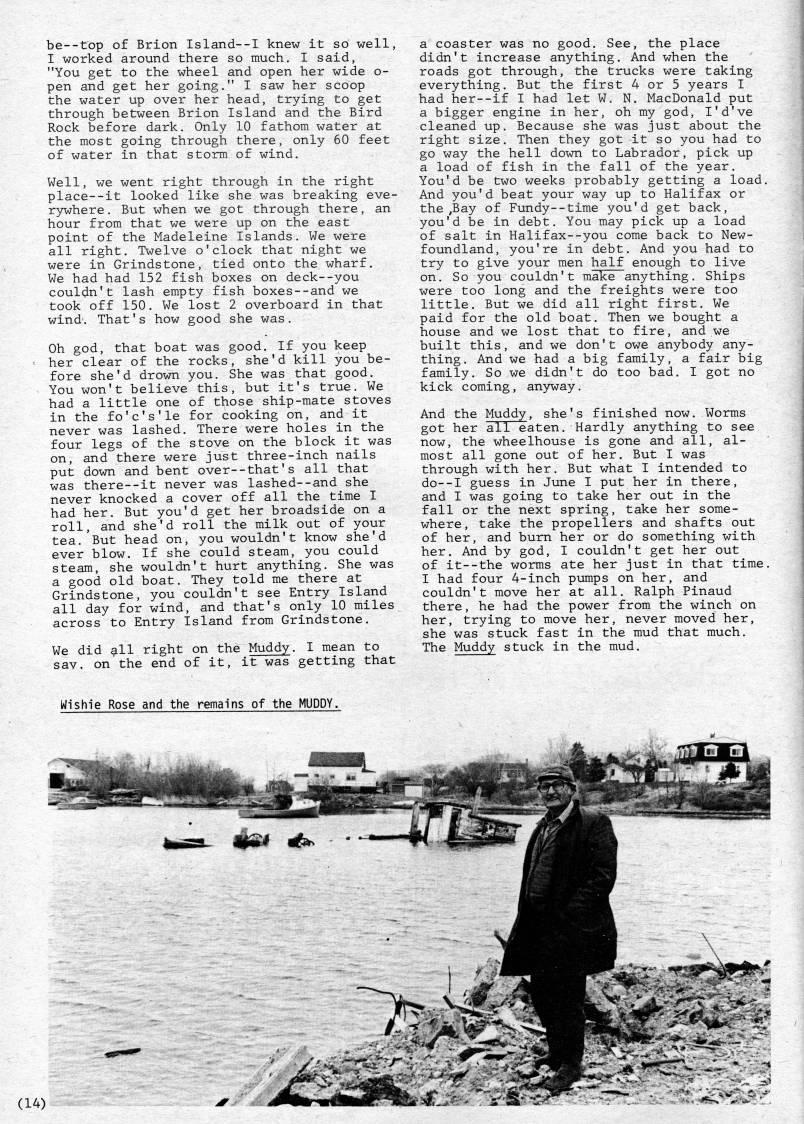 Published by Ronald Caplan on 1981/8/1 (377 reads)be--top of Brion Island--I knew it so well, I worked around there so much, I said, "You get to the wheel and open her wide o- pen and get her going." I saw her scoop the water up over her head, trying to get through between Brion Island and the Bird Rock before dark. Only 10 fathom water at the most going through there, only 60 feet of water in that storm of wind. Well, we went right through in the right place--it looked like she was breaking eve? rywhere . But when we got through there, an hour from that we were up on the east point of the Madeleine Islands. We were all right. Twelve o'clock that night we were in Grindstone, tied onto the wharf. We had had 152 fish boxes on deck--you couldn't lash empty fish boxes--and we took off 150, We lost 2 overboard in that wind. That's how good she was. Oh god, that boat was good. If you keep her clear of the rocks, she'd kill you be? fore she'd drown you. She was that good. You won't believe this, but it's true. We had a little one of those ship-mate stoves in the fo'c's'le for cooking on, and it never was lashed. There were holes in the four legs of the stove on the block it was on, and there were just three-inch nails put down and bent over--that's all that was there--it never was lashed--and she never knocked a cover off all the time I had her. But you'd get her broadside on a roll, and she'd roll the milk out of your tea. But head on, you wouldn't know she'd ever blow. If she could steam, you could steam, she wouldn't hurt anything. She was a good old boat. They told me there at Grindstone, you couldn't see Entry Island all day for wind, and that's only 10 miles across to Entry Island from Grindstone, We did '11 right on the Muddy, I mean to sav. on the end of it, it was getting that a coaster was no good. See, the place didn't increase anything. And when the roads got through, the trucks were taking everything. But the first 4 or 5 years I had her--if I had let W. N. MacDonald put a bigger engine in her, oh my god, I'd've cleaned up. Because she was just about the right size. Then they got it so you had to go way the hell down to Labrador, pick up a load of fish in the fall of the year. You'd be two weeks probably getting a load. And you'd beat your way up to Halifax or the ,Bay of Fundy--time you'd get back, you'd be in debt. You may pick up a load of salt in Halifax--you come back to New? foundland, you're in debt. And you had to try to give your men half enough to live on. So you couldn't make anything. Ships were too long and the freights were too little. But we did all right first. We paid for the old boat. Then we bought a house and we lost that to fire, and we built this, and we don't owe anybody any? thing. And we had a big family, a fair big family. So we didn't do too bad, I got no kick coming, anyway. And the Muddy, she's finished now. Worms got her all eaten. Hardly anything to see now, the wheelhouse is gone and all, al? most all gone out of her. But I was through with her. But what I intended to do--I guess in June I put her in there, and I was going to take her out in the fall or the next spring, take her some? where, take the propellers and shafts out of her, and burn her or do something with her. And by god, I couldn't get her out of it--the worms ate her just in that time. I had four 4-inch pumps on her, and couldn't move her at all. Ralph Pinaud there, he had the power from the winch on her, trying to move her, never moved her, she was stuck fast in the mud that much. The Muddy stuck in the mud. Wishie Rose and the remains of the MUDDY. (14)