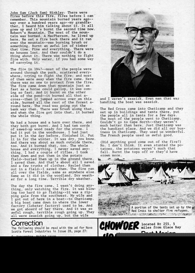 Published by Ronald Caplan on 1981/8/1 (497 reads)John Sam (Jack Sam) Hinkley: There were fires before this fire, fires before I can" remember. This mountain burned years ago-- way over a hundred years ago--my grandfa? ther, I heard him talking about it. It all grew up and it's burnt the second time now, Robert's Mountain. The most of the moun? tain was burned, A MacPherson, he lived up here. He set a fire back there and it ran over the mountain--was burning brush or something. Burnt an awful lot of timber that time. Pine and everything. There were no houses lost. And they couldn't do a thing about it. There was nothing to fight fire with. Only water, if you had some way of carrying it. The fire in 1947--most of the people were around through the park, scattered every? where, trying to fight the fire; and most of them were away when the fire came, Here there was no one to protect from the fire. The fire came down that mountain just as fast as a horse could gallop, it was com? ing so fast. And it burnt on the other side of the pond--it burned all that a- cross--then it jumped across over on this side, burned all the rest of the forest a- round here. The road was going out the bank way then. There was brush along that, and when the fire got into that, it burned the whole thing. We had a house and a barn over there, and they both got burnt. And I had ten cords of sawed-up wood ready for the stove, I had it put in the woodhouse, I had just put it in the day before, finished it. Put it in for the winter. It was dry, you know. And there was about as much outside there, too. And it burned that, too. The whole house and everything, I never saved any? thing, I had a couple of rifles, I took them down and put them in the potato field--buried them up in the ground there. I saved them. And that's about all I saved. And a few trunks of clothes, Hauled them out in a field--I saved them. The fire ran all over the fields, same as anywhere else. Same as it did in the woodland. Dry weath? er for a long time. Terrible dry weather. The day the fire came, I wasn't doing any? thing , only watching the fire. It was blow? ing too hard to go fishing--it was a rip? ping gale from the southwest. My wife and I got out of here in a boat--to Cheticamp. A big boat came down to where the lower factory (lobster factory) used to be. And we got aboard of her there. And it was so awful rough, terrible rough going up. They all were seasick going up, but the wife and I weren't seasick. Even man that was handling the boat was seasick. The Red Cross came into Cheticamp and they set up in buildings and tents there, put the people all in tents for a few days. The most of the people went to Cheticamp. Couldn't go to Cape North--they weren't much better than here. Just Cheticamp was the handiest place. And we did all our bus? iness in Cheticamp. They used us wonderful. The French people used us awful good. (Did anything good come out of the fire?) No. I don't think. It even stunted the po? tatoes, the potatoes weren't much that fall. Burnt the tops off or they'd have erown more. '3.'4' *>>. • ' ' " '" : A portion of the tents set up by the 'f ''[;.. 'v .,. ' ,.'- ?? Red Cross to shelter fire refugees, '' Correction The following should be read with the ad for Nova Scotia Forest Industries in Issue 28, page 27: 9. Hypsometer--Height gauge. 10. String Measure--Box with spools of string hooked to digit counter to measure irregular shaped wood stands for silviculture treatments. NOVA SCOTIA FOREST INDUSTRIES BADDECK - PORT HAWKESBURY - ANTIGONISH ffOtfSC located Rt 255, 5 miles from Glace Bay Port Morien 737-2408 Eniojr jmir fawrite (19'