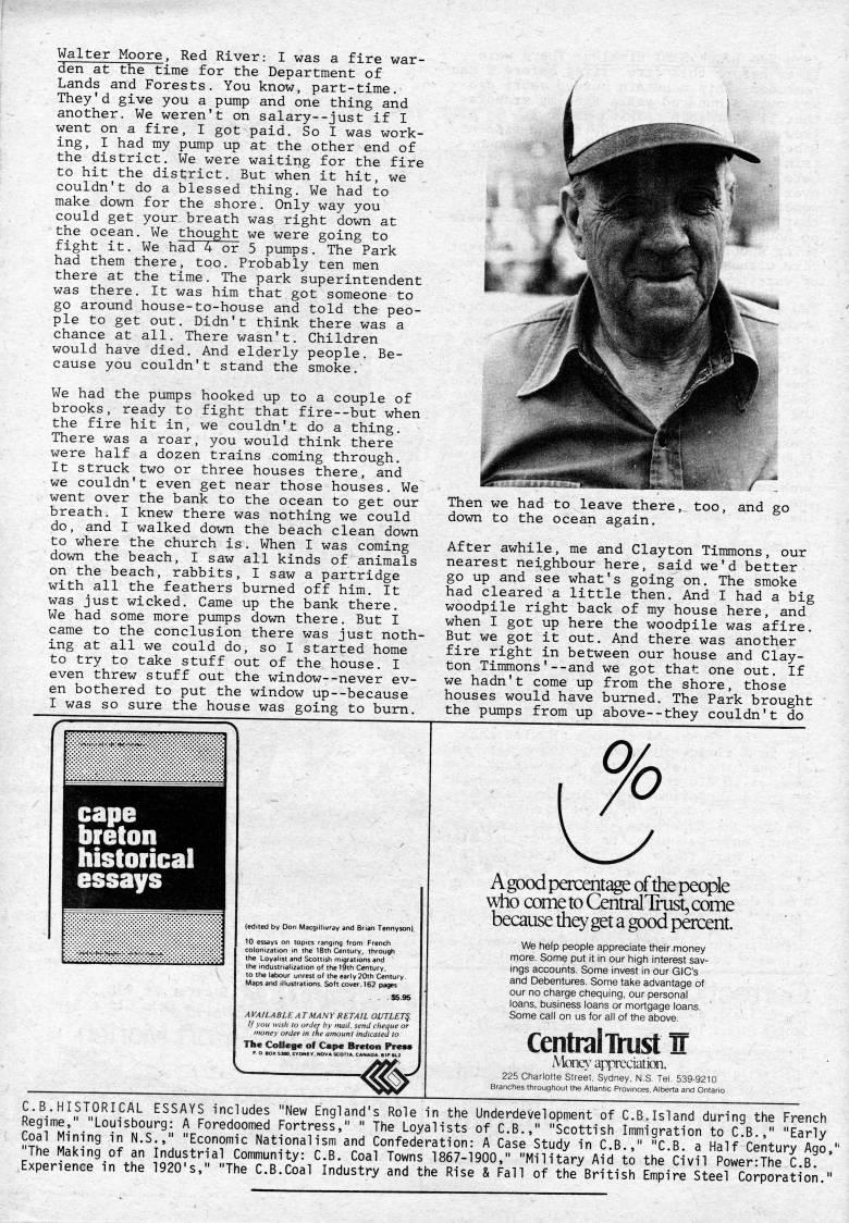 Published by Ronald Caplan on 1981/8/1 (452 reads)Walter Moore, Red River: I was a fire war- den at the time for the Department of Lands and Forests. You know, part-time. They'd give you a pump and one thing and another. We weren't on salary--just if I went on a fire, I got paid. So I was work? ing, I had my pump up at the other end of the district. We were waiting for the fire to hit the district. But when it hit, we couldn't do a blessed thing. We had to make down for the shore, Only way you could get your breath was right down at the ocean. We thought we were going to fight it. We had 4 or 5 pumps. The Park had them there, too. Probably ten men there at the time. The park superintendent was there. It was him that got someone to go around house-to-house and told the peo? ple to get out. Didn't think there was a chance at all. There wasn't. Children would have died. And elderly people. Be? cause you couldn't stand the smoke. We had the pumps hooked up to a couple of brooks, ready to fight that fire--but when the fire hit in, we couldn't do a thing. There was a roar, you would think there were half a dozen trains coming through. It struck two or three houses there, and we couldn't even get near those houses. We went over the bank to the ocean to get our breath. I knew there was nothing we could do, and I walked down the beach clean down to where the church is, When I was coming down the beach, I saw all kinds of animals on the beach, rabbits, I saw a partridge with all the feathers burned off him. It was just wicked. Came up the bank there. We had some more pumps down there. But I came to the conclusion there was just noth? ing at all we could do, so I started home to try to take stuff out of the house. I even threw stuff out the window--never ev? en bothered to put the window up--because I was so sure the house was going to burn. Then we had to leave there, too, and go down to the ocean again. After awhile, me and Clayton Timmons, our nearest neighbour here, said we'd better go up and see what's going on. The smoke had cleared a little then. And I had a big woodpile right back of my house here, and when I got up here the woodpile was afire. But we got it out. And there was another fire right in between our house and Clay? ton Timmons'--and we got that one out. If we hadn't come up from the shore, those houses would have burned. The Park brought the pumps from up above--they couldn't do cape breton historical essays of the 19th Century, of the earlv 20th Centuf IS. Soft cover. 162 pages A VAILABLE A TMANY RETAIL OUTLET'. If you wish lo order by mail, send cheque or money order in the amount indicated to The College of Cape Breton PrcM Agood percentage of the people who come to CentralTrust, come because they get a good percent. We help people appreciate their.money rriore. Some put it in our high interest sav? ings accounts. Some invest in our QIC's and Debentures. Some take advantage of our no charge chequing, our personal loans, business loans or mortgage loans. Some call on us for all of the above. CentralTl-ust IT Mone' apprcciatbn. C.B.HISTORICAL ESSAYS includes "New England's Role in the Underdevelopment of C.B.Island during the French Regime," "Louisbourg: A Foredoomed Fortress," " The Loyalists of C.B.," "Scottish Immigration to C.B.," "Early Coal Mining in N.S.," "Economic Nationalism and Confederation: A Case Study in C.B.," "C,B. a Half Century Ago, "The Making of an Industrial Community: C.B. Coal Towns 1867-1900," "Military Aid to the Civil Power:The C.B. Experience in the 1920's," "The C.B.Coal Industry and the Rise & Fall of the British Empire Steel Corporation."