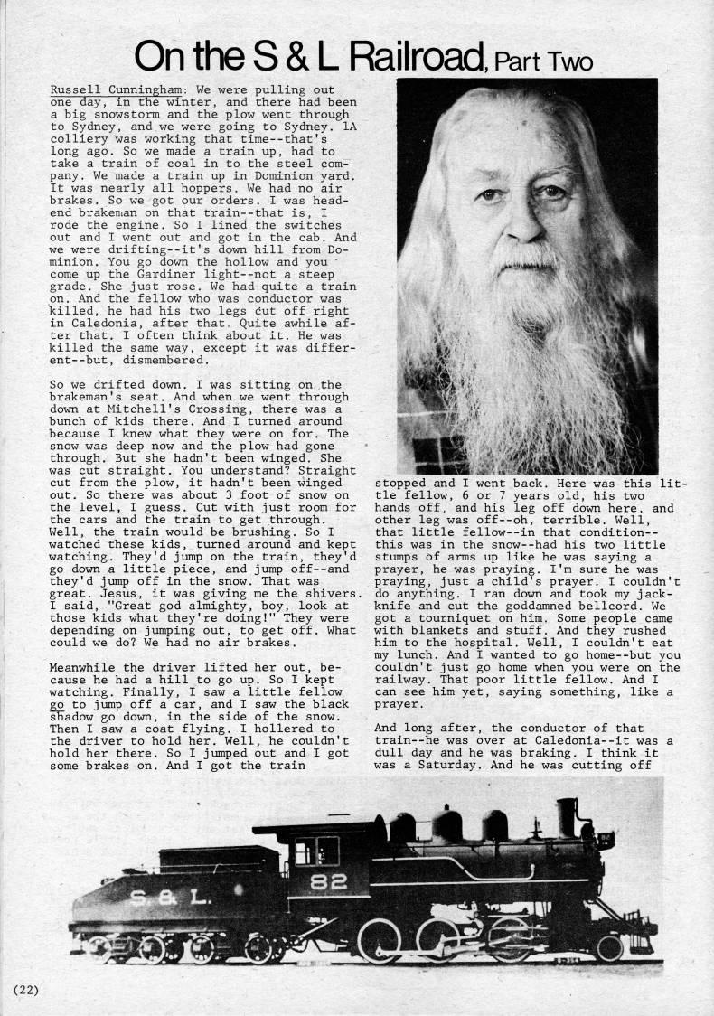 Published by Ronald Caplan on 1981/8/1 (793 reads)On the S & L Railroad, Part two Russell Cunningham: We were pulling out one day, in the winter, and there had been a big snowstorm and the plow went through to Sydney, and we were going to Sydney, lA colliery was working that time--that's long ago. So we made a train up, had to take a train of coal in to the steel com? pany. We made a train up in Dominion yard. It was nearly all hoppers, We had no air brakes. So we got our orders. I was head? end brakeman on that train--that is, I rode the engine. So I lined the switches out and I went out and got in the cab, And we were drifting--it's down hill from Do? minion. You go down the hollow and you ' come up the Gardiner light--not a steep grade. She just rose. We had quite a train on. And the fellow who was conductor was killed, he had his two legs cut off right in Caledonia, after thato Quite awhile af? ter that, I often think about it. He was killed the same way, except it was differ? ent- -but, dismembered. So we drifted down. I was sitting on the brakeman's seat. And when we went through down at Mitchell's Crossing, there was a bunch of kids there. And I turned around because I knew what they were on for. The snow was deep now and the plow had gone through. But she hadn't been winged. She was cut straight. You understand? Straight cut from the plow, it hadn't been winged out. So there was about 3 foot of snow on the level, I guess. Cut with just room for the cars and the train to get through. Well, the train would be brushing. So I watched these kids, turned around and kept watching. They'd jump on the train, they'd go down a little piece, and jump off--and they'd jump off in the snow. That was great. Jesus, it was giving me the shivers. I said, "Great god almighty, boy, look at those kids what they're doing!" They were depending on jumping out, to get off. What could we do? We had no air brakes, Meanwhile the driver lifted her out, be? cause he had a hill to go up. So I kept watching. Finally, I saw a little fellow go to jump off a car, and I saw the black sEadow go down, in the side of the snow. Then I saw a coat flying. I hollered to the driver to hold her. Well, he couldn't hold her there. So I jumped out and I got some brakes on. And I got the train stopped and I went back. Here was this lit? tle fellow, 6 or 7 years old, his two hands off, and his leg off down here, and other leg was off--oh, terrible. Well, that little fellow--in that condition-- this was in the snow--had his two little stumps of arms up like he was saying a prayer, he was praying. I'm sure he was praying, just a child's prayer, I couldn't do anything. I ran down and took my jack- knife and cut the goddamned bellcord. We got a tourniquet on him. Some people came with blankets and stuff. And they rushed him to the hospital. Well, I couldn't eat my lunch. And I wanted to go home--but you couldn't just go home when you were on the railway. That poor little fellow. And I can see him yet, saying something, like a prayer. And long after, the conductor of that train--he was over at Caledonia--it was a dull day and he was braking, I think it was a Saturday, And he was cutting off