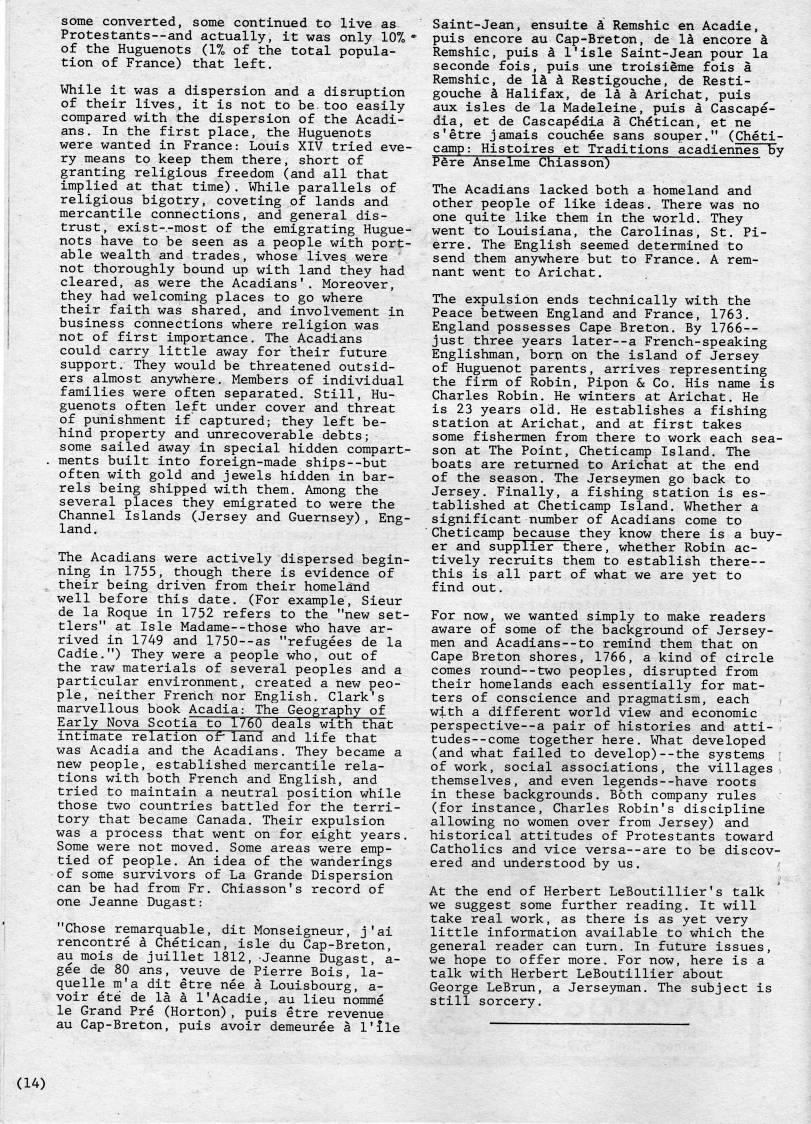 Published by Ronald Caplan on 1981/12/1 (404 reads)some converted, some continued to live as Protestants--and actually, it was only 10% " of the Huguenots (1% of the total popula? tion of France) that left. While it was a dispersion and a disruption of their lives, it is not to be.too easily compared with the dispersion of the Acadi? ans. In the first place, the Huguenots were wanted in France: Louis XIV tried eve? ry means to keep them there, short of granting religious freedom (and all that implied at that time). While parallels of religious bigotry, coveting of lands and mercantile connections, and general dis? trust, exist • most of the emigrating Hugue? nots have to be seen as a people with port? able wealth and trades, whose lives were not thoroughly bound up with land they had cleared, as were the Acadians'. Moreover, they had welcoming places to go where their faith was shared, and involvement in business connections where religion was not of first importance. The Acadians could carry little away for their future support. They would be threatened outsid? ers almost anywhere. Members of individual families were often separated. Still, Hu? guenots often left under cover and threat of punishment if captured; they left be? hind property and unrecoverable debts; some sailed away in special hidden compart? ments built into foreign-made ships--but often with gold and jewels hidden in bar? rels being shipped with them. Among the several places they emigrated to were the Channel Islands (Jersey and Guernsey), Eng? land. The Acadians were actively dispersed begin? ning in 1755, though there is evidence of their being driven from their homeland well before this date. (For example, Sieur de la Roque in 1752 refers to the "new set? tlers" at Isle Madame--those who have ar? rived in 1749 and 1750--as "refugees de la Cadie.") They were a people who, out of the raw materials of several peoples and a particular environment, created a new peo? ple, neither French nor English. Clark's marvellous book Acadia: The Geography of Early Nova Scotia to 1760 deals with that intimate relation of*land and life that was Acadia and the Acadians. They became a new people, established mercantile rela? tions with both French and English, and tried to maintain a neutral position while those two countries battled for the terri? tory that became Canada, Their expulsion was a process that went on for eight years. Some were not moved. Some areas were emp? tied of people. An idea of the wanderings of some survivors of La Grande Dispersion can be had from Fr. Chiasson's record of one Jeanne Dugast: "Chose remarquable, dit Monseigneur, j'ai rencontre a Chetican, isle du Cap-Breton, au mois de juillet 1812, Jeanne Dugast, a- gee de 80 ans, veuve de Pierre Bois, la- quelle m'a dit etre nee a Louisbourg, a- voir ete de la a I'Acadie, au lieu nomme le Grand Pre (Horton), puis etre revenue au Cap-Breton, puis avoir demeuree a I'lle Saint-Jean, ensuite k Remshic en Acadie, puis encore au Cap-Breton, de la encore k Remshic, puis a I'isle Saint-Jean pour la seconde fois, puis une troisieme fois a Remshic, de 1' k Restigouche, de Resti- gouche k Halifax, de Ik a Arichat, puis aux isles de la Madeleine, puis a Cascape- dia, et de Cascapedia a Chdtican, et ne s'etre jamais couchee sans souper." (Cheti? camp: Histoires et Traditions acadiennes by P??re Anselme Chiasson) The Acadians lacked both a homeland and other people of like ideas. There was no one quite like them in the world. They went to Louisiana, the Carolinas, St. Pi? erre. The English seemed determined to send them anywhere but to France. A rem? nant went to Arichat. The expulsion ends technically with the Peace between England and France, 1763. England possesses Cape Breton. By 1766-- just three years later--a French-speaking Englishman, born on the island of Jersey of Huguenot parents, arrives representing the firm of Robin, Pipon & Co. His name is Charles Robin. He winters at Arichat. He is 23 years old. He establishes a fishing station at Arichat, and at first takes some fishermen from there to work each sea? son at The Point, Cheticamp Island. The boats are returned to Arichat at the end of the season. The Jerseymen go back to Jersey. Finally, a fishing station is es? tablished at Cheticamp Island. Whether a significant number of Acadians come to Cheticamp because they know there is a buy? er and supplier there, whether Robin ac? tively recruits them to establish there-- this is all part of what we are yet to find out. For now, we wanted simply to make readers aware of some of the background of Jersey- men and Acadians--to remind them that on Cape Breton shores, 1766, a kind of circle comes round--two peoples, disrupted from their homelands each essentially for mat? ters of conscience and pragmatism, each with a different world view and economic perspective--a pair of histories and atti- tudes--come together here. What developed (and what failed to develop)--the systems of work, social associations, the villages themselves, and even legends--have roots in these backgrounds. Both company rules (for instance, Charles Robin's discipline allowing no women over from Jersey) and historical attitudes of Protestants toward Catholics and vice versa--are to be discov? ered and understood by us. At the end of Herbert LeBoutillier's talk we suggest some further reading. It will take real work, as there is as yet very little information available to which the general reader can turn. In future issues, we hope to offer more. For now, here is a talk with Herbert LeBoutillier about George LeBrun, a Jerseyman. The subject is still sorcery. (14)
