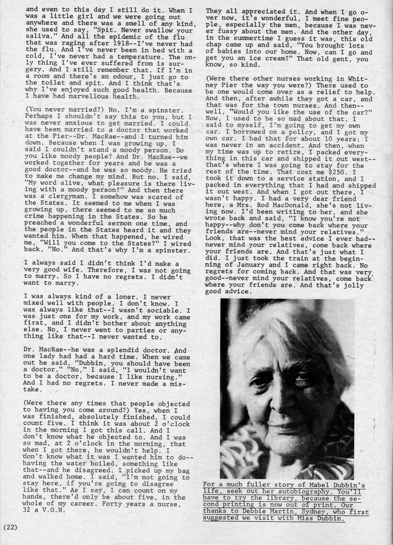 Published by Ronald Caplan on 1981/12/1 (321 reads)and even to this day I still do it. When I was a little girl and we were going out an3rwhere and there was a smell of any kind, she used to say, "Spit. Never swallow your saliva." And all the epidemic of the flu that was raging after 1918--I've never had the flu. And I've never been in bed with a cold, I've never had a temperature. The on? ly thing I've ever suffered from is sur? gery. And I still remember that. If I'm in a room and there's an odour, I just go to the toilet and spit. And I think that's why I've enjoyed such good health. Because I have had marvellous health. (You never married?) No. I'm a spinster. Perhaps I shouldn't say this to you, but I was never anxious to get married. I could have been married to a doctor that worked at the Pier--Dr. MacRae--and I turned him down. Because when I was growing up, I said I couldn't stand a moody person. Do you like moody people? And Dr. MacRae--we wo;:ked together for years and he was a good doctor--and he was so moody. He tried to make me change my mind. But no. I said, "My word alive, what pleasure is there liv? ing with a moody person?" And then there was a clergyman. I somehow was scared of the States. It seemed to me when I was growing up, there seemed to me so much crime happening in the States. So he preached a wonderful sermon one time, and the people in the States heard it and they wanted him. When that happened, he wired me, "Will you come to the States?" I wired back, "No." And that's why I'm a spinster. I always said I didn't think I'd make a very good wife. Therefore, I was not going to marry. So I have no regrets. I didn't want to marry. I was always kind of a loner. I never mixed well with people. I don't know. I was always like that--I wasn't sociable. I was just one for my work, and my work came first, and I didn't bother about anything else. No, I never went to parties or any? thing like that--I never wanted to. Dr. MacRae--he was a splendid doctor. And one lady had had a hard time. When we came out he said, "Dubbin, you should have been a doctor." "No," I said, "I wouldn't want to be a doctor, because I like nursing." And I had no regrets. I never made a mis? take, (Were there any times that people objected to having you come around?) Yes, when I was finished, absolutely finished, I could count five. I think it was about 2 o'clock in the morning I got this call. And I don't know what he objected to. And I was so mad, at 2 o'clock in the morning, that when I got there, he wouldn't help. I lion't know what it was I wanted him to do-- having the water boiled, something like that--and he disagreed. I picked up my bag and walked home. I said, "I'm not going to stay here, if you're going to disagree like that." As I say, I can count on my hands, there'd only be about five, in the whole of my career. Forty years a nurse, 32 a V.O.N. They all appreciated it. And when I go o- ver now, it's wonderful, I meet fine peo? ple, especially the men, because I was nev? er fussy about the men. And the other day, in the summertime I guess it was, this old chap came up and said, "You brought lots of babies into our home. Now, can I go and get you an ice cream?" That old gent, you know, so kind. (Were there other nurses working in Whit? ney Pier the way you were?) There used to be one would come over as a relief to help. And then, after awhile they got a car, and that was for the town nurses. And then-- well, "Would you like the use of the car?" Now, I used to be so mad about that. I said to myself, I'm going to get my own car. I borrowed on a policy, and I got my own car. I had that for about 10 years; I was never in an accident. And then, when my time was up to retire, I packed every? thing in this car and shipped it out west-- that's where I was going to stay for the rest of the time. That cost me $250. I took it down to a service station, and I packed in everything that I had and shipped it out west. And when I got out there, I wasn't happy. I had a very dear friend here, a Mrs. Rod MacDonald, she's not liv? ing now. I'd been writing to her, and she wrote back and said, "I know you're not happy--why don't you come back where your friends are--never mind your relatives." Look, that was the best advice I ever had-- never mind your relatives, come back where your friends are. And that's just what I did. I just took the train at the begin? ning of January and I came right back. No regrets for coming back. And that was very' good--never mind your relatives, come back where your friends are. And that's jolly good advice. For a much fuller story of Mabel Dubbin's life, seek out her autobiography. You'll have to try the library, because the se? cond printing is now out of print. Our thanks to Debbie Martin, Sydney, who first suggested we visit with Miss DubbinT