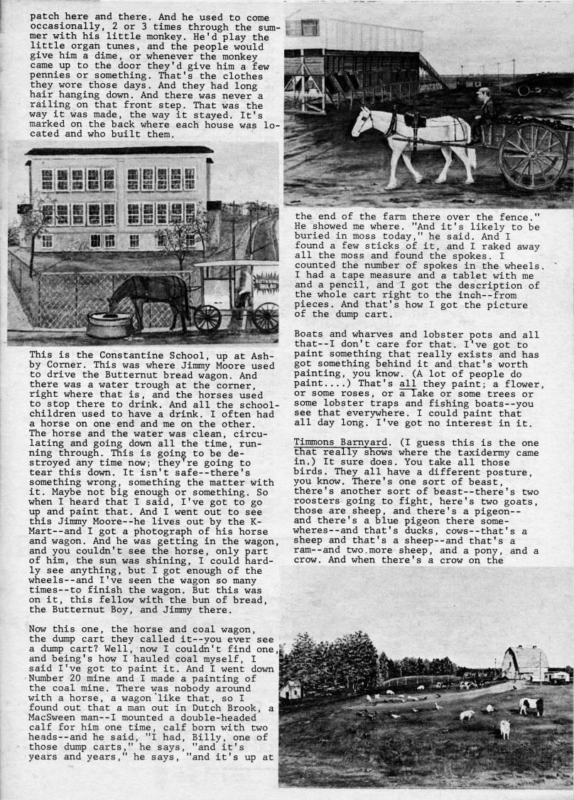 Published by Ronald Caplan on 1981/12/1 (277 reads)patch here and there. And he used to come occasionally, 2 or 3 times through the sum? mer with his little monkey. He'd play the little orgah tunes, and the people would give him a dime, or whenever the monkey came up to the door they'd give him a few pennies or something. That's the clothes they wore those days. And they had long hair hanging down. And there was never a railing on that front step. That was the way it was made, the way it stayed. It's marked on the back where each house was lo? cated and who built them. n This is the Constantine School, up at Ash- by Comer. This was where Jimmy Moore used to drive the Butternut bread wagon. And there was a water trough at the corner, right where that is, and the horses used to stop there to drink. And all the school? children used to have a drink. I often had a horse on one end and me on the other. The horse and the water was clean, circu? lating and going down all the time, run? ning through. This is going to be de? stroyed any time now; they re going to tear this down. It isn't safe--there's something wrong, something the matter with it. Maybe not big enough or something. So when I heard that I said, I've got to go up and paint that. And I went out to see this Jimmy Moore--he lives out by the K- Mart--and I got a photograph of his horse and wagon. And he was getting in the wagon, and you couldn't see the horse, only part of him, the sun was shining, I could hard? ly see anything, but I got enough of the wheels--and I've seen the wagon so many times--to finish the wagon. But this was on it, this fellow with the bun of bread, the Butternut Boy, and Jimmy there. Now this one, the horse and coal wagon, the dump cart they called it--you ever see a dump cart? Well, now I couldn't find one and being's how I hauled coal myself, I said I've got to paint it. And I went down Number 20 mine and I made a painting of the coal mine. There was nobody around with a horse, a wagon'like that, so I found out that a man out in Dutch Brook, a MacSween man--I mounted a double-headed calf for him one time, calf bom with two heads--and he said, "I had, Billy, one of those dump carts," he says, "and it's years and years," he says, "and it's up at . • ,-'??'?' 'Simk wm the end of the farm there over the fence." He showed me where. "And it's likely to be buried in moss today," he said. And I found a few sticks of it, and I raked away all the moss and found the spokes. I counted the number of spokes in the wheels. I had a tape measure and a tablet with me and a pencil, and I got the description of the whole cart right to the inch--from pieces. And that's how I got the picture of the dump cart. Boats and wharves and lobster pots and all that--I don't care for that. I've got to paint something that really exists and has got something behind it and that's worth painting, you know. (A lot of people do paint....) That's all they paint; a flower, or some roses, or a lake or some trees or some lobster traps and fishing boats--you see that everywhere. I could paint that all day long. I've got no interest in it. Timmons Barnyard. (I guess this is the one that really shows where the taxidermy came in.) It sure does. You take all those birds. They all have a different posture, you know. There's one sort of beast, there's another sort of beast--there's two roosters going to fight, here's two goats, those are sheep, and there's a pigeon-- and there's a blue pigeon there some- wheres--and that's ducks, cows--that's a sheep and that's a sheep--and that's a ram--and two.more sheep, and a pony, and a crow. And when there's a crow on the