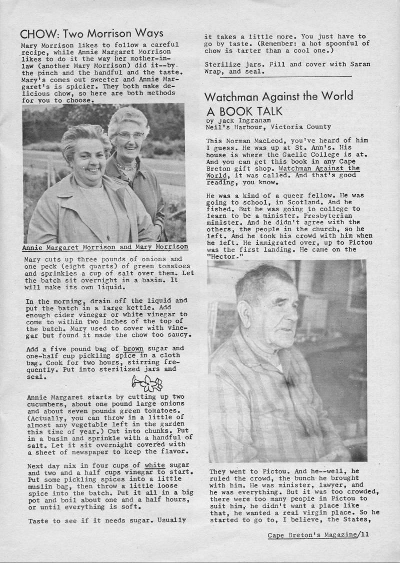 CHOW: Two Morrison Ways Mary Morrison likes to follow a careful recipe, while Annie Margaret Morrison likes to do it the way her mother-in- law (another Mary Morrison) did it • by- the pinch and the handful and the taste. Mary's comes out sweeter and Annie Mar? garet's is spicier. They both make de? licious chow, 5"' 'er'' are both methods for vou to chc :f4 M "'' "' Annie Margaret Morrison and Mary Morrison Mary cuts up three pounds of onions and one peck (eight quarts) of green tomatoes and sprinkles a cup of salt over them. Let the batch sit overnight in a basin. It will make its own liquid. In the morning, drain off the liquid and put the batch in a large kettle. Add enough cider vinegar or white vinegar to come to within two inches of the top of the batch. Mary used to cover with vine? gar but found it made the chow too saucy. Add a five pound bag of brown sugar and one-lialf cup pickling spice in a cloth bag. Cook for two hours, stirring fre? quently. Put into sterilized jars and seal. Annie Margaret starts by cutting up two cucumbers, about one pound large onions and about seven pounds green tomatoes. (Actually, you can throw in a little of almost any vegetable left in the garden this time of year.) Cut into chunks. Put in a basin and sprinkle with a handful of salt. Let it sit overnight covered with a sheet of newspaper to keep the flavor. Next day mix in four cups of white sugar and two and a half cups vinegar to start. Put some pickling spices into a little muslin bag, then throw a little loose spice into the batch. Put it all in a big pot and boil about one and a half hours, or until everythir' is soft. Taste to see if it needs sugar. Usually it takes a little more. You just have to go by taste. (Remember: a hot spoonful of chow is tarter than a cool one.) Sterilize jars. Fill and cover with Saran Wrap, and seal. Watchnnan Against the World A BOOK TALK Dy Jack Ingranam Neil's Harbour, Victoria County This Norman MacLeod, you've heard of him I guess. He was up at St, Ann's, His house is where the Gaelic College is at. And you can get this book in any Cape Breton gift shop. Watchman Against the World, it was called. And that's good reading, you know. He was a kind of a queer fellow. He was going to school, in Scotland, And he fished. But he was going to college to learn to be a minister, Presbyterian minister. And he didn't agree with the others, the people in the church, so he left. And he took his crowd with him when he left. He immigrated over, up to Pictou was the first landing. He came on the "Hector." ? They went to Pictou, And he • well, he ruled the crowd, the bunch he brought with him. He was minister, lawyer, and he was everything. But it was too crowded, there were too many people in Pictou to suit him,- he didn't want a place like that, he wanted a real virgin place. So he started to go to, I believe, the States, Cape Breton's Magazine/ll