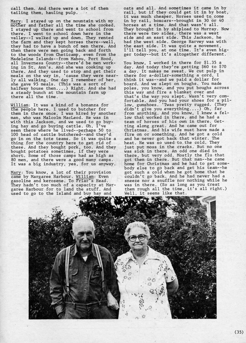 Published by Ronald Caplan on 1981/12/1 (239 reads)call them. And there were a lot of them tailing them, hauling pulp. Mary: I stayed up on the mountain with my mother and father all the time she cooked. I stayed up there and went to school from there. I went to school down here in the valley--I walked up and down. They rented the farm and they kept horses there--well, they had to have a bunch of men there. And then there were men going back and forth to the woods from Cheticamp, even from the Madeleine Islands--from Mabou, Port Hood, all Inverness County--there'd be men work? ing in St. Ann's. And she was cooking up there. And they used to stop and get their meals on the way in, 'cause they were near? ly all walking. One day I remember of her, she gave 95 meals. (This was a sort of halfway house then....) Right. And she had a steady bunch at the mountain farm up there dll the time, William: It was a kind of a bonanza for the people here. I used to butcher for them in there once. I was hired by another man, who was Malcolm MacLeod. He was in with this Jackson, and we used to go buy? ing hay and go buying cattle. Oh, I've seen there where he lived--perhaps 50 to 100 head of cattle butchered--and they'd go in on the tote teams. So it was quite a thing for the country here to get rid of these. And they bought pork, too. And they bought potatoes sometimes, if they were short. Some of those camps had as high as 80 men, and there were a good many camps. It was a big industry, yes, for us anyway. Mary: You know, a lot of their provision came by Margaree Harbour. William: Even gasoline and kerosene. To Friar's Head. They hadn't too much of a capacity at Mar? garee Harbour for to land the stuff. And used to go to the Island and buy hay and oats and all. And sometimes it came in by rail, but if they could get it in by boat, it was much cheaper. Horses used to come in by rail, boxcars--brought in 30 or 40 horses at a time. And that wasn't all. They brought in by shipload to Murray. Now there were two sides, there was a west side and an east side. This Jackson, he had the west side. George Harvey was with the east side. It was quite a movement, I'll tell you, at one time. It's even big? ger today--but it's altogether different. You know, I worked in there for $1.35 a day. And today they're getting $60 to $70 a day. It makes me sweat. We cut pulp in there for a-dollar-something a cord, I think it was--and we paid a dollar for board. And we slept on boughs. You made poles, you know, and you put boughs across this way and fire a blanket over and that's the way you slept. Wasn't very com? fortable. And you had your shoes for a pil? low, gumshoes. 'Twas pretty rugged. (They didn't give you everything....) Oh, far from anything. And you know, I knew a fel? low that worked in there, and he had a team of horses of his own in there. Get? ting along great. And he came out for Christmas. And his wife must have made a fire on or something. And he got a cold and he never got back that winter. The heat. He was so used to.the cold. They just put moss in the cracks.' But no one was sick in there. An odd one died in there, but very odd. Mostly the flu that got them in there. But that man--he came home for Christmas and he had to get some? body else to go back and get his team--he got such a cold when he got home that he couldn't go back. And he had never had a sneeze nor a snuffle nor nothing while he was in there. (So as long as you treat them rough all the time, it's all right.) Well, it seems like that. (35)