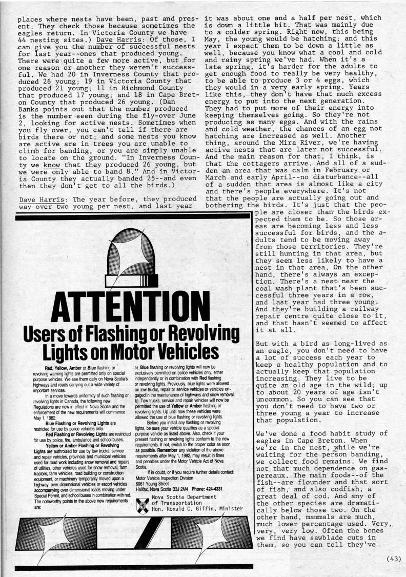 Published by Ronald Caplan on 1982/6/1 (281 reads)places where nests have been, past and pres? ent. They check those because sometimes the eagles return. In Victoria County we have 44 nesting sites.) Dave Harris: Of those, I can give you the number of successful nests for last year--ones that produced young. There were quite a few more active, but for one reason or another they weren't success? ful. We had 20 in Inverness County that pro? duced 26 young; 19 in Victoria County that produced 21 young; 11 in Richmond County that produced 17 young; and 18 in Cape Bret? on County that produced 26 young. (Dan Banks points out that the number produced is the number seen during the fly-over June 2, looking for active nests. Sometimes when you fly over, you can't tell if there are birds there or not; and some nests you know are active are in trees you are.unable to climb for banding, or you are simply unable to locate on the ground. "In Inverness Coun? ty we know that they produced 26 young, but we were only able to band 8." And in Victor? ia County they actually banded 25--and even then they don't get to all the birds.) Dave Harris: The year before, they produced way over two young per nest, and last year AnENTIOH Users of Flashing or Revolving Lights on Motor Vehicles it was about one and a half per nest, which is down a little bit. That was mainly due to a colder spring. Right now, this being May, the young would be hatching; and this year I expect them to be down a little as well, because you know what a cool and cold and rainy spring we've had. When it's a late spring, it's harder for the adults to get enough food to really be very healthy, to be able to produce 3 or 4 eggs, which they would in a very early spring. Years like this, they don't have that much excess energy to put into the next generation. They had to put more of their energy into keeping themselves going. So they're not producing as many eggs. And with the rains and cold weather, the chances of an egg not hatching are increased as well. Another thing, around the Mira River, we're having active nests that are later not successful. And the main reason for that, I think, is that the cottagers arrive. And all of a sud? den an area that was calm in February or March and early April--no disturbance--all of a sudden that area is almost like a city and there's people everywhere. It's not that the people are actually going out and bothering the birds. It's just that the peo? ple are closer than the birds ex? pected them to be. So those ar? eas are becoming less and less successful for birds, and the a- dults tend to be moving away from those territories. They're still hunting in that area, but they seem less likely to have a nest in that area. On the other hand, there's always an excep? tion. There's a nest near the coal wash plant that's been suc? cessful three years in a row, and last year had three young. And they're building a railway repair centre quite close to it, and that hasn't seemed to affect it at all. Red, Yellow, Amber or Blue flashing or revolving warning lights are permitted only on special purpose vehicles. We see them daily on Nova Scotia's highways and roads carrying out a wide variety of important services. In a move towards uniformity of such flashing or revolving lights in Canada, the following new Regulations are now in effect in Nova Scotia and the enforcement of the new requirements will commence fvlay 1,1982. Blue Flashing or Revolving Lights are restricted for use by police vehicles only. a) Blue flashing or revolving lights will now be exclusively permitted on police vehicles only, either independently or in combination with Red flashing or revolving lights. Previously, blue lights were allowed on tow trucks, repair or sen/ice vehicles or vehicles en? gaged in the maintenance of highways and snow removal. b) Tow trucks, service and repair vehicles will now be permitted the use of Yellow or Amber flashing or revolving lights. Up until now these vehicles were allowed the use of blue flashing or revolving lights. Before you install any flashing or revolving lights, be sure your vehicle qualifies as Red Flashing or Revolving Lights are restricted purpose vehicle as listed above. Also, check if your for use by police, fire, ambulance and school buses. Yellow or Amber Flashing or Revolving Lights are authroized for use by tow trucks, service and repair vehicles, provincial and municipal vehicles used for road wori< including snow removal and repairs of utilities, other vehicles used for snow removal, farm tractors, farm vehicles, road building or construction equipment, or machinery temporarily moved upon a highway, over dimensional vehicles or escort vehicles accompanying over dimensional loads moving under Special Permit, and school buses in combination with red. The noteworthy points in the above new requirements present flashing or revolving lights conform to the new requirements. If not, switch to the proper color as soon as possible. Remember any violation of the above requirements after May 1,1982, may result in fines and penalties under the Motor Vehicle Act of Nova Scotia. If in doubt, or if you require further details contact; Motor Vehicle Inspection Division 6061 Young Street Halifax, Nova Scotia B3J 2M4 Phone: 424'31 Nova Scotia Department of Transportation Hon. Ronald C. Giffin, Minister But with a bird as long-lived as an eagle, you don't need to have a lot of success each year to keep a healthy population and to actually keep that population increasing. They live to be quite an old age in the wild; up to about 20 years of age isn't uncommon. So you can see that you don't need to have two or three young a year to increase that population. We've done a food habit study of eagles in Cape Breton. When we're in the nest, while we're waiting for the per'son banding, we collect food remains. We find not that much dependence on gas? pereaux. The main foods--of the fish--are flounder and that sort of fish, 