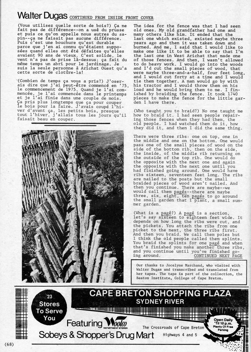 Walter Dugas CONTINUED FROM INSIDE FRONT COVER (Vous utilisez quelle sorte de bois?) Ca ne fait pas de difference--on a use du prusse et puis ce qu'on appelle nous autres du sa- pin--ca ne faisait pas aucune difference. Puis c'est une bouchure qu'est durable parce que j'en ai connu qu'etaient suppo- sees quand elles ont ete defaites qu'elles avaient 90 ans de vieux. C'est solide, le vent n'a pas de prise la-dessus; ca fait du meme temps un abri pour le jardinage. Je suis la seule personne a Arichat Ouest qu'a cette sorte de cloture-la! '(Combien de temps 9a vous a pris?) J'oser- ais dire que j'ai peut-etre commence en '75, le commencement de 1975. Quand je 1'ai com- mencee, je I'ai commencee dans le printemps et je I'ai finie dans une couple de mois, Ca pris plus longtemps que ca pour couper le bois pour la faire, J'avals coupe I'hi- ver d'avant ca, les petits bois, presque tout I'hiver, j'allais tous les jours qu'il faisait beau en couper. The idea for the fence was that I had seen old ones. My old grandfather had one and many others like him. It ended that the last one which existed, existed maybe three years ago and then it was taken down and burned. And me, I said that I would like to make one like it to be able to say that I'm the last one in West Arichat that made one of those fences. And then, I wasn't allowed to do heavy work. I would go into the woods and I'd cut the small pieces of wood, that were maybe three-and-a-half, four feet long, and I would cut forty at a time and I would tie them together. A man would go by with his tractor and I would throw them on his load and he would bring them to me. I fin? ished by braiding the fence. It took 1740 pieces to make the fence for the little gar? den I have there. (Who taught you to braid?) No one taught me how to braid it. I had seen people repair? ing those fences when they had them, the old people, I had watched them do it, how they did it, and then I did the same thing. There were three ribs: one on top, one in the middle and one on the bottom. One would pass one of the small pieces of wood on the side of the bottom rib, then on the side, the inside, of the middle rib returning on the outside of the top rib. One would do the opposite with the next one and again the opposite with the next one until you had finished going around. One would have ribs sixteen, seventeen feet long. The ribs are nailed to the posts but the small braided pieces of wood aren't nailed. And then you continue. There are maybe--we would call them pages--there are maybe three, six, eight, ten pages to go around the small garden that I plant, a small sum? mer garden. (What is a page?) A page is a section, let's say sixteen to eighteen feet wide. It depends on how long the ribs were cut, and the pickets. You attach the ribs from one picket to the next, the three ribs first. And then you braid. We call them poles but I think the old people called them splints. You braid the splints for one page and when that's finished you make another three ribs, and you continue until you've finished go? ing around, CONTINUED NEXT PAGE Our thanks to Jocelyne Marchand, who visited with Walter Dugas and transcribed and translated from her tapes. The tape is part of the collection, the Beaton Institute, College of Cape Breton. Stores To Serve You CAPE BRETON SHOPPING PLAZA SYDNEYRIVER • ' Featuring >W'. ,,' ''''''''' • , ,''' 3''' • • Sobeys & Shopper's Drug Mart "'9'"''''"" = Open Daily • ""'10 p.m. Opei TIM Plenty Of Free