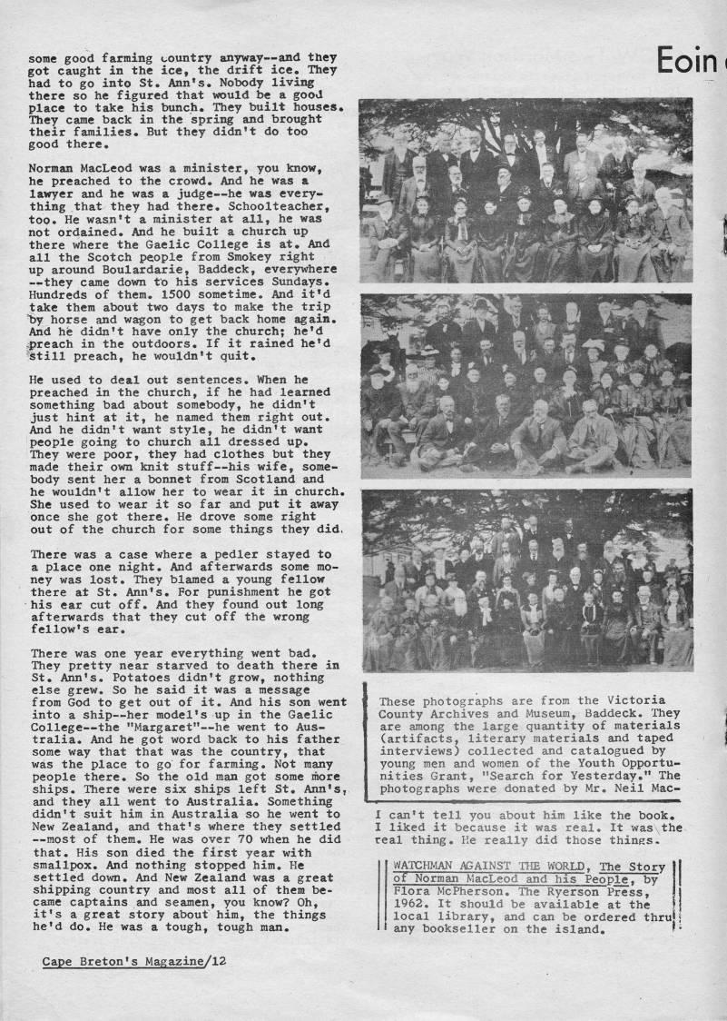 some good farming country amyway • and they got caught in the ice, the drift ice. They had to go into St. Ann's. Nobody living there so he figured that would be a good place to take his bunch. They built houses. They came back in the spring and brought their families. But they didn't do too good there. Norman MacLeod was a minister, you know, he preached to the crowd. And he was a lawyer and he was a judge • he was every? thing that they had there. Schoolteacher, too. He wasn't a minister at all, he was not ordained. And he built a church up there where the Gaelic College is at. And all the Scotch people from Smokey right up around Boulardarie, Baddeck, everywhere • they came down tb his services Sundays. Hundreds of them. 1500 sometime. And it'd take them about two days to make the trip i>y horse and wagon to get back home again. Arid he didn't have only the church; he'd ipreach in the outdoors. If it rained he'd *iStill preach, he wouldn't quit. He used to deal out sentences. When he preached in the church, if he had learned something bad about somebody, he didn't just hint at it, he named them right out. And he didn't want style, he didn't want people going to church all dressed up. Ihey were poor, they had clothes but they made their own knit stuff • his wife, some? body sent her a bonnet from Scotland and he wouldn't allow her to wear it in church. She used to wear it so far and put it away once she got there. He drove some right out of the church for some things they did. There was a case where a pedler stayed to a place one night. And afterwards some mo? ney was lost. They blamed a young fellow there at St. Ann's. For punishment he got his ear cut off. And they found out long afterwards that they cut off the wrong fellow's ear. There was one year everything went bad. They pretty near starved to death there in St. Ann's. Potatoes didn't grow, nothing else grew. So he said it was a message from God to get out of it. And his son went into a ship • her model's up in the Gaelic College • the "Margaret" • he went to Aus? tralia. And he got word back to his father some way that that was the country, that was the place to go for farming. Not many people there. So the old man got some more ships. There were six ships left St. Ann's, and they all went to Australia. Something didn't suit him in Australia so he went to New Zealand, and that's where they settled • most of them. He was over 70 v*ien he did that. His son died the first year with smallpox. And nothing stopped him. He settled down. And New Zealand was a great shipping country and most all of them be? came captains and seamen, you know? Oh, it's a great story about him, the things he'd do. He was a tough, tough man. Eoin These photographs are from the Victoria County Archives and Museum, Baddeck. They are among the large quantity of materials (artifacts, literary materials and taped interviews) collected and catalogued by young men and women of the Youth Opportu? nities Grant, "Search for Yesterday." The photographs were donated by Mr. Neil Mac- I can't tell you about him like the book. I liked it because it was real. It was the real thing. He really did those things. WATCHMAN AGAINST THE WORLD, The Story of Norman MacLeod and his People, by Flora McPherson. The Ryerson Press, J j 1962. It should be available at the 1] local library, and can be ordered thruji • any bookseller on the island. f- Cape Breton's Magazine/12