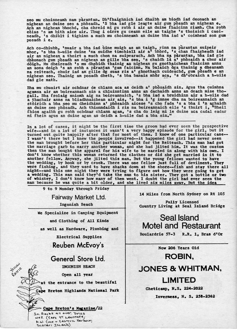 seo mu choinneamh nam par ant an, Dh'fhaighnich iad dhaibh am biodh iad deonach an nighean an duine seo a phbsadh, 'S bha iad gle leagte air gum posadh an nighean e, Ach an nighean bhochd, cha chreid mi gu robh i air an duine fhaicinn riamh, Cha robh eblas 's am bith aice air. Thug i oirre gu ceann eile an taighe 's thoisich i caoi- neadh, 's dhiult i tighinn a mach mu choinneamh an duine bha iad a' coimhead son gum posadh i e, Ach co-dhiubh, 'nuair a bha iad uine muigh as an taigh, rinn na parantan suipeir mhor, 's bha h-uile duine 'na suidhe timchioll air a' bhbrd, 's chan fhaigheadh iad air an nighean a thoirt a mach chon na suipearach, Ach bha na parantan, bha iad gle dheonach gum posadh an nighean an gille bha seo, 's chaidh la a' phosaidh a chur air doigh, Mu dheireadh 's mu dhebidh thainig an nighean gu gnothaichean fhaicinn anns an aona doigh 's an robh a parantan 'gam faicinn, Na balaich bga thainig a dheanamh na reiteach, chuir iad an gille Sg suas ris a' ghnothach cuideachd, gum posadh e an nighean seo. Thainig am posadh dheth, 's bha banais mhbr aca, 's dh'obraich a h-uile dad gle math. Bha mu chuairt air ochdnar de chlann aca as deidh a' phosaidh sin. Agus tha cuimhna agamsa air am boireannach sin a chluinntinn anns an dachaidh anns an deach mise tho- gail. Bha frolaig sniomh aig na boireannaich, 's bha iad a bruidhinn air a h-uile dad a thachair anns na bliadhnaichean air'ais, 's bha i 'g innse dha na boireannaich an stoiridh a bha seo mu dheidhinn a' phosaidh aicese 's cho fada 's a bha i 'n aghaidh an duine seo phosadh. Ach thionndaidh i ris na boireannaich eile 's thuirt i, "Bheil fhios agaibh gu robh ochdnar chlann agam, 's cha do leig mi le duine aca cadal eadar mi fhein agus an duine agam as deidh a h-uile dad a bha sin," In a lot of cases, it might be the first time the groom had ever seen the prospective wife • and in a lot of instances it wasn't a very happy episode for the girl, but it turned out quite happily after that for most of them. I know of one particular case • I wasn't there but I knew the people involved • it happened the girl had never seen the man brought before her this particular night for the Reiteach. This man had got the marriage garb to marry another woman, and she had jilted him. It was the custom then the man bought the apparel for his wife to be married in along with his own. I don't know whether this woman returned the clothes or did she get married in it to another fellow. Anyway, she jilted this man. But the young fellows wanted to have the wedding, by hook or by crook. There was one fellow just full of devilment. They were fishing, and they used to have shacks down at the shore • fish and stay there all night • and this one night they were trying to figure out how they were going to get a wedding. This man said they'd take the man to his sister. They got a bottle or two of whiskey, I don't know how many of them went. I doubt the girl had ever seen the man because he was quite a bit older, and she lived six miles away. But the idea 9 to 9 Monday through Friday Fairway Market Ltd. Ii'onish Beach We Specialize in Camping Equipment and Clothing of All Kinds as well as Hardware, Plumbing and Electrical Supplies Reuben McEvoy's General Store Ltd. INGONISH BEACH Open all year jfP'Sit the entrance to the beautiful ''>I'''''j' Breton Highlands National Park 14 Miles from North Sydney on Rt 105 Fully Licensed Country Living at Seal Island Bridge Seal Island Motel and Restaurant Boulardrie 57-3 R.R. 1, Bras d'Or Now 206 Years Old ROBIN, JONES & WHITMAN, LIMITED Cheticamp, N.S. 224-2022 Inverness, N, S, 258-2362 Cape Breton's Maga2ine/22 1r' Si?.*.-tos ?.'' over. -j>f- z.s