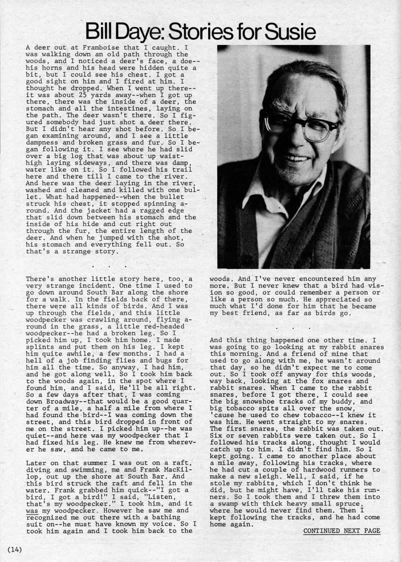 Bill Daye: Stories for Susie A deer out at Framboise that I caught. I was walking down an old path through the woods, and I noticed a deer's face, a doe-- his horns and his head were hidden quite a bit, but I could see his chest. I got a good sight on him and I fired at him. I thought he dropped. When I went up there-- it was about 25 yards away--when I got up there, there was the inside of a deer, the stomach and all the intestines, laying on the path. The deer wasn't there. So I fig? ured somebody had just shot a deer there. But I didn't hear any shot before. So I be? gan examining around, and I see a little dampness and broken grass and fur. So I be? gan following it. I see where he had slid over a big log that was about up waist- high laying sideways, and there was damp, water like on it. So I followed his trail here and there till I came to the river. And here was the deer laying in the river, washed and cleaned and killed with one bul? let. What had happened--when the bullet struck his chest, it stopped spinning a- round. And the jacket had a ragged edge that slid down between his stomach and the inside of his hide and cut right out through the fur, the entire length of the deer. And when he jumped with the shot, his stomach and everything fell out. So that's a strange story. There's another little story here, too, a very strange incident. One time I used to go down around South Bar along the shore for a walk. In the fields back of there, there were all kinds of birds. And I was up through the fields, and this little woodpecker was crawling around, flying a- round in the grass, a little red-headed woodpecker--he had a broken leg. So I picked him up, I took him home. I made splints and put them on his leg. I kept him quite awhile, a few months. I had a hell of a job finding flies and bugs for him all the time. So anyway, I had him, and he got along well. So I took him back to the woods again, in the spot where I found him, and I said. He'll be all right. So a few days after that, I was coming down Broadway--that would be a good quar? ter of a mile, a half a mile from where I had found the bird--I was coming down the street, and this bird dropped in front of me on the street. I picked him up--he was quiet--and here was my woodpecker that I had fixed his leg. He knew me from wherev? er he saw, and he came to me. Later on that summer I was out on a raft, diving and swimming, me and Frank MacKil- lop, out up the shore at South Bar. And this bird struck the raft and fell in the water. Frank grabbed him quick--"I got a bird, I got a bird!" I said,. "Listen, that's my woodpecker." I took him, and it was my woodpecker • However he saw me and recognized me out there with a bathing suit on--he must have known my voice. So I took him again and I took him back to the woods. And I've never encountered him any more. But I never knew that a bird had vis? ion so good, or could remember a person or like a person so much. He appreciated so much what I'd done for him that he became my best friend, as far as birds go. And this thing happened one other time. I was going to go looking at my rabbit snares this morning. And a friend of mine that used to go along with me, he wasn't around that day, so he didn't expect me to come out. So I took off an3rway for this woods, way back, looking at the fox snares and rabbit snares. When I came to the rabbit snares, before I got there, I could see the big snowshoe tracks of my buddy, and big tobacco spits all over the snow, 'cause he used to chew tobacco--I knew it was him. He went straight to my snares. The first snares, the rabbit was taken out. Six or seven rabbits were taken out. So I followed his tracks along, thought I would catch up to him. I didn't find him. So I kept going. I came to another place about a mile away, following his tracks, where he had cut a couple of hardwood runners to make a new sleigh. Well, I said, if he stole my rabbits, which I don't think he did, but he might have, I'll take his run? ners . So I took them and I threw them into a swamp with thick heavy small spruce, where he would never find them. Then I kept following the tracks, and he had come home again. CONTINUED NEXT PAGE-