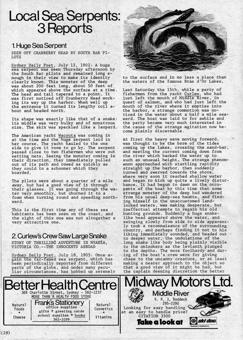 Published by Ronald Caplan on 1982/8/1 (849 reads)Local Sea Serpents: 3 Reports 1. Huge Sea Serpent SEEN OFF CRANBERRY HEAD BY SOUTH BAR PI? LOTS Sydney Daily Post, July 12, 1902: A huge sea serpent was seen Thursday afternoon by the South Bar pilots and remained long e- nough in their view to make its identity clearly known. This monster of the deep was about 200 feet long, about 50 feet of which appeared above the surface at a time. The head and tail tapered to a point. It was first noticed off Cranberry Head work? ing its way up the harbor. When well up the entrance it turned its lengthy coil a- bout and headed north. Its shape was exactly like that of a snake: its middle was very bulky and of monstrous size. The skin was speckled like a leopard. The American yacht Wacouta was coming in at the time and the huge serpent laid in her course. The yacht hauled to the one side to give it room to go by. The serpent passed close to two fishermen who were out setting nets. Seeing the monster coming in their direction, they immediately pulled out of its path and rowed as quickly as they could to a schooner which they boarded. The pilots were about a quarter of a mile away, but had a good view of it through their glasses. It was going through the wa? ter very smoothly, but churned it to a foam when turning round and speeding north? ward. This is the first time any of these sea habitants has been seen on the coast, and the sight of this one was not altogether a very attractive one. 2. Curlew's Crew Saw Large Snake STORY OF THRILLING ADVENTURE IN NYAN2A, VICTORIA CO.--THE INNOCENTS ABROAD Sydney Daily Post, July 18, 1905: Once a- gain the far-famed sea serpent, which has been periodically reported from different parts of the globe, and under many pecu? liar circumstances, has bobbed up serenely to the surface and in no less a place than the waters of the famous Bras d'Or Lakes. Last Saturday the 15th, while a party of fishermen from the yacht Curlew, who had just left the mouth of Middle River, in quest of salmon, and who had just left the mouth of the river where it empties into the harbor, a strange commotion was no? ticed in the water about a half a mile sea? ward. The boat was laid to for awhile and the party became very much interested in the cause of the strange agitation now be? come plainly discernable. At first the heavy wave moving forward, was thought to be the bore of the tides coming up the lakes, crossing the sand-bar, and meeting the current coming down from the river which backed the water up to such an unusual height. The strange phenom? enon approached with startling rapidity straight up the harbor, then suddenly turned and swerved towards the shore, where very soon it reached shallow water and began to kick up quite a lively distur? bance. It had begun to dawn on the. occu? pants of the boat by this time that some strange monster of the deep had wandered from his usual deep-sea haunts, and find? ing himself in the unaccustomed land? locked waters, was making desperate, but ineffectual attempts to regain his old hunting grounds. Suddenly a huge snake? like head appeared above the water, and swinging slowly from side to side apparent? ly took a reconnaisance of the surrounding country, and perhaps finding it not to his liking immediately sounded, and headed out - to deeper water, the undulations of the long snake like body being plainly visible to the onlookers as the levianth plunged to the depths. The more foolhardy and dar? ing of the boat's crew were for giving chase to the uncanny creature, or at least making a nearer approach to the object so that a good view of it might be had, but the captain deeming discretion the better Better Health Centre 369 Charlotte Street, Sydney - 562-1237 MORE THAN 'A HEALTH FOOD STORE Natural Foods Cheese Franks Stationery office supplies gifts * greeting cards school supplies * books 562-3199 Natural Cosmetics Vitamins (28) Midway Motors Ltd Middle River R. R. 3, Baddeck 295-2290 Looking for easy handling at an easy to handle price CITATION 3500 Tokealookot