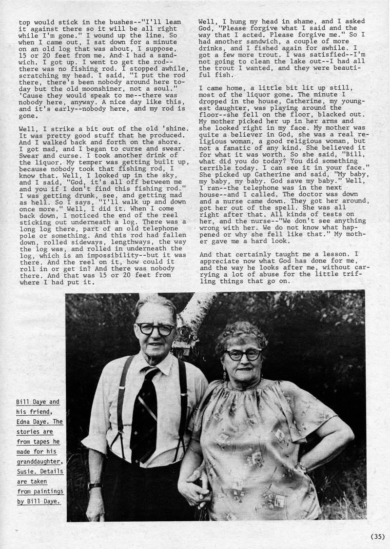 Published by Ronald Caplan on 1982/8/1 (299 reads)top would stick in the bushes--"I'11 lean it against there so it will be all right while I'm gone." I wound up the line. So when I came out, I sat down for a minute on an old log that was about, I suppose, 15 or 20 feet from me. And I had a sand? wich. I got up. I went to get the rod-- there was no fishing rod. I stopped awhile, scratching my head. I said, "I put the rod there, there's been nobody around here to? day but the old moonshiner, not a soul." 'Cause they would speak to me--there was nobody here, anyway. A nice day like this, and it's early--nobody here, and my rod is gone. Well, I strike a bit out of the old 'shine. It was pretty good stuff that he produced. And I walked back and forth on the shore. I got mad, and I began to curse and swear. Swear and curse. I took another drink of the liquor. My temper was getting built up, because nobody took that fishing rod, I know that. Well, I looked up in the sky, and I said, "God, it's all off between me and you if I don't find this fishing rod." I was getting drunk, see, and getting mad as hell. So I says, "I'll walk up and down once more." Well, I did it. When I come back down, I noticed the end of the reel sticking out underneath a log. There was a long log there, part of an old telephone pole or something. And this rod had fallen down, rolled sideways, lengthways, the way the log was, and rolled in underneath the log, which is an impossibility--but it was there. And the reel on it, how could it roll in or get in? And there was nobody there. And that was 15 or 20 feet from where I had put it. Well, I hung my head in shame, and I asked God, "Please forgive what I said and the way that I acted. Please forgive me." So I had another sandwich, a couple of more drinks, and I fished again for awhile. I got a few more trout. I was satisfied--I'm not going to clean the lake out--I had all the trout I wanted, and they were beauti? ful fish. I came home, a little bit lit up still, most of the liquor gone. The minute I dropped in the house, Catherine, my young? est daughter, was playing around the floor--she fell on the floor, blacked out. My mother picked her up in her arms and she looked right in my face. My mother was quite a believer in God, she was a real re? ligious woman, a good religious woman, but not a fanatic of any kind. She believed it for what it was worth. So she said, "Bill, what did you do today? You did something terrible today. I can see it in your face." She picked up Catherine and said, "My baby, my baby, my baby. God save my baby." Well, I ran--the telephone was in the next house--and I called. The doctor was down and a nurse came down. They got her around, got her out of the spell. She was all right after that. All kinds of tests on her, and the nurse--"We don't see anything wrong with her. We do not know what hap? pened or why she fell like that." My moth? er gave me a hard look. And that certainly taught me a lesson. I appreciate now what God has done for me, and the way he looks after me, without car? rying a lot of abuse for the little trif? ling things that go on. (35)