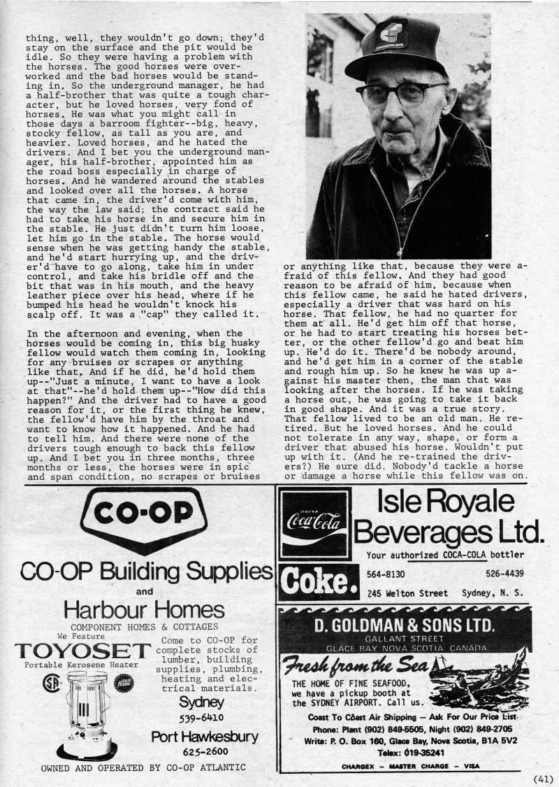 Published by Ronald Caplan on 1982/8/1 (328 reads)thing, well, they wouldn't go down; they'd stay on the surface and the pit would be idle. So they were having a problem with the horses. The good horses were over? worked and the bad horses would be stand? ing in. So the underground manager, he had a half-brother that was quite a tough char? acter, but he loved horses, very fond of horses. He was what you might call in those days a barroom fighter--big, heavy, stocky fellow, as tall as you are, and heavier. Loved horses, and he hated the drivers. And I bet you the underground man? ager, his half-brother, appointed him as the road boss especially in charge of horses. And he wandered around the stables and looked over all the horses. A horse that came in, the driver'd come with him, the way the law said; the contract said he had to take' his horse in and secure him in the stable. He just didn't turn him loose, let him go in the stable. The horse would sense when he was getting handy the stable, and he'd start hurrying up, and the driv? er 'd have to go along, take him in under control, and take his bridle off and the bit that was in his mouth, and the heavy leather piece over his head, where if he bumped his head he wouldn't knock his scalp off. It was a "cap" they called it. In the afternoon and evening, when the horses would be coming in, this big husky fellow would watch them coming in, looking for any bruises or scrapes or anything like that,. And if he did, he'd hold them up--"Just a minute, I want to have a look at that"--he'd hold them up--"How did this happen?" And the driver had to have a good reason for it, or the first thing he knew, the fellow'd have him by the throat and want to know how it happened. And he had to tell him. And there were none of the drivers tough enough to back this fellow up. And I bet you in three months, three months or less, the horses were in spic and span condition, no scrapes or bruises or anything like that, because they were a- fraid of this fellow. And they had good reason to be afraid of him, because when this fellow came, he said he hated drivers, especially a driver that was hard on his horse. That fellow, he had no quarter for them at all. He'd get him off that horse, or he had to start treating his horses bet? ter, or the other fellow'd go and beat him up. He'd do it. There'd be nobody around, and he'd get him in a corner of the stable and rough him up. So he knew he was up a- gainst his master then, the man that was looking after the horses. If he was taking a horse out, he was going to take it back in good shape. And it was a true story. That fellow lived to be an old man. He re? tired. But he loved horses. And he could not tolerate in any way, shape, or form a driver that abused his horse. Wouldn't put up with it. (And he re-trained the driv? ers?) He sure did. Nobody'd tackle a horse or damage a horse while this fellow was on. CO-OP COOP Building Supplies and Harbour Homes COMPONENT HOMES & COTTAGES We Feature Portable Kerosene Heater '''''' ''''''' ''.' Come to CO-OP for I CJ V'CJ''I"'" I complete stocks of '' • ''"-' - • ? lumber, building supplies, plumbing, heating and elec- Ififi iiiTii]l|| 'mF trical materials . Sydney 539-6J'i'10 Port Hawkesbury 625-2600 OraED AND OPERATED BY CO-OP ATLANTIC Isle Royale Beverages Ltd. Your authorized COCA-COLA bottler 564-8130 526-4439 245 Welton Street Sydney. N. S. THE HOME OF FINE SEAFOOD, we have a pickup booth at the SYDNEY AIRPORT. Call us. Coast To Cdast Air Shipping • Ask For Our Price List- Phone: Plant (902) 849-5505, Night (902) 849-2705 Write: P. O. Box 160, Glace Bay, Nova Scotia, BI A 5V2 Telex: 619-35241 CHARGEX - MUSTCR CHARGE - VISA (41)