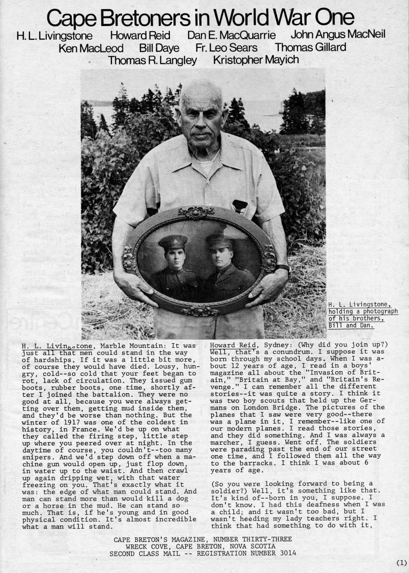 Cape Bretoners in World War One H. L. Livingstone Howard Reid Dan E. MacQuarrie John Angus MacNeil Ken MacLeod BillDaye Fr. Leo Sears Thomas Gillard Thomas R. Langley Kristopher Mayich H. L. Living,otone, Marble Mountain: It was just all that men could stand in the way of hardships. If it was a little bit more, of course they would have died. Lousy, hun? gry, cold--so cold that your feet began to rot, lack of circulation. They issued giom boots, rubber boots, one time, shortly af? ter I joined the battalion. They were no good at all, because you were always get? ting over them, getting mud inside them, and they'd be worse than nothing. But the winter of 1917 was one of the coldest in history, in France. We'd be up on what they called the firing step, little step up where you peered over at night. In the daytime of course, you couldn't--too many snipers. And we'd step down off when a ma? chine gun would open up, just flop down, in water up to the waist. And then crawl up again dripping wet, with that water freezing on you. That's exactly what it was: the edge of what man could stand. And man can stand more than would kill a dog or a horse in the mud. He can stand so much. That is, if he's young and in good physical condition. It's almost incredible what a man will stand. Howard Reid, Sydney: (Why did you join up?) Well, that's a conundrum. I suppose it was bom through my school days. When I was a- bout 12 years of age, I read in a boys' magazine all about the "Invasion of Brit? ain," "Britain at Bay," and "Britain's Re? venge." I can remember all the different stories--it was quite a story. I think it was two boy scouts that held up the Ger? mans on London Bridge. The pictures of the planes that I saw were very good--there was a plane in it, I remember--like one of our modem planes. I read those stories, and they did something. And I was always a marcher, I guess. Went off. The soldiers were parading past the end of our street one time, and I followed them all the way to the barracks. I think I was about 6 years of age. (So you were looking forward to being a soldier?) Well, it's something like that. It's kind of--born in you, I suppose. I don't know. I had this deafness when I was a child; and it wasn't too bad, but I wasn't heeding my lady teachers right. I think that had something to do with it. CAPE BRETON'S MAGAZINE, NUMBER THIRTY-THREE WRECK COVE, CAPE BRETON, NOVA SCOTIA SECOND CLASS MAIL -- REGISTRATION NUMBER 3014 (1)