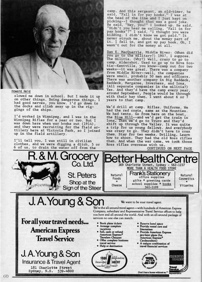 Published by Ronald Caplan on 1983/6/1 (777 reads)Howard Keid slowed me down in school. But I made it up on other things. Doing dangerous things. I had good nerves, you know. I'd go down to the docks and climb away up in the rig? gings of the ships. I'd worked in Winnipeg, and I was in the Winnipeg Rifles for a year or two. But I was down here when war broke out (1914), and they were recruiting for the field ar? tillery here at Victoria Park, so I joined up in the field artillery. I'll tell you, I was still in civilian clothes, and we were digging a ditch, 5 or 6 of us, to drain the water off from the camp. And this sergeant, an old-timer, he said, "Fall in for pay books." I was at the head of the line and I just kept on picking--I thought that was a good joke. He said, "Hey, you!" I looked up. He said, "Didn't you hear me calling, 'Fall in for pay books'?" I said, "I thought you were kidding. I didn't know we got paid." It never struck me, about the money part of it. I fell in, and got my pay book. Oh, I wasn't out for the money at all. Dan E. MacQuarrie, Middle River: (When did you go to the military?) 1907, I suppose. The militia. (Why?) Well, crazy to go to camp. Aldershot. Used to go up to Nova Sco- tia--Kentville, you know--camp out for two weeks--it was great. There was a company from Middle River--well, the companies were small, probably 50 men and officers. There was another company in Big Baddeck, Baddeck, Margaree, Inverness, and lona. (All separate companies in the militia?) Yes. And they'd have the camp every year, around September, People would be through with their hay then. I went about 6 or 7 years to that camp. We'd drill at camp. Rifles. Uniforms. We had the red coats, same as the Mounties. We had tents. Go from here on the boat, the Blue Hill--and we'd get the train in lona. Then we'd go to Truro and they'd shift up through the Valley. It was quite a trip for us young fellows. And everybody was crazy to go. They didn't have to coax them. Stay for two weeks. Drilling. Leam how to shoot. They had the old Ross rifles then. And when the war came, we took those Ross rifles overseas with us. CONTINUED ON NEXT PAGE R. & M. Grocery -' Co. Ltd St. Peters Shop at the r Sign of the Steer Better Health Centre 369 Charlotte Street, Sydney - 562-1237 MORE THAN A HEALTH FOOD STORE Natural Foods Cheese Frank'StatJonery office supplies gifts * greeting cards school supplies * books 562-3199 Natural Cosmetics Vitamins J.A.Young&Son; We want to be vour travel agent. (2) For all your travel needs' American Express Travel Service J.A.Young&Sm; Insurance & Travel Agent 181 Charlotte Street Sydney, N.S. 539-'800 We're the all-around travel agent • with hundreds of American Express Company, subsidiary and Representative Travel Service offices to help you here and all around the world. And with an all-around, package of services no one else can match: • Book plane tickets • Arrange complete vacations • Sell, cash or refund American Express? Travelers Cheques ? Offer complete business travel service • Help at destination • Reserve hotel space • Provide rental cars and limousines • Provide American Express pay'later plans (for American Express? Gtrdmembers) • A unique combination of travel financial services rA Don't leave home without us.'"
