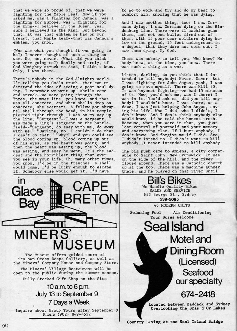 Published by Ronald Caplan on 1983/6/1 (525 reads)that we were so proud of, that we were fighting for the Maple Leaf. Now if you asked me, was I fighting for Canada, was I fighting for Europe, was I fighting for the King--I believe in the Queen, yes, sure I believed in the King. But beyond that, it was that emblem we had on our breast, that Maple Leaf--that was Canada's emblem, you know. (Was war what you thought it was going to be?) I never thought of such a thing as war. No, no, never. (What did you think you were going to?) Really and truly, if God Almighty struck me dead, I didn't know. Only, I was there. There's nobody in the God Almighty world-- I'm telling you God's truth--that can un? derstand the idea of seeing a poor soul dy? ing. I remember we went up--shells came and struck--we were going through the Ypres, the moat line, you know--and that was all concrete. And when shells drop on concrete, she scatters. A fellow got shrap? nel shell through the head, in his temple-- pierced right through. I was on my way up the line. "Sergeant"--I was a sergeant; I was made a King's sergeant on the battle- field--"Sergeant, do away with me, do away with me." "Darling, no, I couldn't do that. I can't do that." "Why?" And you could see the blood coming up, blood coming up out of his eyes, as the heart was going, and then the heart was easing up, the blood was easing, and away he went. It's the sad? dest and the horriblest thing that ever you see in your life. Oh, many other times, you know, I'd be in the trenches, a shell would come, I'd be lucky enough to escape it. Somebody else would get it. I'd have "to go to work and try and do my best to comfort him, knowing that he was dying. And I saw another thing, too: I saw Ger? mans dying. I saw Germans dying on the Hin- denburg line. There were 21 machine guns there, and not one bullet fired out of them, with 15 poor dear soldiers dying be? low on the ground, 15 feet underground in a dugout, that they dare not come out. I saw them dying. My God. There was nobody to tell you. Who knew? No? body knew, at the time, you know. There was such a thing as a war. Listen, darling, do you think that I in? tended to kill anybody? Never. Never. But I was fighting for John Angus, yeah, I was going to save myself. There was Hill 70. It was bayonet fighting--we had 15 minutes of it. Now, you'd ask me, was I there? I was in it. You'd ask me, did you kill any? body? I wouldn't know. I was there, as a daze. I was just helping John Angus, sav? ing his life. Who I did, who I didn't, I don't know. And I don't think anybody else would know, if he told the honest truth. Because, when you were in that, you just lost control of yourself and your memory and everything else. If I hurt anybody, I don't know. God forgive me if I did. See, I didn't intend to. I didn't want to kill anybody. .1 never intended to kill anybody. The big push came to Amiens, a city compar? able to Saint John, New Brunswick. It was on the side of the hill, and the river flowed around. There was a Catholic church up at the top. There was a machine gunner there, and he played on that river until in Glace Bay CAPE BRETON MINERS' MUSEUM The Museum offers guided tours of its own Ocean Deeps Colliery, as well as the Miners' Company House and Company Store. The Miners' Village Restaurant will be open to the public during the summer season. Fully Stocked Gift Shop on the Site 10 a.m. to 6 p.m. July 13 to September 9 7 Days a Week Inquire about Group Tours after September 9 Phone (902) 849-4522 Bill's Bikes We Handle Quality Bikes SALES AND SERVICE 653 George St., Sydney 539-5095 _ (6) 46 MODERN UNITS Swimming Pool Air Conditioning Tour Buses Welcome Seallsland A Motel and ''' Dining Fk)om ''''L (Licensed) 'V''B Seafood ''V our specialty '[''''' Located bei ''''F Overlookii Country j-iving at the Seal Island Bridge 674-2418 Located between Baddeck and Sydney Overlooking the Bras d'Or Lakes