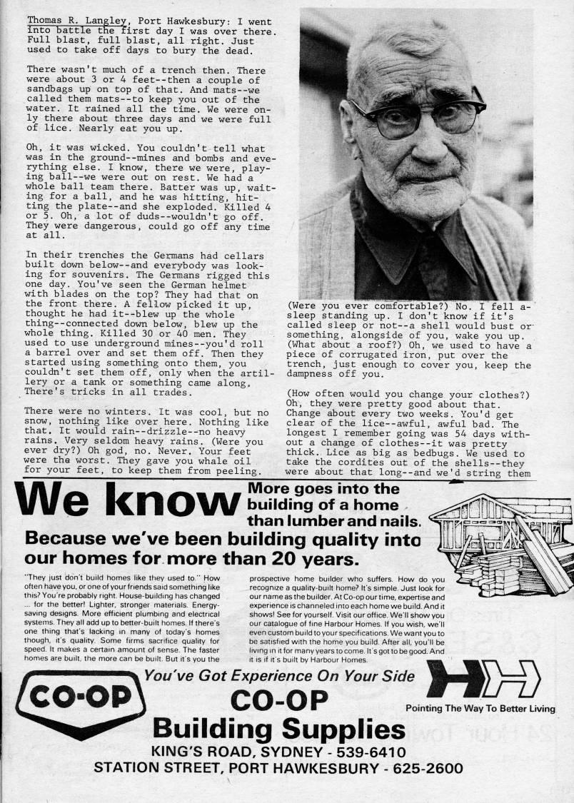 Published by Ronald Caplan on 1983/6/1 (422 reads)Thomas R. Langley, Port Hawkesbury: I went into battle the first day I was over there. Full blast, full blast, all right. Just used to take off days to bury the dead. There wasn't much of a trench then. There were about 3 or 4 feet--then a couple of sandbags up on top of that. And mats--we called them mats--to keep you out of the water. It rained all the time. We were on? ly there about three days and we were full of lice. Nearly eat you up. Oh, it was wicked. You couldn't tell what was in the ground--mines and bombs and eve? rything else, I know, there we were, play? ing ball--we were out on rest. We had a whole ball team there. Batter was up, wait? ing for a ball, and he was hitting, hit? ting the plate--and she exploded. Killed 4 or 5. Oh, a lot of duds--wouldn't go off. They were dangerous, could go off any time at all. In their trenches the Germans had cellars built down below--and everybody was look? ing for souvenirs. The Germans rigged this one day. You've seen the German helmet with blades on the top? They had that on the front there. A fellow picked it up, thought he had it--blew up the whole thing--connected down below, blew up the whole thing. Killed 30 or 40 men. They used to use underground mines--you'd roll a barrel over and set them off. Then they started using something onto them, you couldn't set them off, only when the artil? lery or a tank or something came along. There's tricks in all trades. There were no winters. It was cool, but no snow, nothing like over here. Nothing like that. It would rain--drizzle-'no heavy rains. Very seldom heavy rains. (Were you ever dry?) Oh god, no. Never. Your feet were the worst. They gave you whale oil for your feet, to keep them from peeling. (Were you ever comfortable?) No. I fell a- sleep standing up. I don't know if it's called sleep or not--a shell would bust or- something, alongside of you, wake you up, (What about a roof?) Oh, we used to have a piece of corrugated iron, put over the trench, just enough to cover you, keep the dampness off you. (How often would you change your clothes?) Oh, they were pretty good about that. Change about every two weeks. You'd get clear of the lice--awful, awful bad. The longest I remember going was 54 days with? out a change of clothes--it was pretty thick. Lice as big as bedbugs. We used to take the cordites out of the shells--they were about that long--and we'd string them mi|f I More goes into the VV6 KnOWb""d;"9?f?ho'T,e' ' than lumber and nails. ' Because vue've been building quality into our homes f or more than 20 years. "They just don't build homes like they used to." How often have you, or one of your friends said something like this? You're probably right. House-building has changed ... for the better! Lighter, stronger materials. Energy- saving designs. More efficient plumbing and electrical systems. They all add up to better-built homes. If there's one thing that's lacking in many of today's homes though, it's quality. Some firms sacrifice quality for speed. It makes a certain amount of sense. The faster homes are built, the more can be built. But it's you the prospective home builder who suffers. How do you recognize a quality-built home? It's simple. Just look for our name as the builder. At Co-op our time, expertise and experience is channeled into each home we build. And it shows! See for yourself. Visit our office. We'll show you our catalogue of fine Harbour Homes. If you wish, we'll even custom build to your specifications. We want you to be satisfied with the home you build. After all, you'll be ving in it for many years to come. Its got to be good. And CO-OP it is if it's built by Harbour Homes. Mi' 1H'T~ T~A You've Got Experience On Your Side 'P"W/ J • i ) Pointing The Way To Better Living CO-OP Building Supplies KING'S ROAD, SYDNEY - 539-6410 STATION STREET, PORT HAWKESBURY - 625-2600