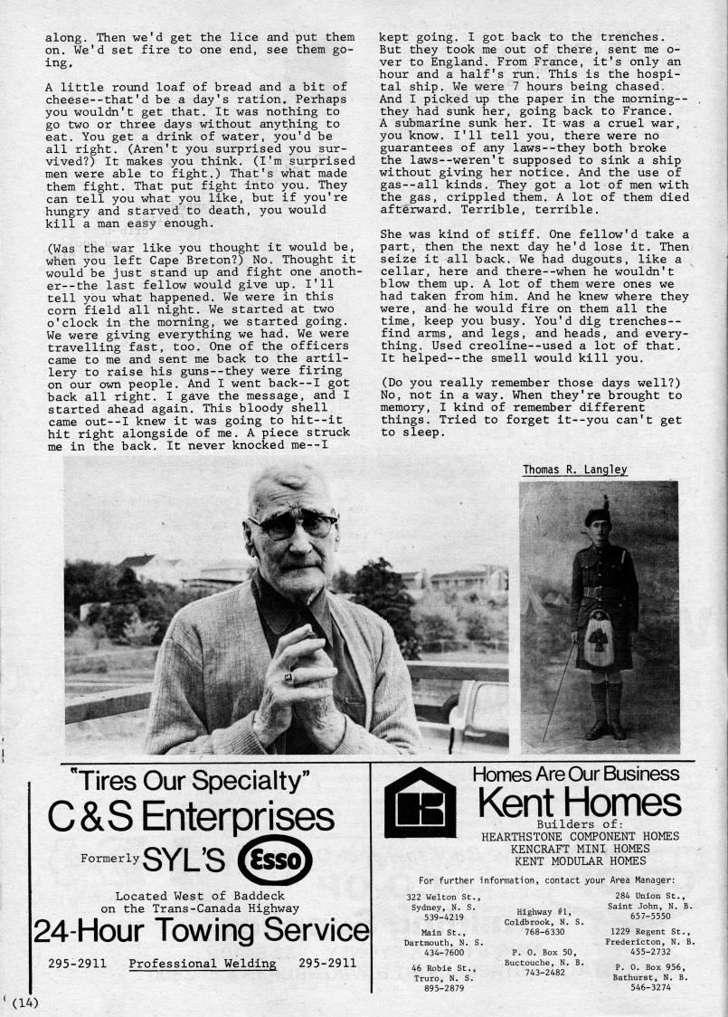 Published by Ronald Caplan on 1983/6/1 (395 reads)along. Then we'd get the lice and put them on. We'd set fire to one end, see them go? ing, A little round loaf of bread and a bit of cheese--that'd be a day's ration. Perhaps you wouldn't get that. It was nothing to go two or three days without anything to eat. You get a drink of water, you'd be all right. (Aren't you surprised you sur? vived?) It makes you think. (I'm surprised men were able to fight.) That's what made them fight. That put fight into you. They can tell you what you like, but if you're hungry and starved to death, you would kill a man easy enough. (Was the war like you thought it would be, when you left Cape Breton?) No. Thought it would be just stand up and fight one anoth- er--the last fellow would give up. I'll tell you what happened. We were in this corn field all night. We started at two o'clock in the morning, we started going. We were giving everything we had. We were travelling fast, too. One of the officers came to me and sent me back to the artil? lery to raise his guns--they were firing on our own people. And I went back--I got back all right. I gave the message, and I started ahead again. This bloody shell came out--I knew it was going to hit--it hit right alongside of me. A piece struck me in the back. It never knocked me--I kept going. I got back to the trenches. But they took me out of there, sent me o- ver to England. From France, it's only an hour and a half's run. This is the hospi? tal ship. We were 7 hours being chased • And I picked up the paper in the morning-- they had sunk her, going back to France. A submarine sunk her. It was a cruel war, you know. I'll tell you, there were no guarantees of any laws--they both broke the laws--weren't supposed to sink a ship without giving her notice. And the use of gas--all kinds. They got a lot of men with the gas, crippled them. A lot of them died afterward. Terrible, terrible. She was kind of stiff. One fellow'd take a part, then the next day he'd lose it. Then seize it all back. We had dugouts, like a cellar, here and there--when he wouldn't blow them up. A lot of them were ones we had taken from him. And he knew where they were, and he would fire on them all the time, keep you busy. You'd dig trenches-- find arms, and legs, and heads, and every? thing. Used creoline--used a lot of that. It helped--the smell would kill you. (Do you really remember those days well?) No, not in a way. When they're brought to memory, I kind of remember different things. Tried to forget it--you can't get to sleep. Thomas R. Langley Tires Our Specialty" C&S; Enterprises Formerly Located West of Baddeck on the Trans-Canada Highway 24-Hour Towing Service 295-2911 Professional Welding 295-2911 Homes Are Our Business Kent Homes Builders of: HEARTHSTONE COMPONENT HOMES KENCRAFT MINI HOMES KENT MODULAR HOMES For further information, contact your Area Manager: 322 Welton St. Sydney, N. S. 539-4219 Main St., Dartmouth, N. S 434-7600 46 Robie St., Truro, N. S. 895-2879 Highway #1, Coldbrook, N. S. 768-6330 P. 0. Box 50, Buctouche, N. B. 743-2482 284 Union St., Saint John, N. B 657-5550 1229 Regent St., Fredericton, N. B 455-2732 P. 0. Box 956, Bathurst, N. B. 546-3274 (14)