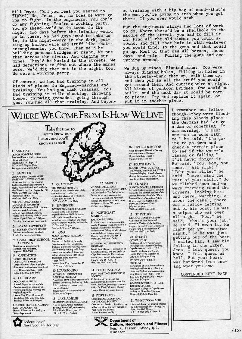 Published by Ronald Caplan on 1983/6/1 (394 reads)Bill Daye: (Did you feel you wanted to fight?) No, Jesus, no, no idea we were go? ing to fight. In the engineers, you don't do any fighting. You're a working party. You go ahead--we'd be in towns in the night, two days before the infantry would go in there. We had guys used to take us in, in the night--work in the dark, put? ting up barbed wire and stuff like that-- entanglements, you know. Then we'd be building pontoon bridges at night. We put them across the rivers. And digging out mines. They'd be buried in the streets. We had detections to find out where the mines were. We'd dig them out in the night, too. We were a working party. Of course, we had had training in all kinds of places in England--marches and training. You had gas mask training. You had training in rifle shooting, throwing bombs, throwing grenades, going through gas. You had all that training. And bayon- i ake the time to get to know our history and you'i know us as well. 1 ARICHAT LENOIR FORGE MUSEUM Restored French 18th century stone blacksmith shop. Hours: June 15-Sept. 15 9:00 a.m.-5:00 p.m. Daily For appointment 226-2051 2 BADDECK ALEXANDER GRAHAM BELL NATIONAL HISTORIC PARK A modern interpretive complex highlighting Bell's experiments in flight, hydrofoils and work with the deaf. Hours: July 1 to September 30 9:00 a.m.-9:00 p.m. Daily Remainder of the Year 9:00 a.m.-5:00 p.m. Daily THE VICTORIA COUNTY MUSEUM & ARCHIVES Gilbert H. Grosvenor Hall. Houses a large and varied collection of archival material and artifacts, related to the history of the County Hours: Open 9:00 a.m.-5:00 p.m. Opening Date not yet determined. 3 BAY ST. LAWRENCE LITTLE RED SCHOOL HOUSE Summer months only • check locally for times of opening. 4 CABOT HIGH SCHOOL ARCHIVES Summer by appointment, contact Fred Williams, Ingonish 285-2605 5 CAPE NORTH NORTH HIGHLAND COMMUNITY MUSEUM Large collection of photographs, documents and artifacts from local area. Hours: Mid June - Sept. 10:00 a.m.-6:00 p.m. Daily and 6 CHETICAMP ACADIAN MUSEUM A small display of relics of the Acadian people of this district. Featuring spinning, rug-hooking crafts. Hours: May 15 to October 15 Weekdays 8:00 a.m.-9:00 p.m. Sundays 9:00 a.m..9:00 p.m. LES TROIS PIGNONS; ACADIAN I CULTURAL CENTRE. Hours: All year • 9 a.m.-7 p.m. Seven days a week 7 GLACE BAY THE MINERS MUSEUM A focus on the contribution of the coal miner and coal in the continuing advance of civilization. Hours: June 15-Sept. 4 10:00 a.m.-6:00 p.m. Daily 8 INVERNESS INVERNESS MINERS MUSEUM Housed in the C.N. Station originally built in 1901. Museum reflects the mining history and includes a tape collection and small archives. Hours: Monday to Saturday 10:00 a.m.-7:00 p.m. Sunday 1:00 p.m.-5:00 p.m. 9 lONA NOVA SCOTIA HIGHLAND VILLAGE Devoted to the life of the early Scottish settlers in Nova Scotia. Includes a museum building, house (1875-1900), carding mill, forge, country store, school, barn, log cabin, a frame house (1850) and Hebridean stone house or "Tigh Dubh". Hours: June 15 to September 15 10:00 a.m.-6:00 p.m. 10 LOUISBOURG SYDNEY &. LOUISBOURG RAILWAY MUSEUM A restored 1895 railway station with exhibits describing the history of the S & L, railway technology, and 11 LAKEAINSLIE MacDONALD HOUSE MUSEUM (run by Lake Ainslie Historical Society) Route 395, overlooking Lake Ainslie. Hours: June 15 Sept. 1-9-5 • 5 days 12 MABOU MABOU GAELIC AND HISTORICAL SOCIETY MUSEUM An DrcKhaid • The Bridge • in former store used a& centre for crafts, genealogical and historical records and research • local music and poetry Hours: Weekdays 10:00 a.m.-4:00 p.m. 13 NORTHEAST MARGAREE SALMON MUSEUM Exhibits related to salmon angling on the Margaree River. Housed in a former schoolhouse. Excellent collections of fishing tackle, photos, memorabilia of famous anglers. Hours: June 15 to October 15 9:00 a.m.-5:00 p.m. Daily MUSEUM OF CAPE BRETON HERITAGE North East Margaree. Collection of household items, arts and crafts of Cape Breton origin. Emphasis on textile patterns and techniques. Hours: June 15-Oct. 15 9:00 a.m.-6:00 p.m. Daily 14 PORT HASTINGS PORT HASTINGS HISTORICAL SOCIETY Collection of pictures of the community and residents over the years. Artifacts, genealogy, cemetery index. St. David's United Church Hours: Check at Tourist Bureau 15 PORT HOOD CHESTICO MUSEUM AND HISTORICAL SOCIETY Contains a collection of artifacts that tell of the life of the early settlers of Port Hood and District. Hours: Enquire locally. et training with a big bag of sand--that's the man you're going to stab when you get there. If you ever would stab. But the engineers always had lots of work to do. Where there'd be a shellhole in the middle of the street, you had to fill it in. Find all the old timber you could a- round, and fill that hole in with whatever you could find, so the guns and that could go up. Most of that was all horses, those days. And mules. Pulling the guns and eve? rything around. We dug up mines. Planted mines. You were always digging holes, filling in holes in the streets • bank them up, crib them up, and then put in all the stuff you could get around them. And cutting wire at night. All kinds of pontoon bridges. One would be built, and the next day it would be torn to pieces. Try and replace it again, or put it in another place. I remember one fellow though--they were flood? ing this bloody place-- the Germans had let go a dam or something. It was morning. "I want one man to come with me," he said, "I'm go? ing to go down and check a certain place to see if the water's rising or falling." I'll never forget it. He said, "You, boy, you come." "All right." "Take your rifle," he said, "never mind the rest of your stuff." So we climbed down and we were creeping round the comers, looking here and there, watching. A- cross the canal, there was a fellow getting out of his boat. He was a sniper who was over all night. "Now," he said, "that's your job." He said, "I 