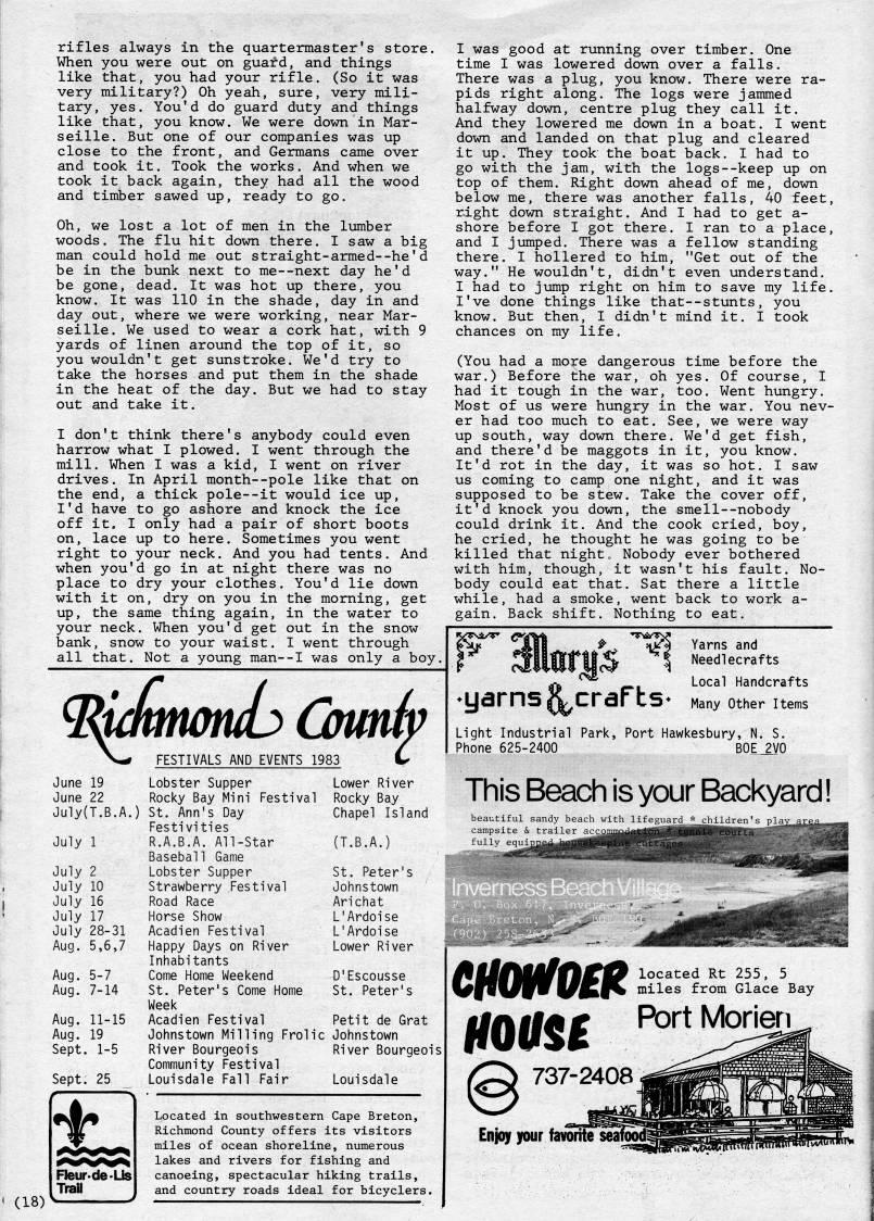Published by Ronald Caplan on 1983/6/1 (381 reads)rifles always in the quartermaster's store. When you were out on guard, and things like that, you had your rifle. (So it was very military?) Oh yeah, sure, very mili? tary, yes. You'd do guard duty anUs Trail Lobster Supper Rocky Bay Mini Festival ) St. Ann's Day Festivities R.A.B.A. All-Star Baseball Game Lobster Supper Strawberry Festival Road Race Horse Show Acadien Festival Happy Days on River Inhabitants Come Home Weekend St. Peter's Come Home Week Acadien Festival Johnstown Milling Frolic River Bourgeois Community Festival Louisdale Fall Fair Located in southwestern Riclimond County offers Lower River Rocky Bay Chapel Island (T.B.A.) St. Peter's Johnstown Arichat L'Ardoise L'Ardoise Lower River D'Escousse St. Peter's Petit de Grat Johnstown River Bourgeois Louisdale Cape Breton, its visitors miles of ocean shoreline, numerous lakes and rivers for fishing and canoeing, spectacular hiking trails. and country roads ideal for bicyclers. 'yarnsR, crafts* Yarns and Needlecrafts Local Handcrafts Many Other Items Light Industrial Park, Port Hawkesbury, N. S. Phone 625-2400 B0E'2y0 This Beach is your Backyard! beautiful sandy beach with lifeguard * children's play campsite & trailer ac??' fully equ' located Rt 255, 5 miles from Glace Bay mmoeft UQM • P'i't Morieri 737-2408 Enjojf jmr favorite seal