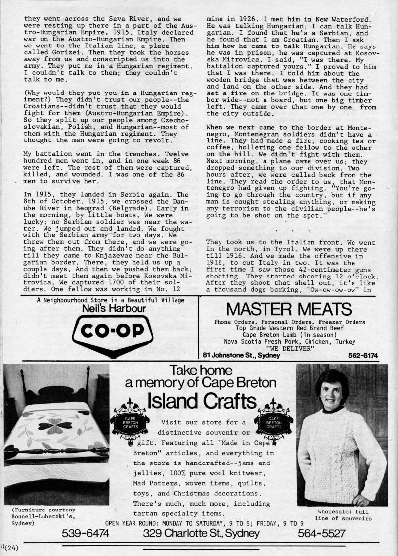 Published by Ronald Caplan on 1983/6/1 (449 reads)they went across the Sava River, and we were resting up there in a part of the Aus? tro-Hungarian Empire. 1915, Italy declared war on the Austro-Hungarian Empire. Then we went to the Italian line, a place called Gorizei. Then they took the horses away from us and conscripted us into the army. They put me in a Hungarian regiment. I couldn't talk to them; they couldn't talk to me. (Why would they put you in a Hungarian reg? iment?) They didn't trust our people--the Croatians--didn't trust that they would fight for them (Austro-Hungarian Empire). So they split up our people among Czecho- slovakian, Polish, and Hungarian--most of them with the Hungarian regiment. They thought the men were going to revolt. My battalion went in the trenches. Twelve hundred men went in, and in one week 86 were left. The rest of them were captured, killed, and wounded. I was one of the 86 men to survive her. In 1915, they landed in Serbia again. The 8th of October, 1915, we crossed the Dan? ube River in Beograd (Belgrade). Early in the morning, by little boats. We were lucky; no Serbian soldier was near the wa? ter. We jumped out and landed. We fought with the Serbian army for two days. We threw them out from there, and we were go? ing after them. They didn't do anything till they came to Knjazevac near the Bul? garian border. There, they held us up a couple days. And then we pushed them back; didn't meet them again before Kosovska Mi- trovica. We captured 1700 of their sol? diers. One fellow was working in No. 12 mine in 1926. I met him in New Waterford. He was talking Hungarian; I can talk Hun? garian. I found that he's a Serbian, and he found that I am Croatian. Then I ask him how he came to talk Hungarian. He says he was in prison, he was captured at Kosov? ska Mitrovica. I.said, "I was there. My battalion captured yours." I proved to him that I was there. I told him about the wooden bridge that was between the city and land on the other side. And they had set a fire on the bridge. It was one tim? ber wide--not a board, but one big timber left. They came over that one by one, from the city outside. When we next came to the border at Monte? negro, Montenegran soldiers didn't have a line. They had made a fire, cooking tea or coffee, hollering one fellow to the other on the hill. We didn't fight with them. Next morning, a plane came over us; they dropped something to our division. Two hours after, we were called back from the line. They read the order to us, that Mon? tenegro had given up fighting. "You're go? ing to go through the country, but if any man is caught stealing anything, or making any terrorism to the civilian people--he's going to be shot on the spot." They took us to the Italian front. We went in the north, in Tyrol. We were up there till 1916. And we made the offensive in 1916, to cut Italy in two. It was the first time I saw those 42-centimeter guns shooting. They started shooting 12 o'clock. After they shoot that shell out, it's like a thousand dogs barking, "Ow-ow-ow-ow" in A Neighbourhood Store in a Beautiful Village Neil's Harbour CO-OP MASTER MEATS Phone Orders, Personal Orders, Freezer Orders Top Grade Western Red Brand Beef Cape Breton Lamb (in season) Nova Scotia Fresh Pork, Chicken, Turkey "WE DELIVER" 81 Johnstone St., Sydney 562-6174 (Furniture courtesy Bonnell-Lubetzki's, Sydney) 539-6474 ''(24) ?? Take home a memory of Cape Breton Island Crafts Visit our store for a distinctive souvenir or ft. Featuring all "Made in Breton" articles, and everything in the store is handcrafted--jams and jellies, 1007o pure wool knitwear. Mad Potters, woven items, quilts, toys, and Christmas decorations. There's much, much more, including tartan specialty items. OPEN YEAR ROUND: MONDAY TO SATURDAY, 9 TO 5; FRIDAY, 9 TO 9 329 Charlotte St., Sydney Wholesale: full line of souvenirs 564-5527