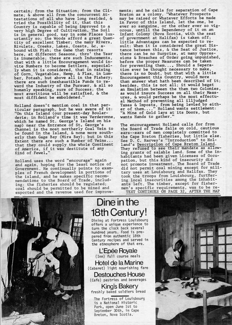 Published by Ronald Caplan on 1983/6/1 (458 reads)certain; from the Situation; from the Cli? mate; & above all from the concurrent At? testations of all who have long resided, & tried the Possibility of it, that this Country is capable of being improved to a very high Degree of Cultivation. The Soil is in general good, nay in some Places lux? uriantly SO; the Woods afford a great Quan? tity of excellent Timber; the many Rivers, Rivulets, Creeks, Lakes, Coasts, 6cc, a- bound with Fish; the Game that resorts here, at different Seasons, thro' the Year is inumerable; these are such Inducements, that with a little Encouragement would in? vite Ntimbers to become Settlers, especial? ly when it is considered, that in raising of Com, Vegetables, Hemp, & Flax, in Lum? ber, Potash, but above all in the Fishery; there are such inexhaustible Funds to re? ward the Industry of the Pursuer, 6e all so humanly speaking, sure of Success; the most avaritious will be satisfied, & the most diffident be emboldened." Holland doesn't mention coal in that par? ticular paragraph, but he was aware of it: "On this Island (our present-day Boular- derie; in Holland's time it was Verderonne, which he named St. George's Island on his map) near the Entrance of St. George's Channel is the most northerly Coal Vein to be found in the Island, & none more south? erly than Gage Bay (Mira Bay); but in this Extent there are such a Number of Veins... that they could supply the whole Continent of America, if it was destitute of any Kind of Fewel," Holland uses the word "encourage" again and again, hoping for the least notice of Government. He continually points to exam? ples of French development in portions of the island, and he makes specific recom? mendations to the Board of Trade, includ? ing: the fisheries should be regulated; coal should be permitted to be mined and exported and the revenue used for improve? ments; and he calls for separation of Cape Breton as a colony. "Whatever Prospects may be raised or Whatever Efforts be made in Favor of this Island, let the one, be ever so sanguine, or the other ever so vig? orous , untill the Dependency of it on an Infant Colony (Nova Scotia, with the seat of government at Halifax) is taken off; little Advantages can be expected to re? sult: When it is considered the great Dis? tance between this, & the Seat of Justice, there can be no Surprize, at many Oppres? sions 6c Breaches of Order going unpunished, before the proper Measures can be taken for preventing them..., Should a Sepera- tion ever be thought necessary to make, there is no Doubt, but that with a little Encouragement this Country, would more than answer what hath been described of it; besides, this is not all; it would beget an Emulation between the then two Colonies, as would insure Success on all their Meas? ures, & would perhaps be the most effectu? al Method of preventing all illjudged Taxes 6e Imposts, from being levied by eith? er of them...." Holland wants settlement: "A Mine of Gold lays at its Doors, but wants Hands to gather." The encouragement Holland calls for from the Board of Trade falls on cold, cautious ears--ears of men completely committed to the Cape Breton fisheries, but little else. See D. C. Harvey's "Introduction" to Hol? land's Description of Cape Breton Island. They refused to see their mandate as allow- ing grants of salable land. Some of the in? habitants had been given Licenses of Occu? pation, but this kind of insecurity did not promote investment. The Board of Trade did not permit coal mining except for mili? tary uses at Louisbourg and Halifax. They took the troops from Louisbourg, further? ing local insecurities among the inhabit? ants left. The timber, except for fisher? men's specific requirements, was to be re- TEXT CONTINUES ON PAGE 32, AFTER THE MAP Dine in the 18th Century! Dining at Fortress Louisbourg offers a unique experience to turn the clock back several hundred years. Food is pre? pared from authentic 18th Century recipes and served in the atmosphere of that era. L'Epee Royale (Inn) full course meals Hotel de la Marine (Cabaret) light nourishing fare Destouches House (Cafe) pastries and beverages King's Bakery freshly baked soldiers bread The Fortress of Louisbourg is a National Historic Park, open June 1st to September 30th, in Cape Breton, Nova Scotia.
