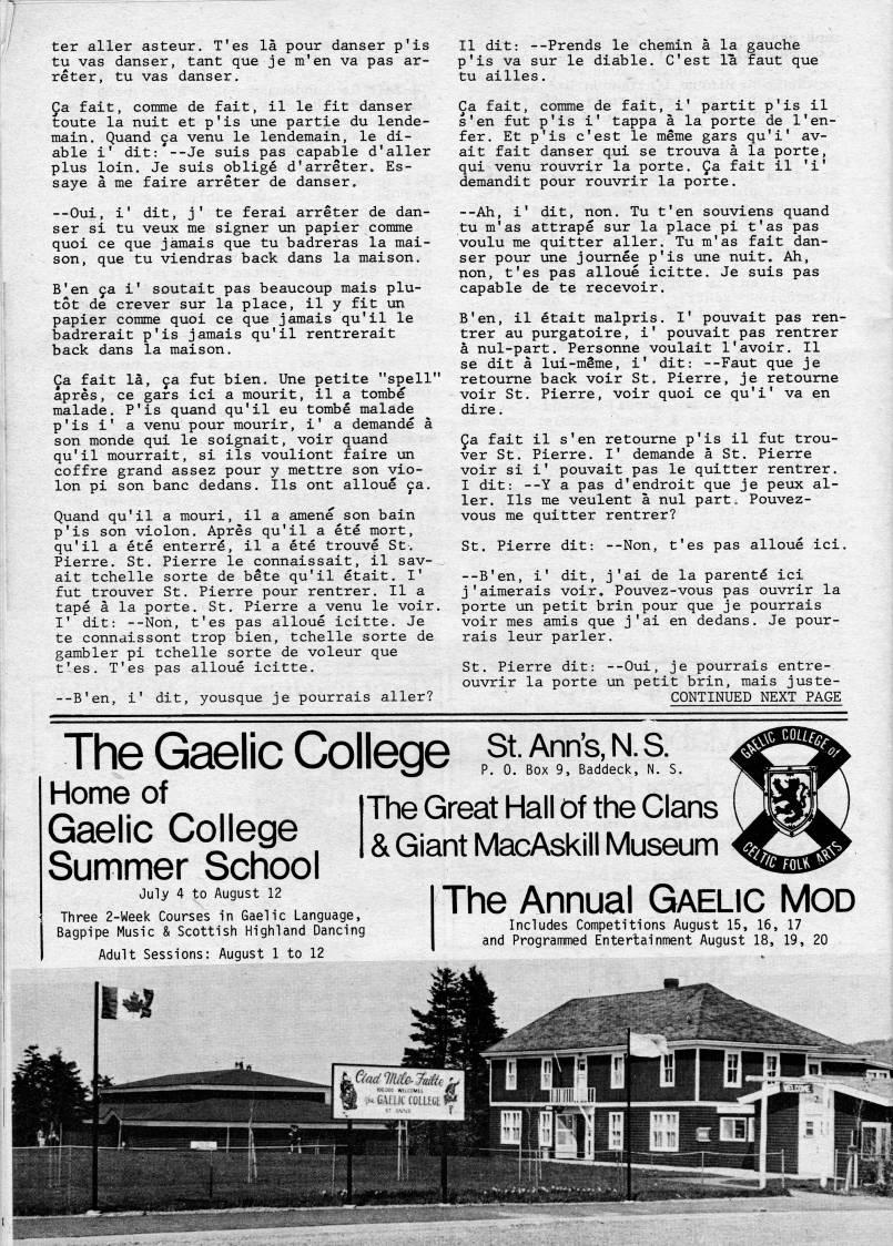 Published by Ronald Caplan on 1983/6/1 (256 reads)ter aller asteur. T'es la pour danser p'is tu vas danser, tant que je m'en va pas ar? reter, tu vas danser. Ca fait, comme de fait, il le fit danser toute la nuit et p'is une partie du lende? main. Quand ca venu le lendemain, le di? able i' dit: --Je suis pas capable d'aller plus loin. Je suis oblige d'arreter. Es? saye a me faire arreter de danser. --Oui, i' dit, j' te ferai arreter de dan? ser si tu veux me signer un papier comme quoi ce que jamais que tu badreras la mai? son, que tu viendras back dans la maison. B'en 9a i' soutait pas beaucoup mais plu- tot de crever sur la place, il y fit un papier comme quoi ce que jamais qu'il le badrerait p'is jamais qu'il rentrerait back dans la maison. Ca fait la, ca fut bien. Une petite "spell" apres, ce gars ici a mourit, il a tomb' malade. P'is quand qu'il eu tombe malade p'is i' a venu pour mourir, i' a demande a son monde qui le soignait, voir quand qu'il mourrait, si ils vouliont faire un coffre grand assez pour y mettre son vio? lon pi son banc dedans. lis ont alloue ca. Quand qu'il a mouri, il a amene son bain p'is son violon. Apres qu'il a ete mort, qu'il a ete enterr', il a ete trouve St. Pierre. St. Pierre le connaissait, il sav- ait tchelle sorte de bete qu'il etait. I' fut trouver St. Pierre pour rentrer. II a tape a la porte. St. Pierre a venu le voir. I' dit: --Non, t'es pas alloue icitte. Je te connaissont trop bien, tchelle sorte de gambler pi tchelle sorte de voleur que t'es. T'es pas alloue icitte. --B'en, i' dit, yousque je pourrais aller? II dit: --Prends le chemin a la gauche p'is va sur le diable. C'est la faut que tu allies. Ca fait, comme de fait, i' partit p'is il s'en fut p'is i' tappa a la porte de I'en- fer. Et p'is c'est le meme gars qu'i' av? ait fait danser qui se trouva a la porte, qui venu rouvrir la porte. Ca fait il 'i' demandit pour rouvrir la porte. --Ah, i' dit, non. Tu t'en souviens quand tu m'as attrape sur la place pi t'as pas voulu me quitter aller. Tu m'as fait dan? ser pour une journee p'is une nuit. Ah, non, t'es pas alloue icitte. Je suis pas capable de te recevoir. B'en, il etait malpris. I' pouvait pas ren? trer au purgatoire, i' pouvait pas rentrer a nul-part. Personne voulait 1'avoir. II se dit a lui-mSme, i' dit: --Faut que je retourne back voir St. Pierre, je retoume voir St. Pierre, voir quoi ce qu'i' va en dire. 'a fait il s'en retourne p'is il fut trou? ver St. Pierre. I' demande a St. Pierre voir si i' pouvait pas le quitter rentrer. I dit: --Y a pas d'endroit que je peux al? ler. lis me veulent a nul part • Pouvez- vous me quitter rentrer? St. Pierre dit: --Non, t'es pas alloue ici. --B'en, i' dit, j'ai de la parent' ici j'aimerais voir, Pouvez-vous pas ouvrir la porte un petit brin pour que je pourrais voir mes amis que j'ai en dedans. Je pour? rais leur parler. St. Pierre dit: --Oui, je pourrais entre- ouvrir la porte un petit brin, mais juste- CONTINUED NEXT PAGE The Gaelic College st,Anrfs,N.s, Home of Gaelic College Summer School July 4 to August 12 Three 2-Week Courses in Gaelic Language, Bagpipe Music & Scottish Highland Dancing Adult Sessions: August 1 to 12 The Great Hall of the Clans & Giant MacAskill Museum The Annual Gaelic Mod Includes Competitions August 15, 16, 17 and Programmed Entertainment August 18, 19, 20 1' fM'7Me'7m{'f