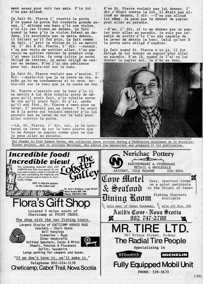 Published by Ronald Caplan on 1983/6/1 (264 reads)ment assez pour voir tes amis. P'is toi t'es pas alloue. Ca fait St. Pierre i' rouvrit la porte p'is quand la porte fut rouverte grande as? sez, i' attrape son banc p'is son violon, p'is ils les tirent en dedans. Ca fait quand le banc p'is le violon furent en de? dans, ils pouvionts pas le mette dehors, il fallait qu'il fut pris. Ca fait comme de fait, i' prit le violon pi il se mettit la. I' dit a St. Pierre, i' dit: --Asteur, t'as pas voulu me quitter aller, t'as pas voulu me quitter rentrer le premier coup j'ai venu icitte. Ce coup icitte je serai oblige de rentrer, je serai oblige de res- ter en dedans. B'en j'ai une penitence pour toi. Assis-toi sur le banc. 'a fait St. Pierre voulait pas s'assire. I' dit: --Assis-toi que je te conte ma vie. A- pres ca tu me condamneras si tu veux. As? sis-toi sur le banc que je te conte ma vie. St. Pierre s'assisit sur le banc p'is il se mettit a lui dire tchelle sorte de ne- goce qu'il avait fait, p'is tchelle sorte de vie qu'il avait fait. Et p'is, apres qu'il eut fini, St. Pierre a venu pour se lever. I' pouvait pas se lever. Y en avait un a la porte qui voulait rentrer p'is lui pouvait pas se lever de sur le bain pour aller rouvrir la porte. --La, St. Pierre, i' dit, oui, je te quit- terai te lever de sur le banc pourvu que tu me donnes un papier comme quoi ce que je peux aller au paradis. B'en St. Pierre voulait pas lui donner. I' dit c'etait centre la loi, il etait pas al- lou' en dedans. I dit: --T'es pas alloue ici meme. Je peux pas te donner de papier pour aller au paradis. --B'en, i' dit, si tu me donnes pas un pap? ier pour aller au paradis, je suis pas ca? pable de sortir p'is t'es pas capable de te lever de dessus le banc. Celui qu'est a la porte sera oblige d'esperer. Ca fait quand St, Pierre a vu ca, il fut oblige de lui donner un papier''pour aller au paradis. B'en la, quand je I'ai vu lui donner le papier moi, je m'en es venu. Our thanks to Lois Samson Burns, who collected these stories during a Federation Acadienne de la Nouvelle- Ecosse project, and to Jocelyne Marchand, who edited the manuscript and prepared it for publication. Incredible food! Jncredible view! 7t(| This outstanding restaurant offers LIVE 4 'I LOBSTER from their own pound. Or y ''s'-'f. may want to enjoy a steal< or chowder ySs*Ti/ the deck overlooking the Highlands J 1M inute walk to historic St. Ann' SOUTH HAVEN i??''' St. Ann's Harbour, Cape Breton Nova Scotia BOE IBO Phone (902)295-3100 Flora's Gift Shop Located 2 miles south of Cheticamp at POINT CROSS. The shop with the two fishing boats. Largest Display of CHETICAMP HOOKED RUGS Coasters - Chair Seats Wall Hangings Sceneries - Rugs Other Handcrafts Knitted Sweaters, Socks & Mitts j Shawls, Ponchos & Placemats Quilts, Souvenirs Large parking for campers and buses. "If we don't have it, we'll make it." Telephone 902-224'3139 Cheticamp, Cabot Trail, Nova Scotia ??'-' Nerichac Pottery M'# EARTHENWARE & STONEWARE N'.' RETAIL & WHOLESALE ARICHAT, ISLE MADAME 226-3004 Sc Btntaah Cosy, spacious rooms on a quiet peninsula in the Strait of Canso Fishing Charters Available ' 1 3 /, mile west of Canso Causeway, /, mile off Rte. 104 Kulh'B (doup - Nnua 'rotia ' 3D2 747-2Zaa ' MR. TIRE LTD. 267 Prince Street, Sydney The Radial Tire People Specialising in Fully Equipped Mobil Unit PHONE: 539-5670 (39)